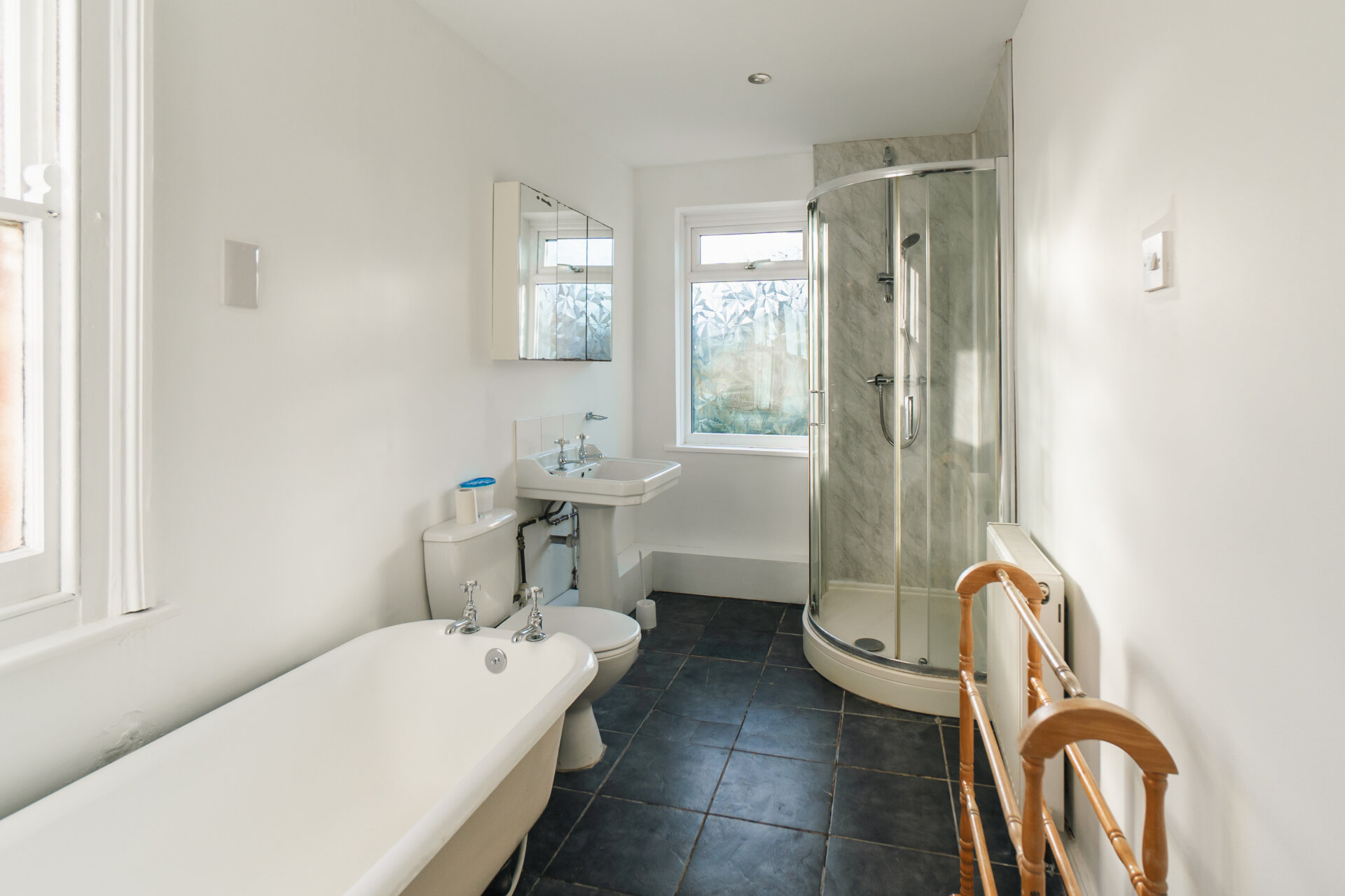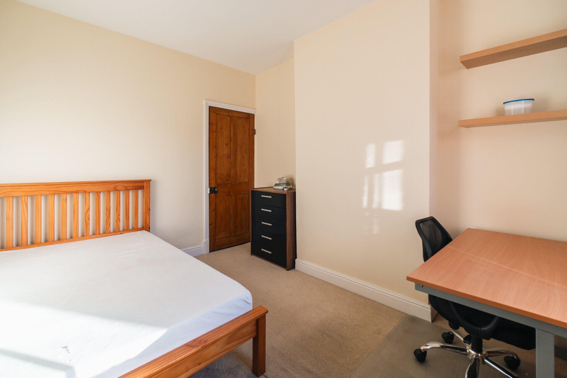 Upstairs, the property features two generous bedrooms. The main bedroom is a comfortable double, offering plenty of room for bedroom furniture and storage. The second bedroom is also a double, with storage cupboard. Both bedrooms are presented in a neutral style, ready for you to add your personal touch.