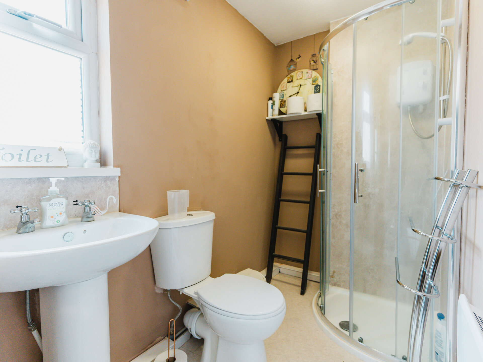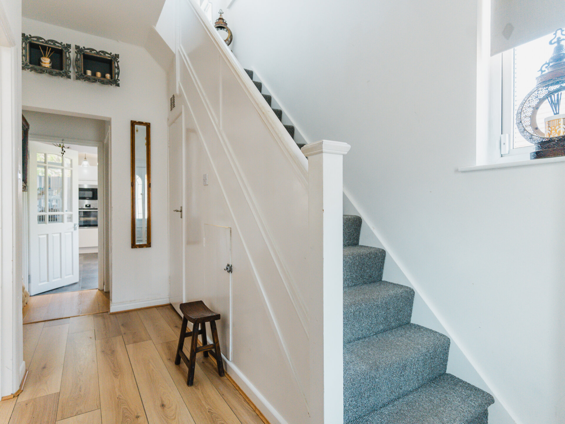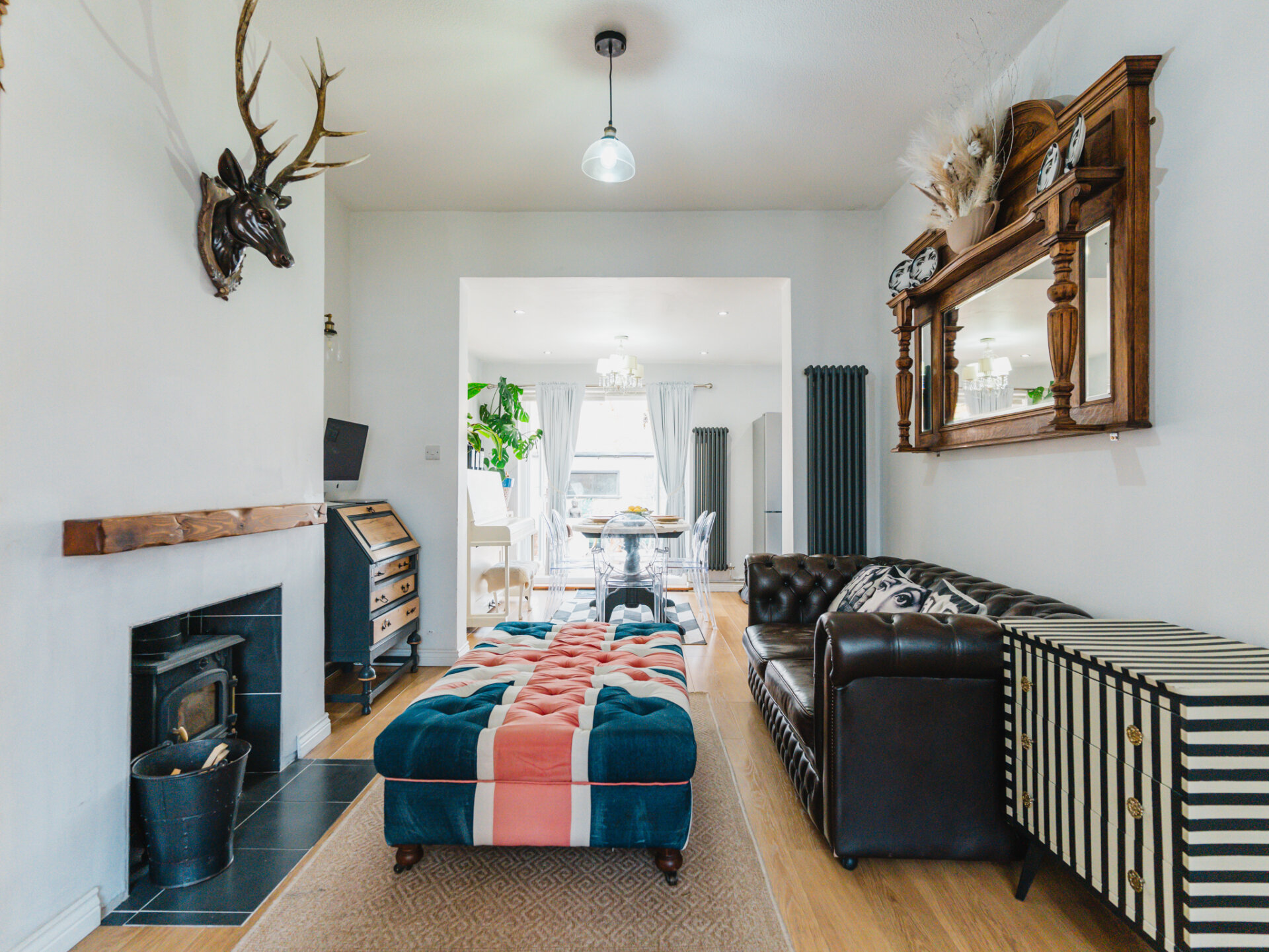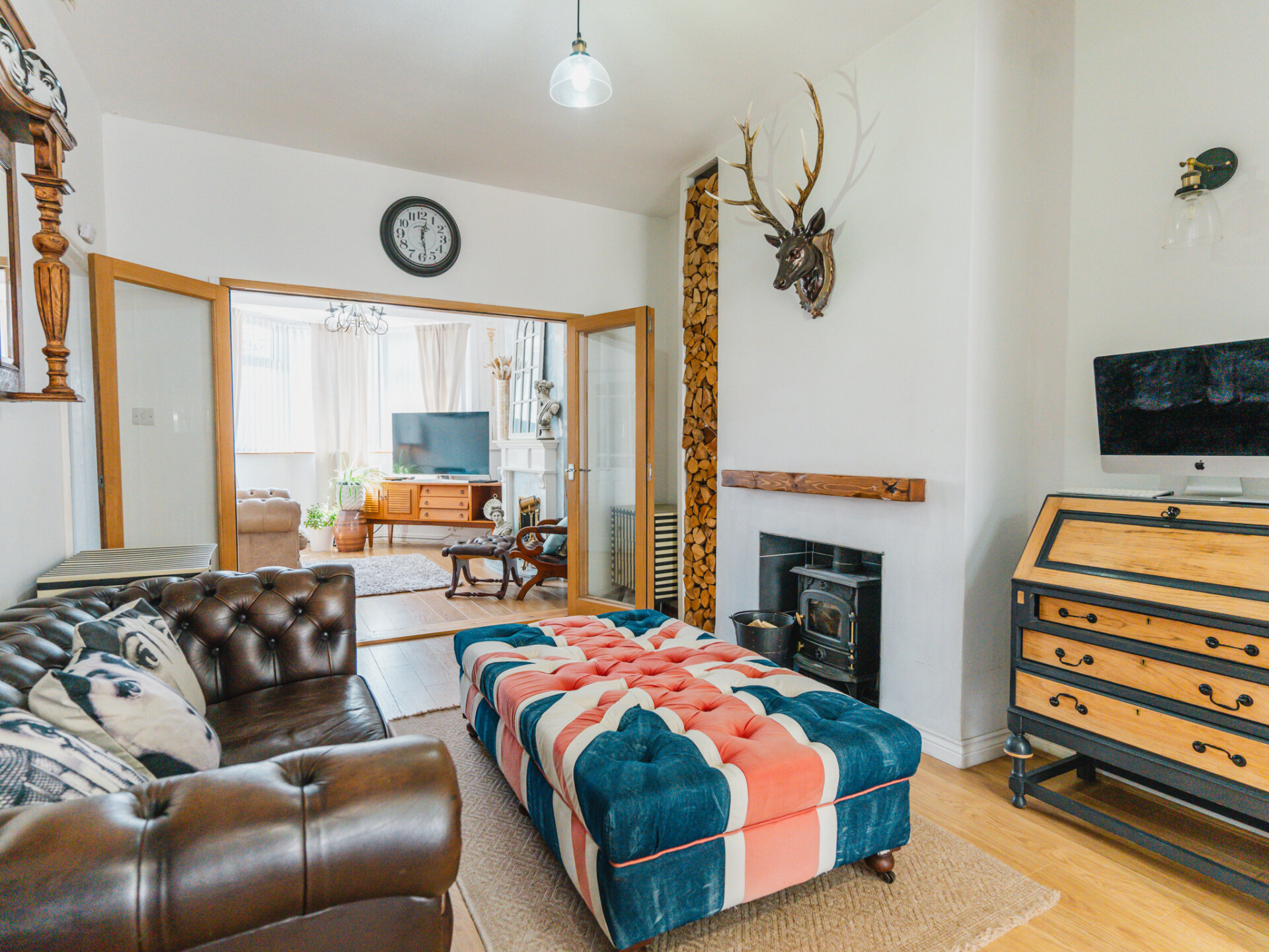 Entry is through an entrance porch that opens to a deceptively spacious entrance hall complemented with oak-flooring providing dual access to both the living quarters and extended breakfast kitchen. To the front of the house, a principal reception room complete with a large double glazed bay-window to the front aspect and a feature gas-fireplace with marble hearth and surround to the centre, the space is both bright and airy and follows a neutral colour palette throughout. With double oak-framed doors to a second reception room, a newly added log-burner feature fireplace is positioned to the centre making an excellent focal point. The room offers an open-aspect with the breakfast dining kitchen positioned to the rear of the space. With immense attention to detail. the kitchen is well equipped for entertainment with sufficient eye-wall level base units, double-oven and integrated dishwasher with a five ring gas-cylinder hob with a concealed extractor hood with space for all necessary free-standing appliances. The open plan kitchen-dining room offers uPVC double glazed French doors that provide pleasant views and convenient access to the impeccably landscaped rear-garden. A downstairs semi-flush w/c and modern rainfall shower set-up completes the downstairs accommodation.