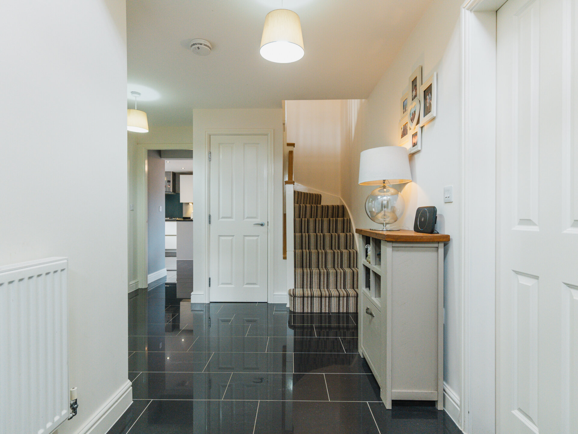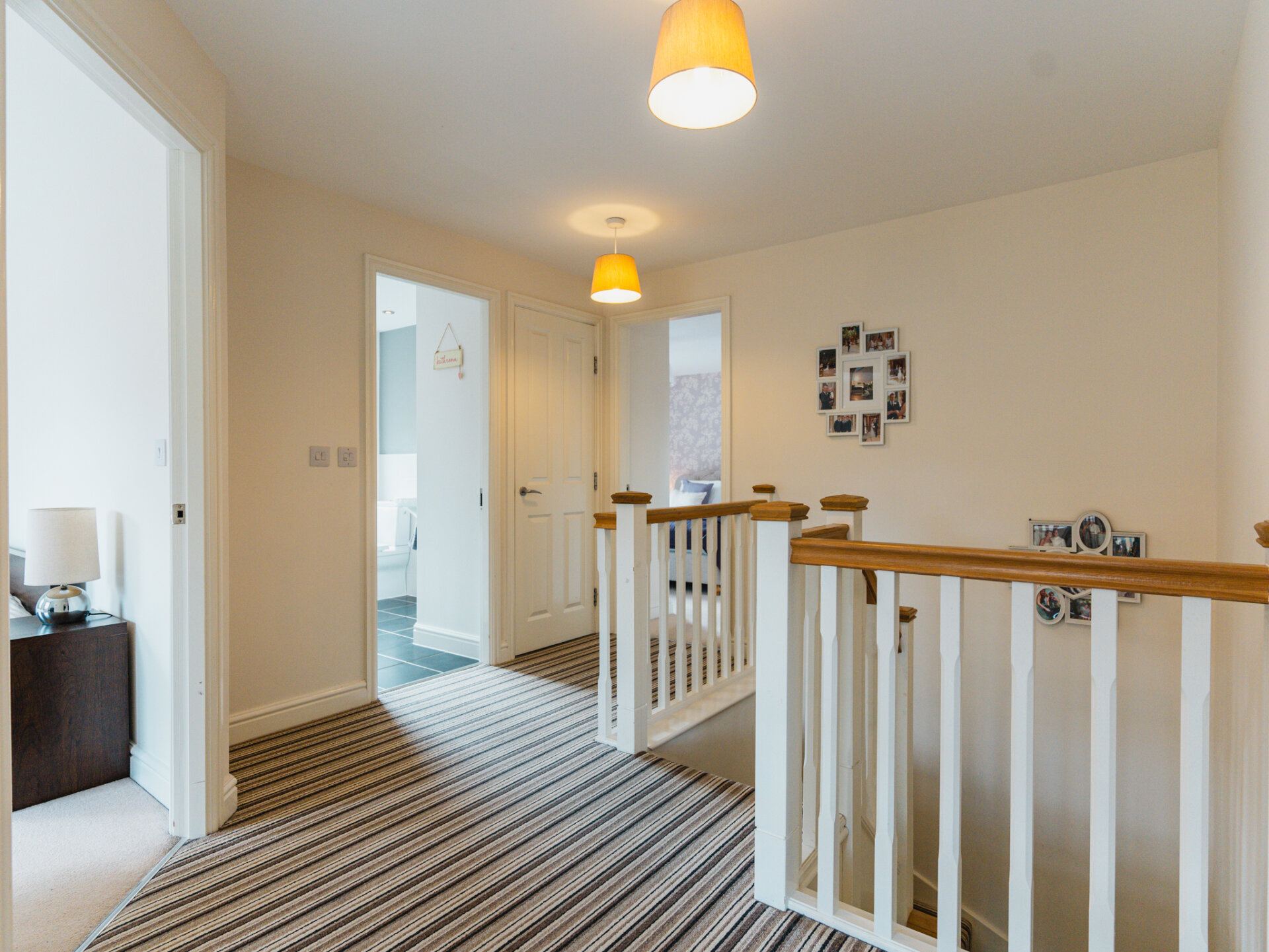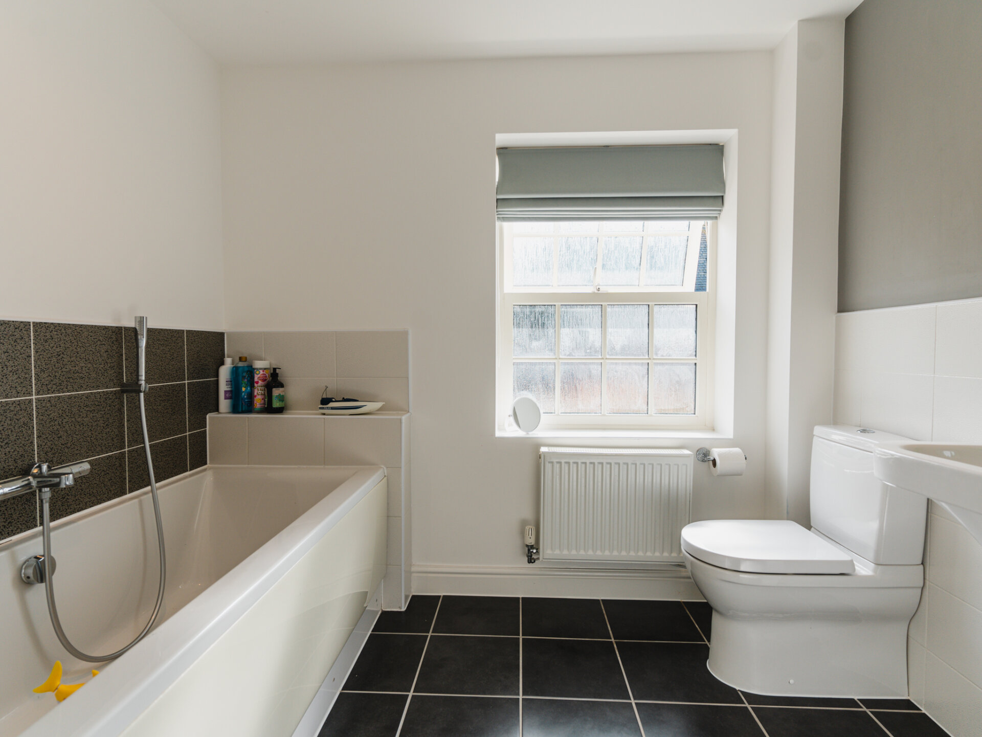 Serving bedrooms two, three, and four, the family bathroom is a haven of relaxation and rejuvenation. Featuring a modern four-piece suite including a panelled bath, shower enclosure, pedestal basin, and WC, this tastefully appointed space combines functionality with luxury to meet the needs of every member of the household.