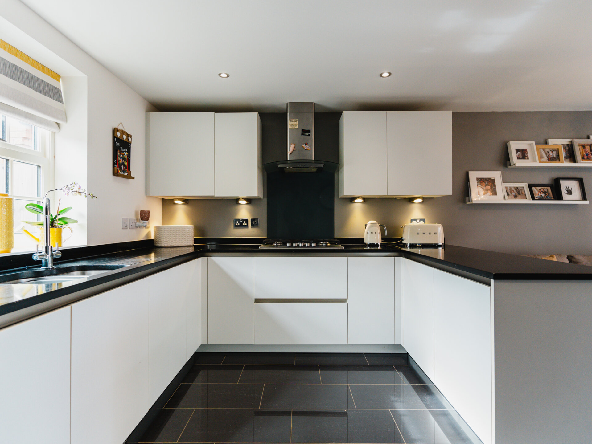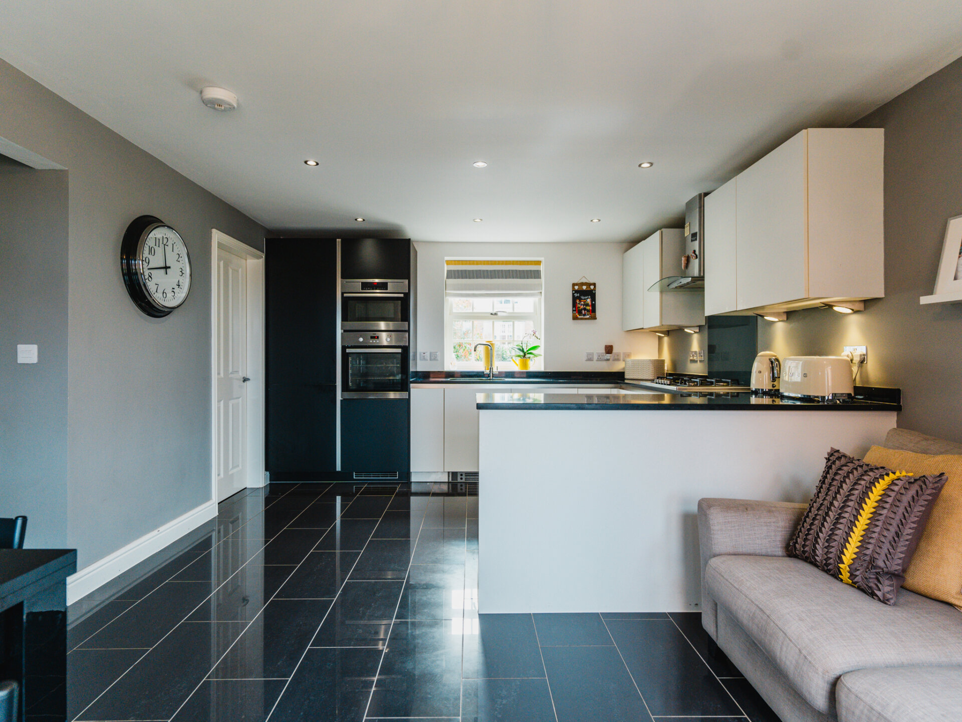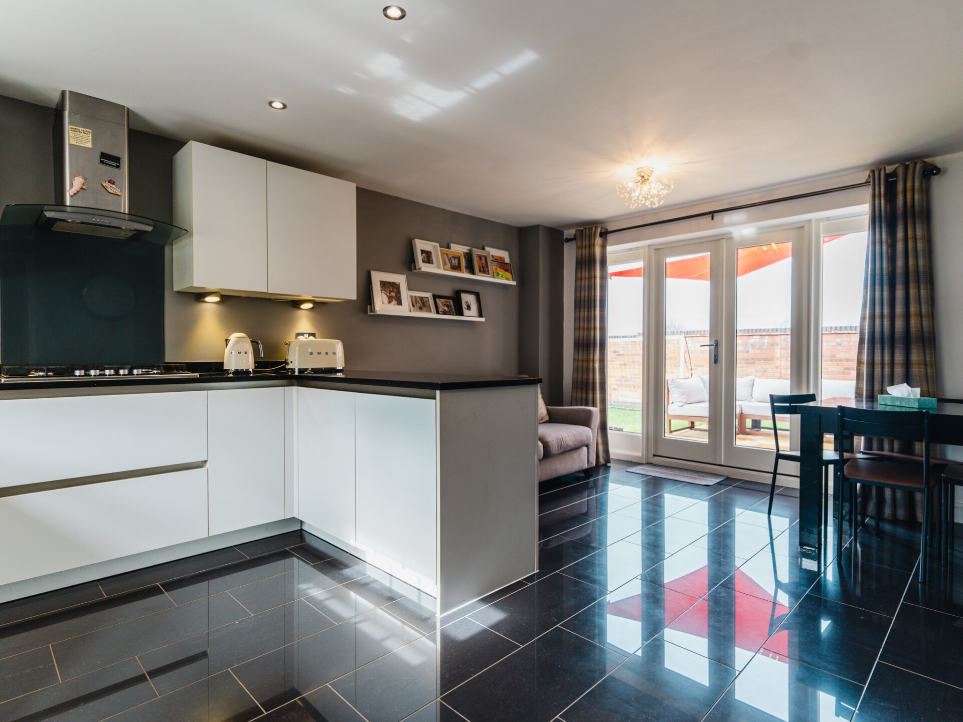 Tucked away at the rear of the home, the kitchen dining room is a culinary enthusiast's dream come true. Immaculately designed, the kitchen boasts elegant, fitted units in contemporary white, perfectly complemented by striking black quartz worktops and tiled floors. Fitted appliances ensure functionality and convenience, while the dining area, bathed in natural light pouring in through French doors leading to the rear garden, provides a delightful space for family meals and entertaining. With ample room for a six-seat dining table, this area serves as the perfect hub for everyday living and social gatherings alike.