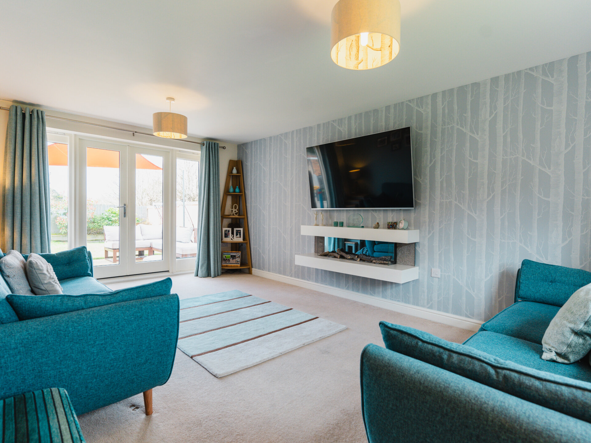To the right of the entrance hall, double doors swing open to reveal the spacious living room, a haven of comfort and relaxation. Flooded with natural light streaming in from the front aspect window and glazed French doors leading to the rear garden, this room feels bright and inviting throughout the day. The centrepiece of the room is a contemporary electric fireplace, creating a warm and welcoming atmosphere ideal for cosy evenings with loved ones.