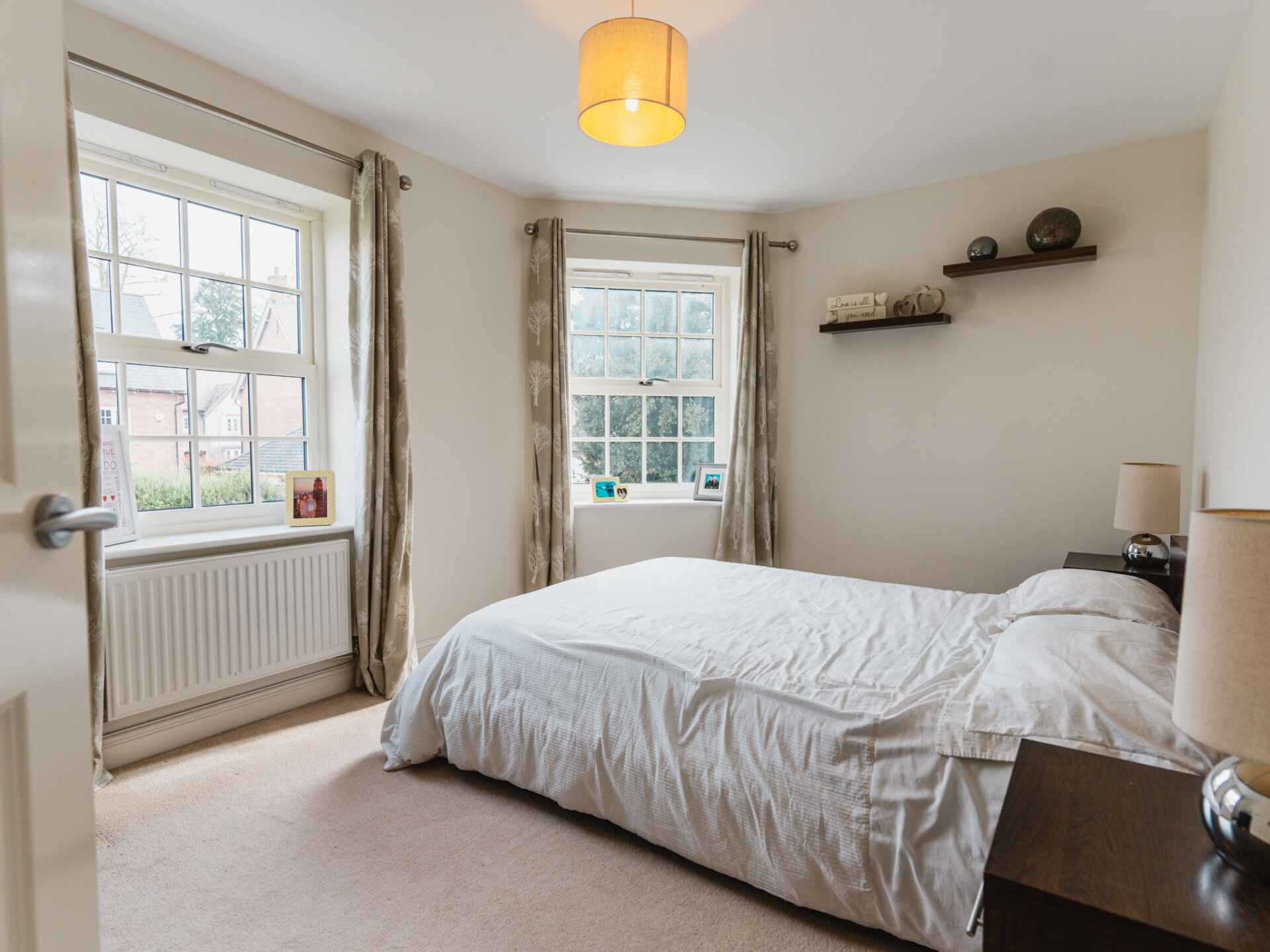 Adjacent to the main bedroom, you'll find another spacious double bedroom boasting the same unique shape as the dining room below. With two windows offering views of the front aspect, this room bathes in natural light, creating a serene and inviting ambiance perfect for guests or family members seeking comfort and relaxation.