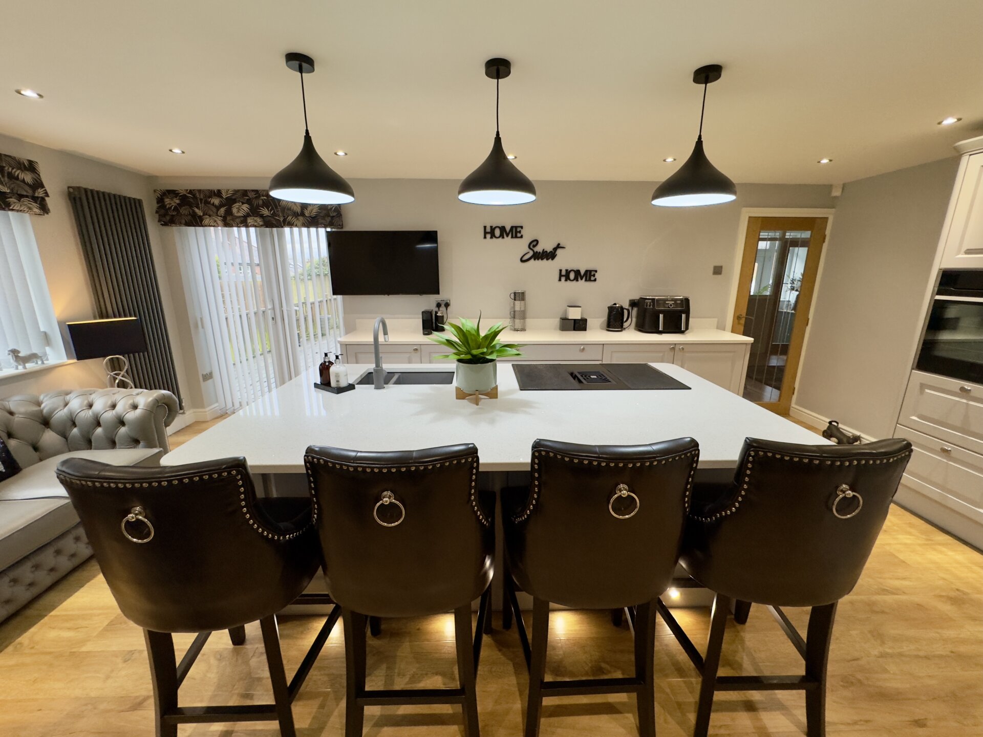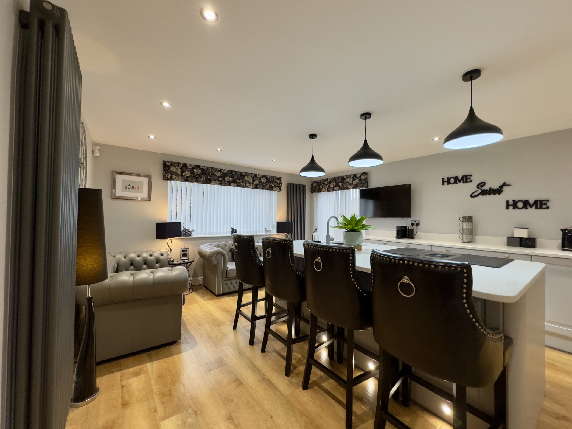 The main hub of the home is the fantastic kitchen diner. Fitted with range of wall, base and drawer units with granite work surface over. Not forgetting the main focal point of the room… the central island which has an inset sink unit along with a venting induction hob. Further appliances in this room to include dishwasher and double oven. An ideal space for hosting family gatherings or entertaining guests. With ample counter top space, high end appliances and sleek finishes, this kitchen is a true chef's delight. A great addition to the kitchen diner is a separate utility room, again offering further storage space, a single drainer sink unit as well as an integrated fridge and freezer.