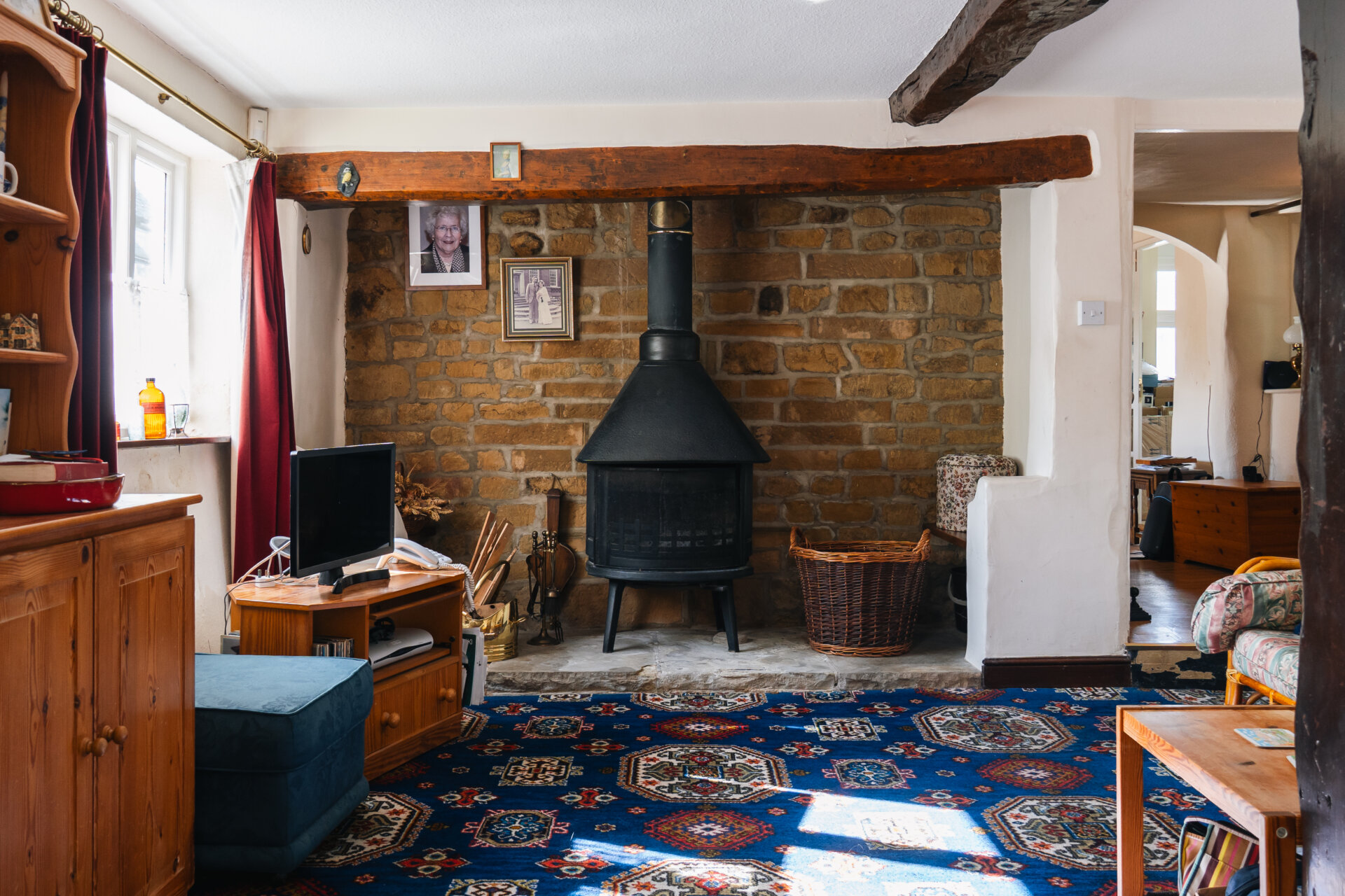 The front door opens into an entrance hall with the dining room to the left. Most rooms have solid floors except the carpeted sitting room. The dining room connects through to a sun room via double glass doors and features a fireplace suitable for an electric fire. Both the dining room and lounge have fireplaces — the lounge includes an inglenook with a Jøtul wood burner, stone hearth, and built-in seating.