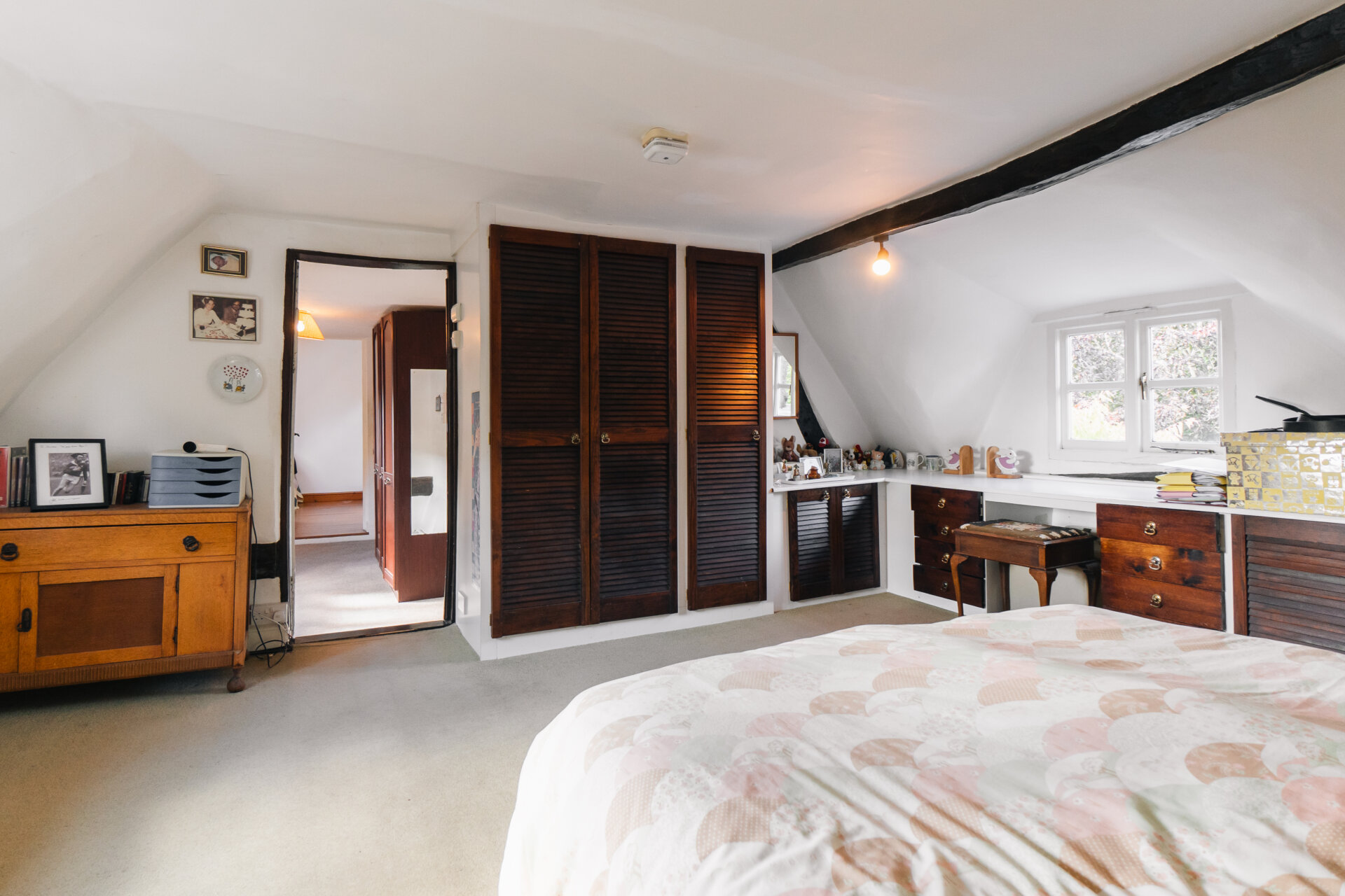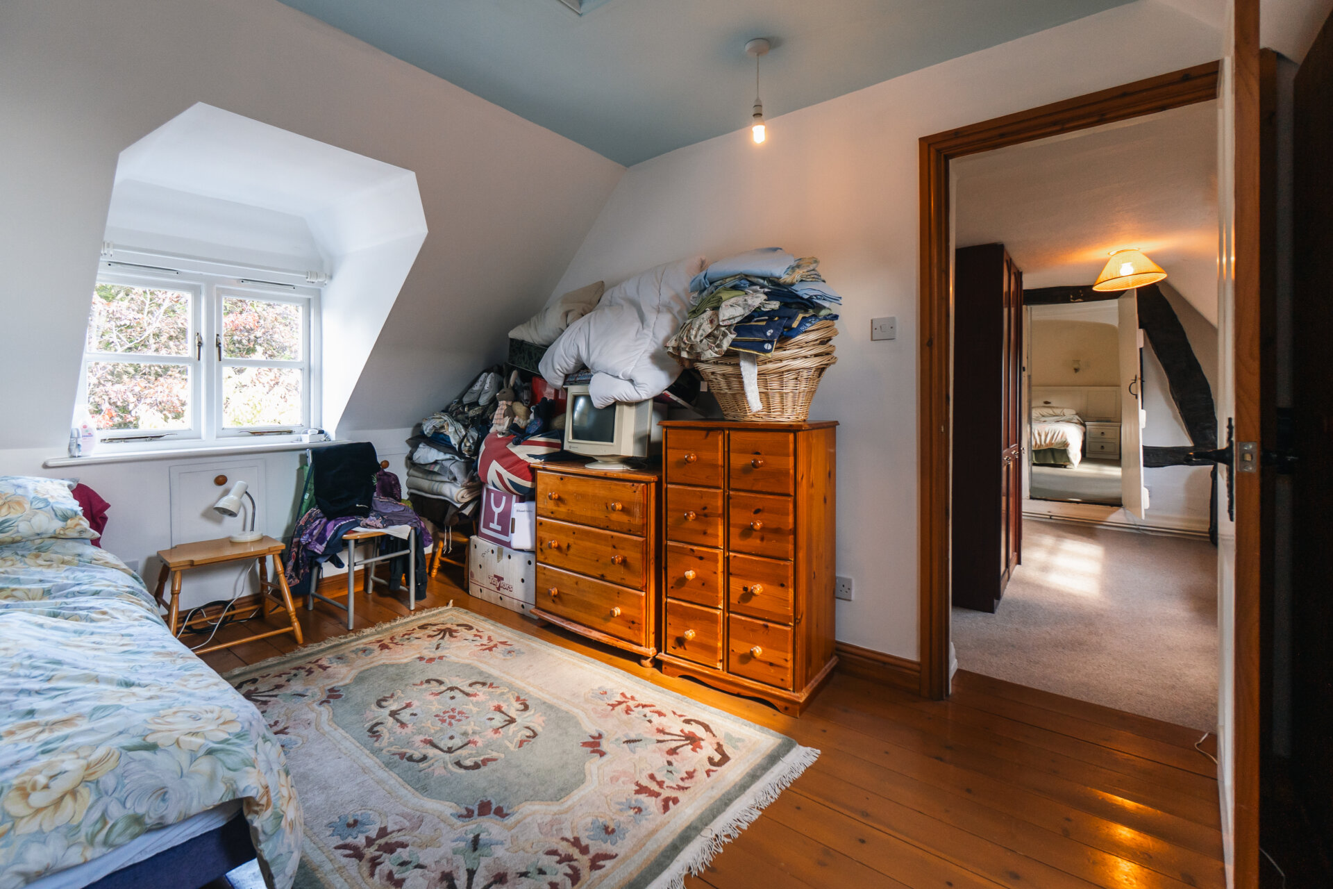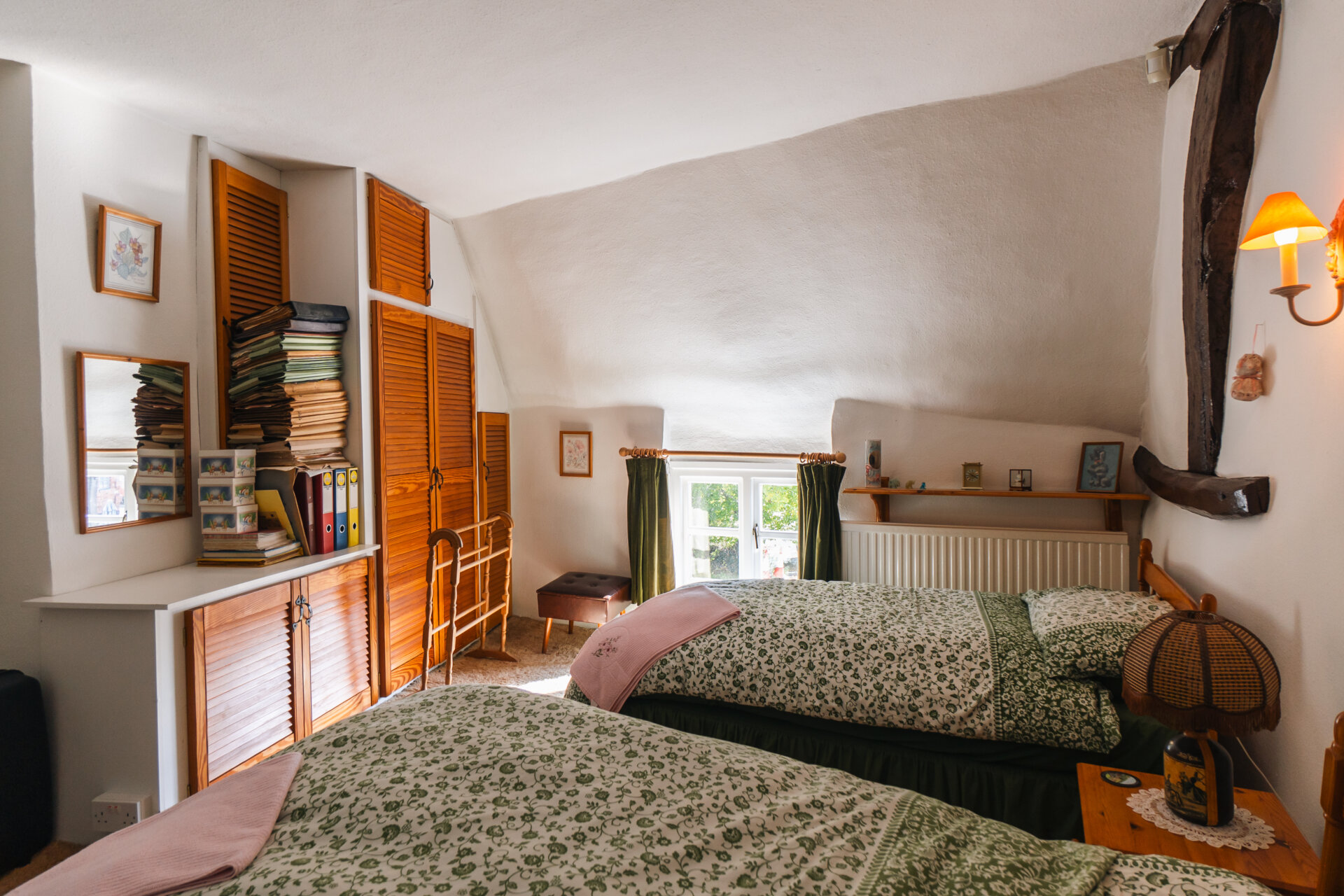 The house retains its period character with wrought iron latches and hinges, whitewashed walls, and exposed blackened beams. Three separate staircases — preserved from the original cottages — lead to four double bedrooms upstairs.