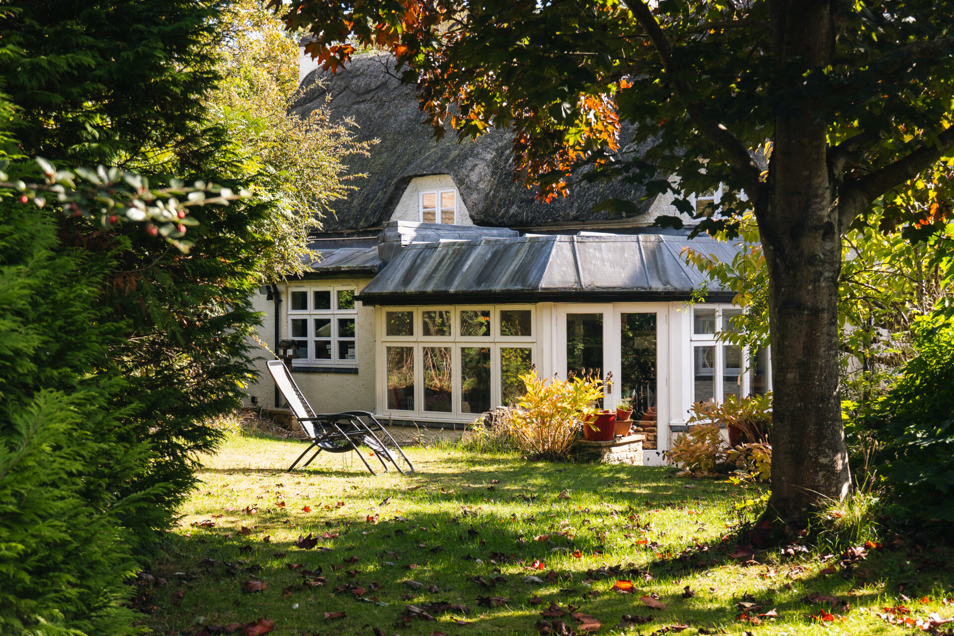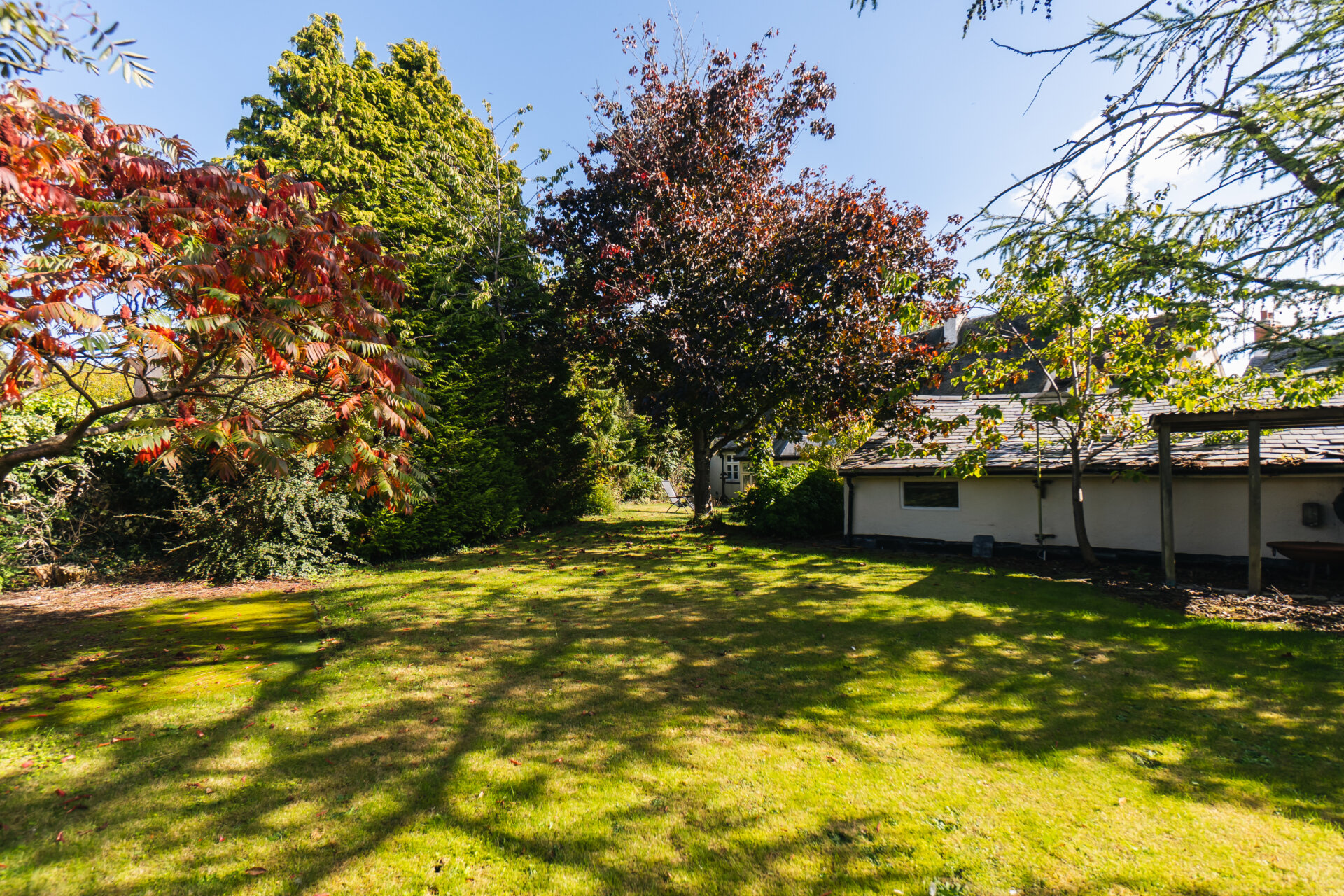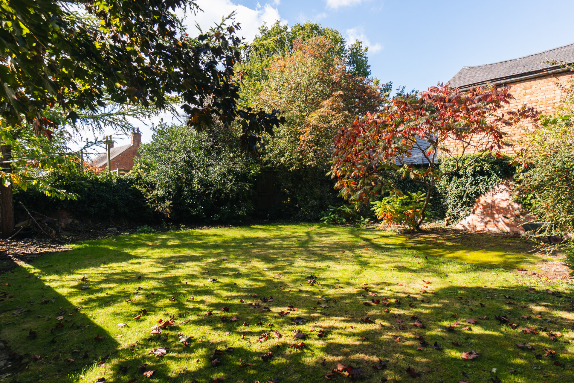 A gated driveway leads to a detached double garage. The rear garden is private and secluded, with a lawn, mature trees, a well feature, and cottage-style planting. A patio runs across the back of the property, providing a perfect spot to enjoy the surroundings.