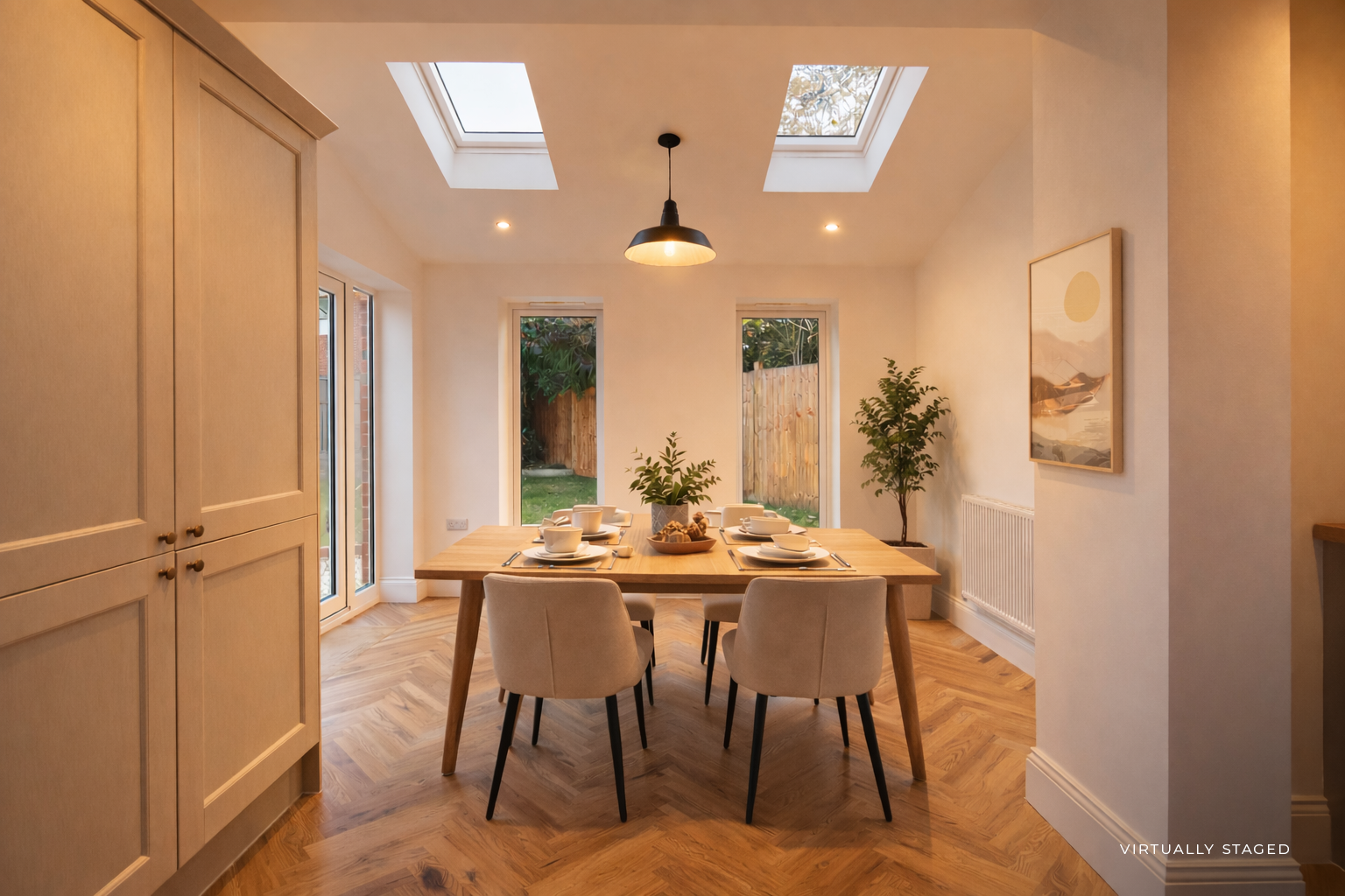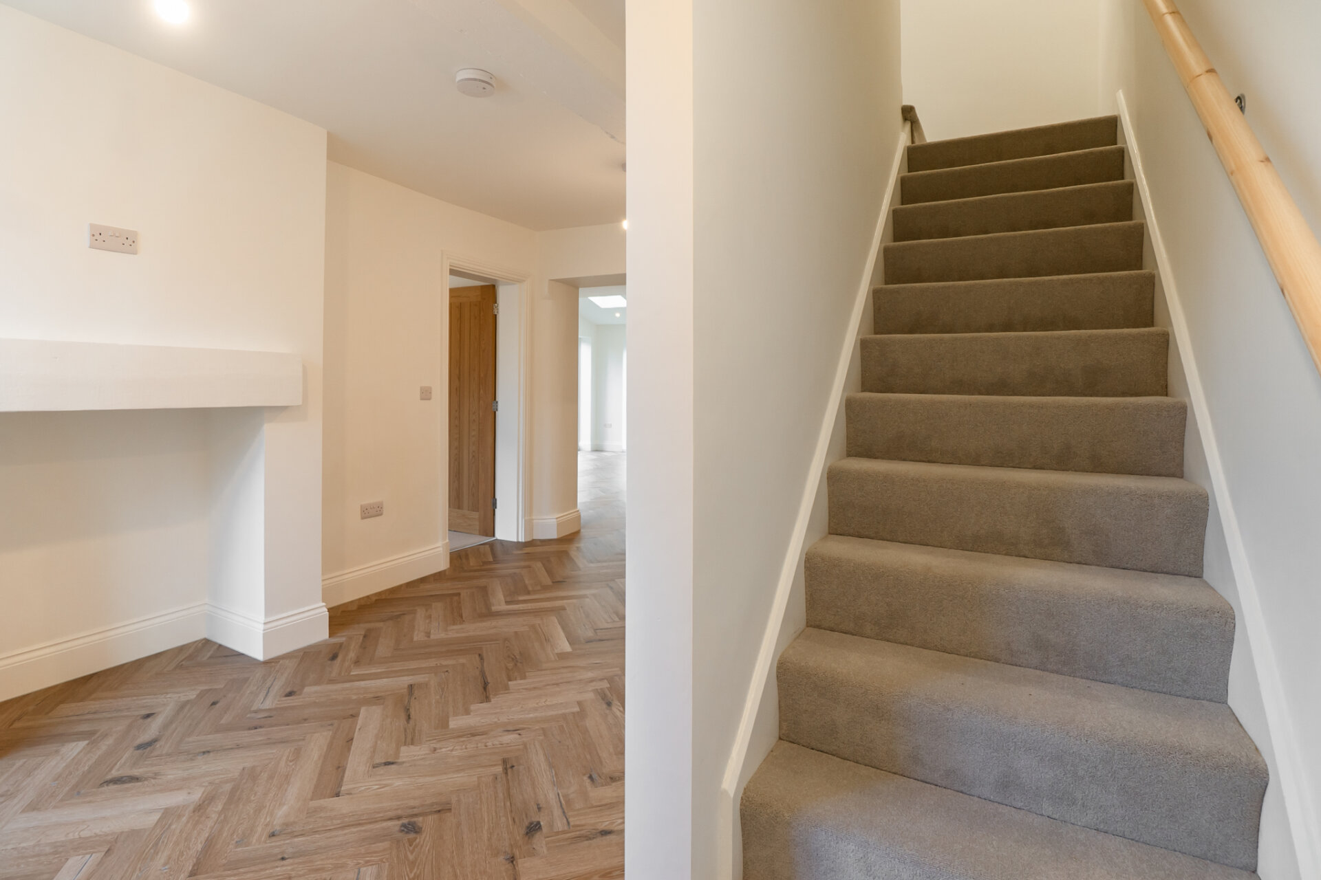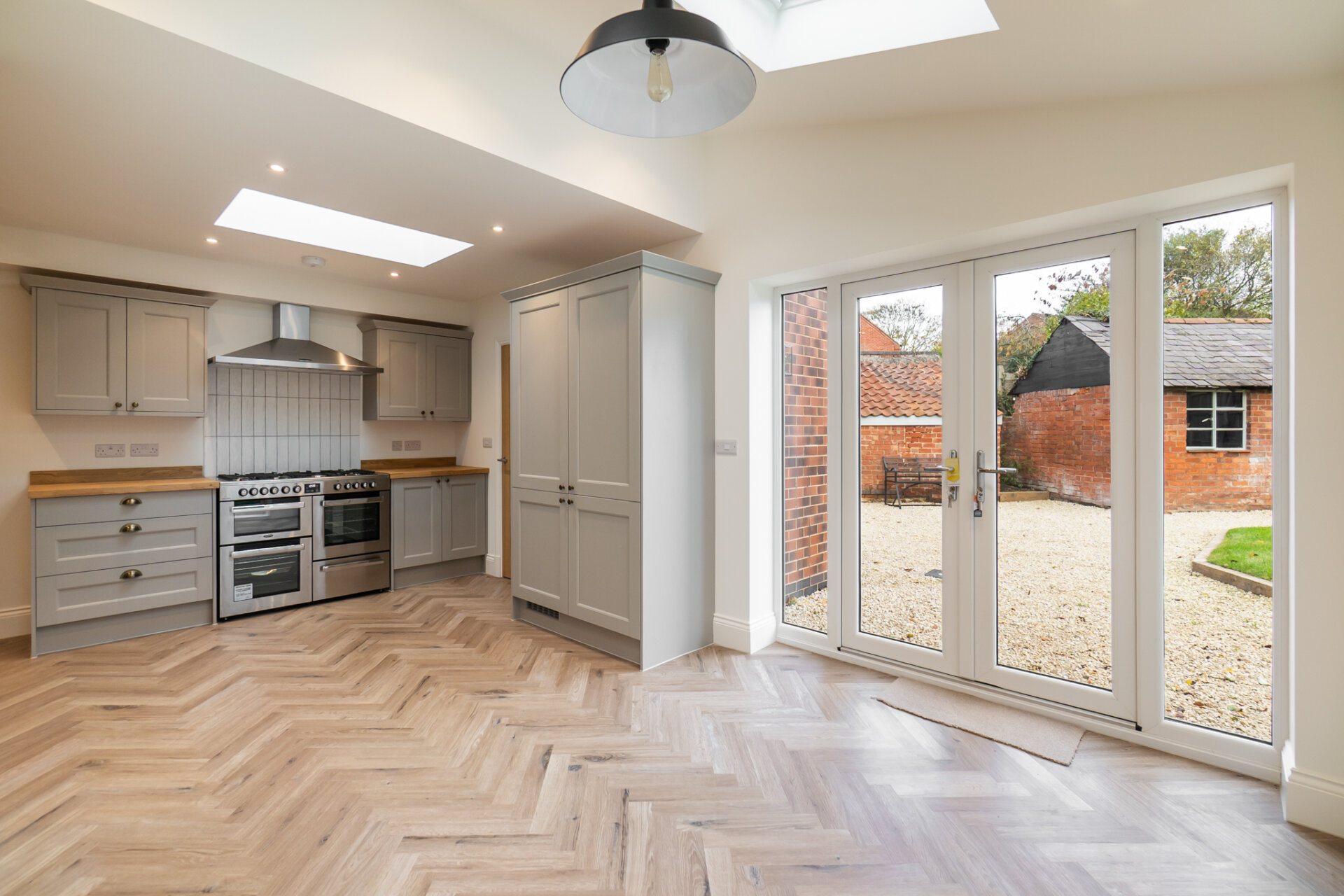Entering via the side entrance, you’re welcomed into a vaulted boot room with bespoke coat and shoe storage. The heart of the home is the impressive open plan kitchen and dining space, where a large rear extension floods the room with natural light.