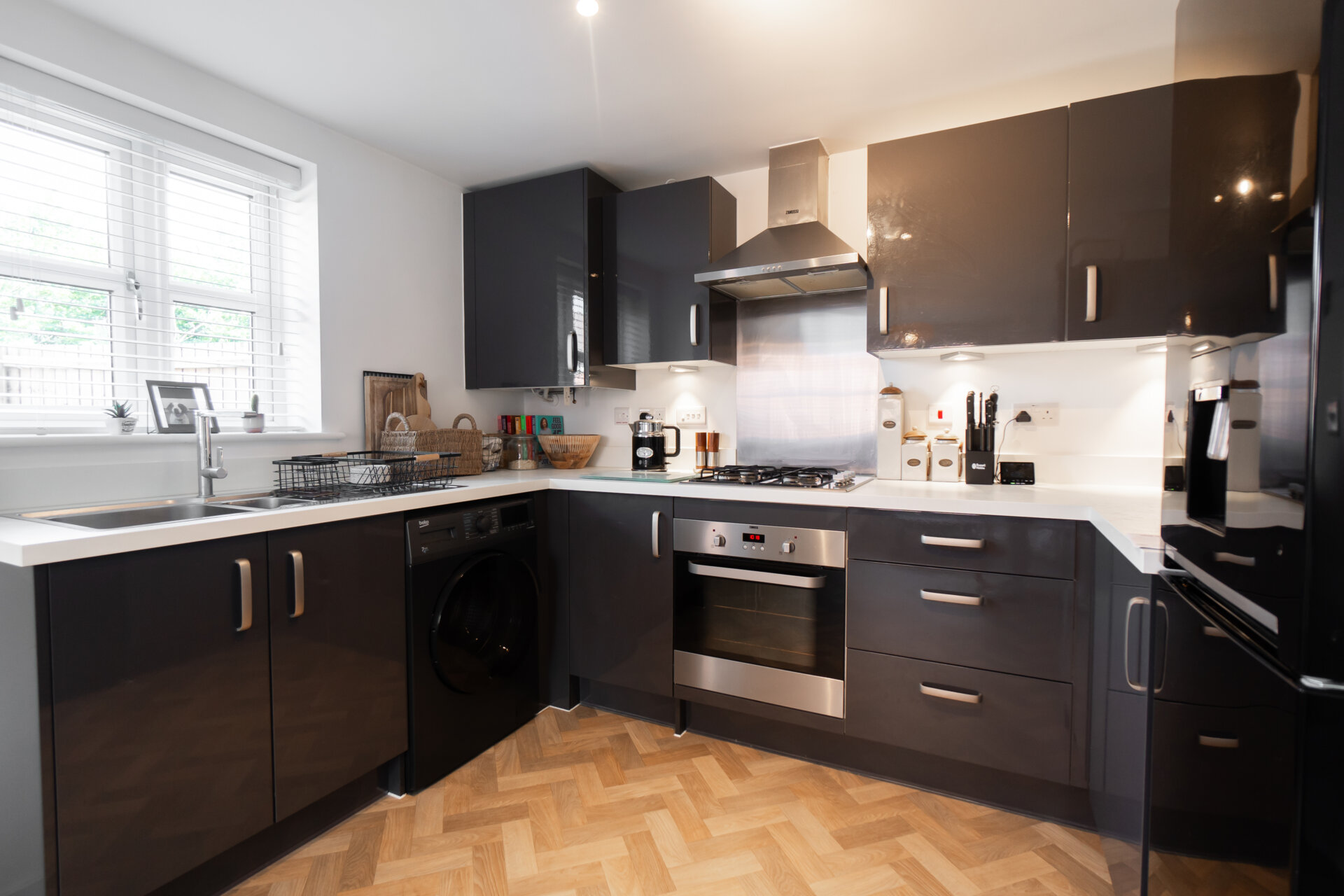 The open-plan living kitchen is equipped with a variety of wall and base units, a gas hob with an extractor fan, an oven, space for a fridge and freezer, and plumbing for a washing machine. The space is bright and airy yet maintains a cosy feel. The stylish bathroom includes a three-piece suite: a low-level WC, a wash hand basin, and a bath with a shower overhead.