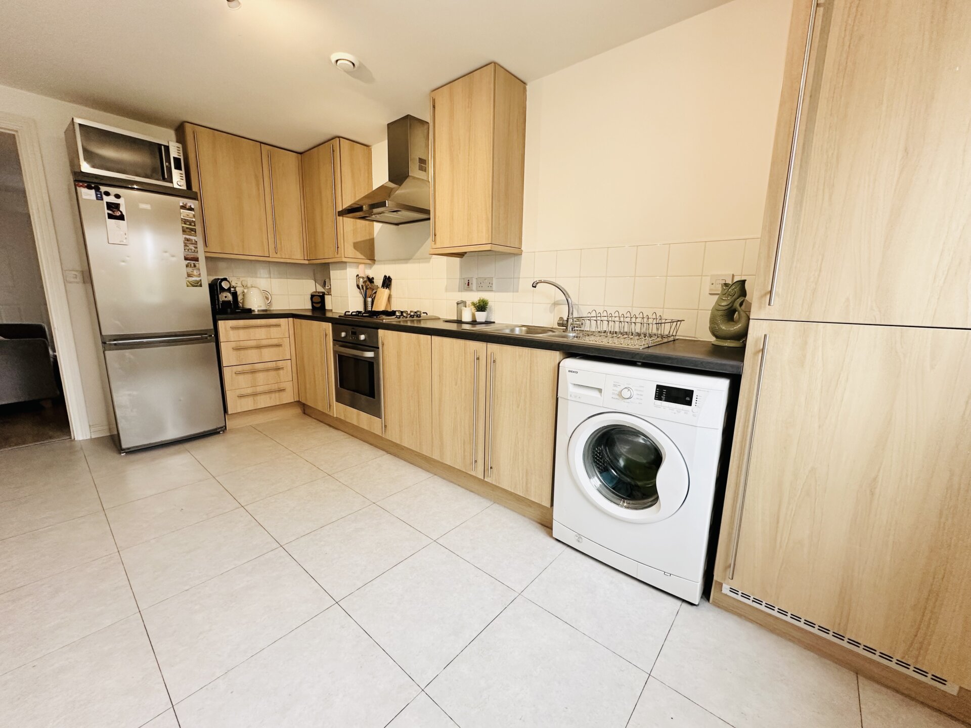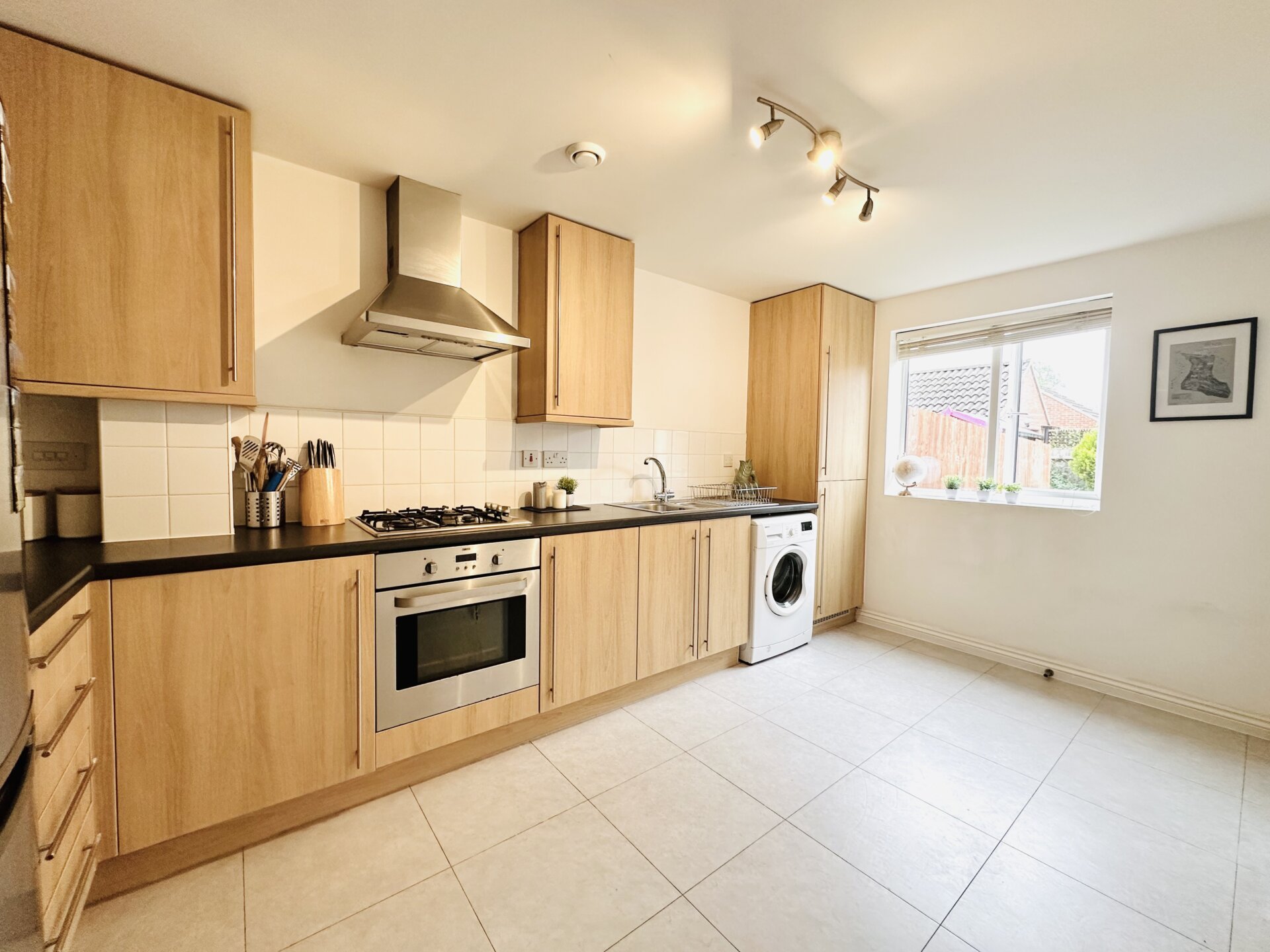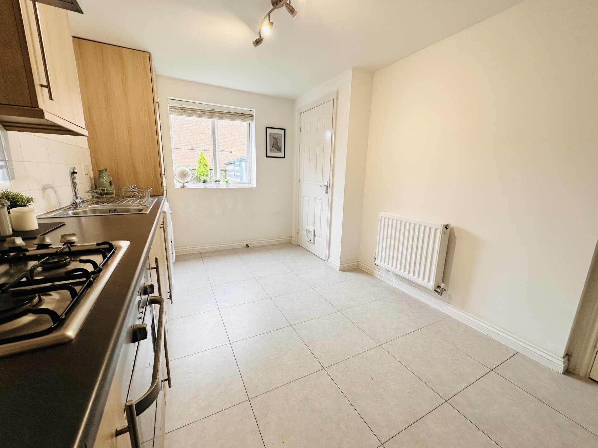 Continuing through to the modern dining kitchen which is fully equipped with a built-in oven with hob and extractor fan over, stainless steel sink with drainer and two spaces allowing for a washing machine and fridge freezer. In addition, there is a good-sized storage cupboard. Natural light floods the space through the rear aspect window. The rear lobby gives direct access to the garden. There is also a conveniently placed downstairs WC.