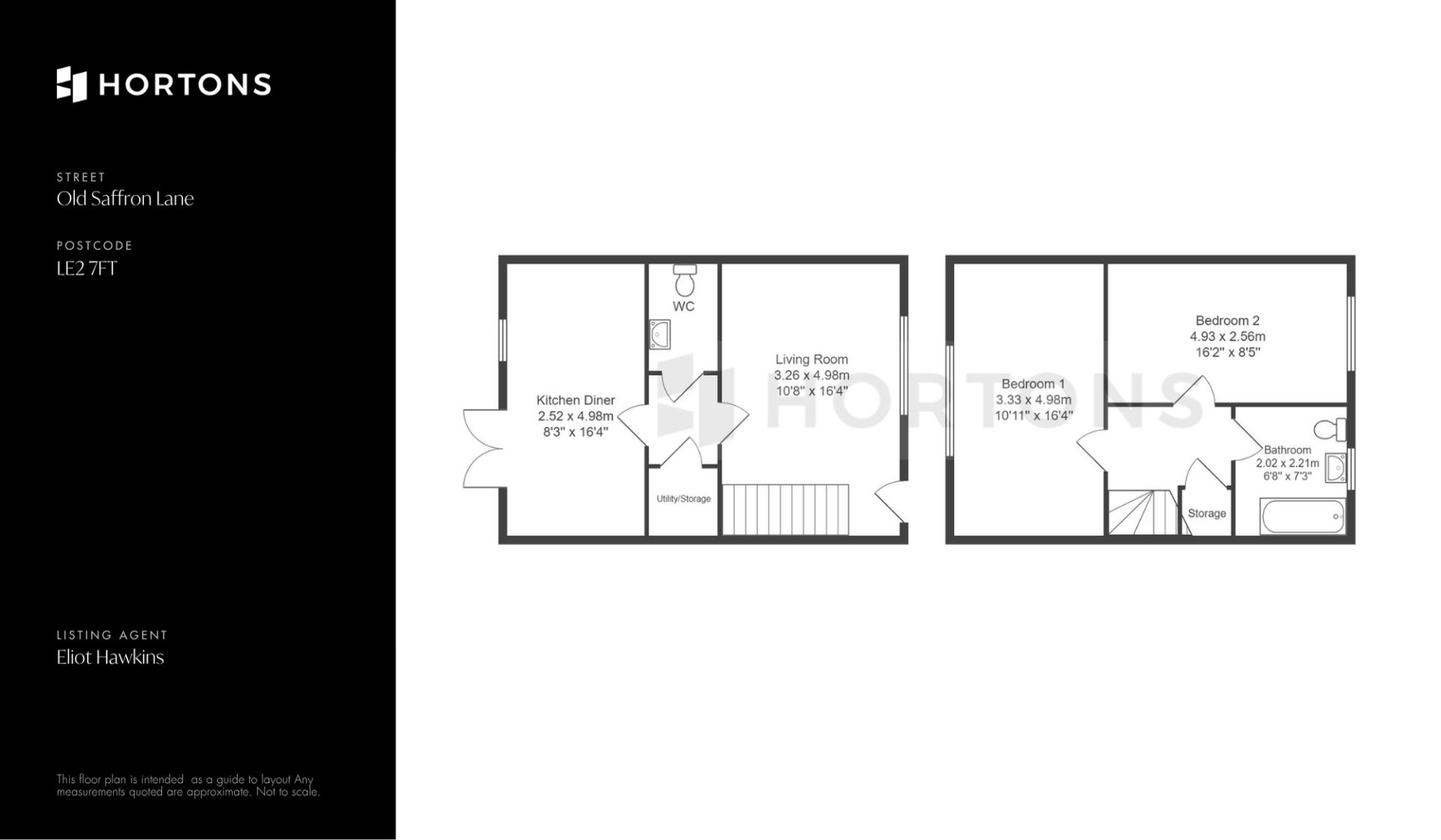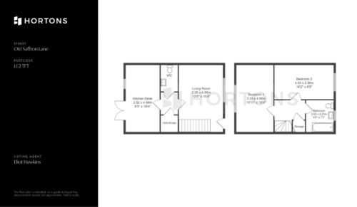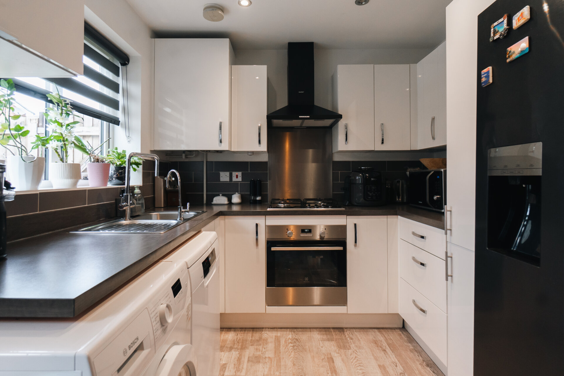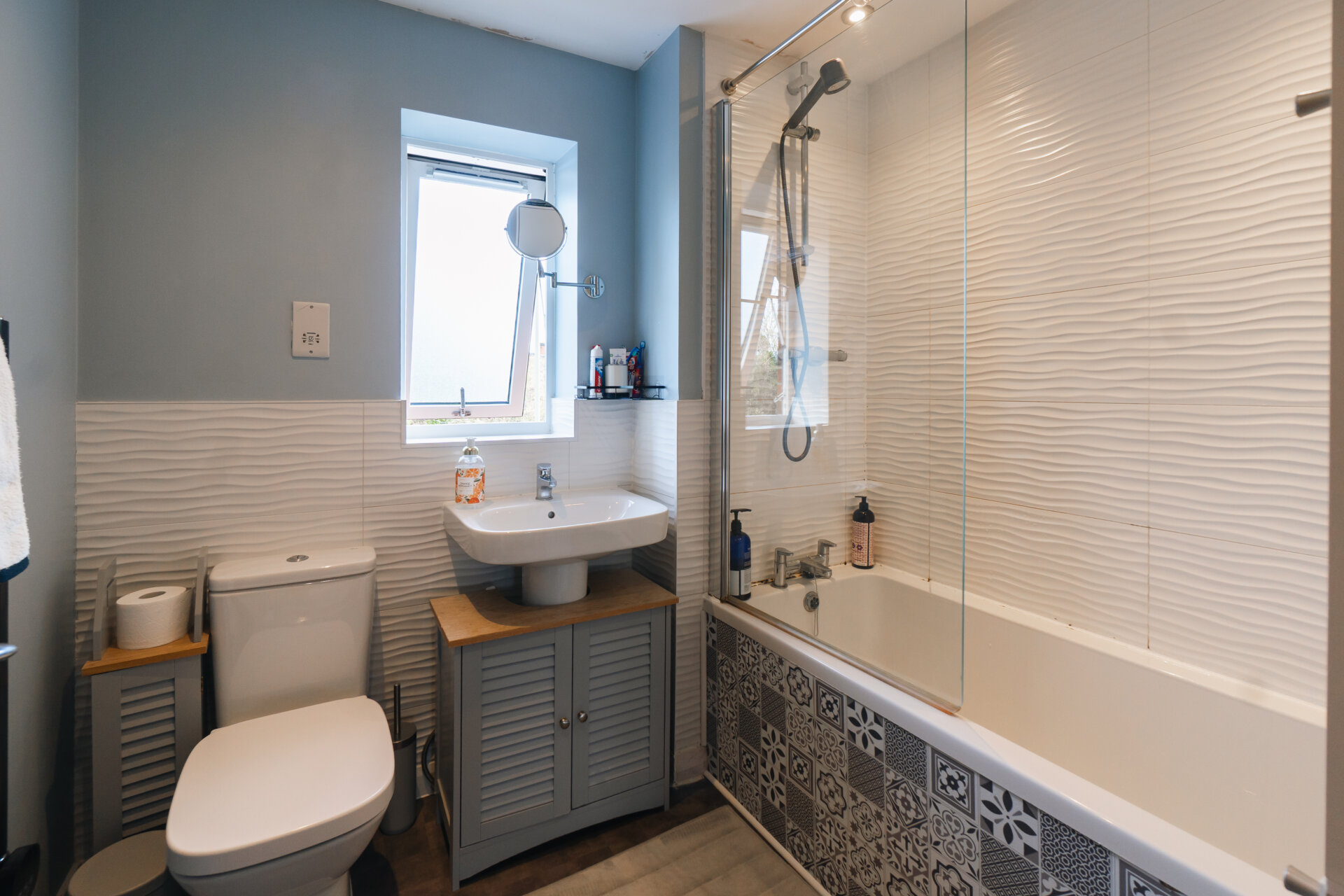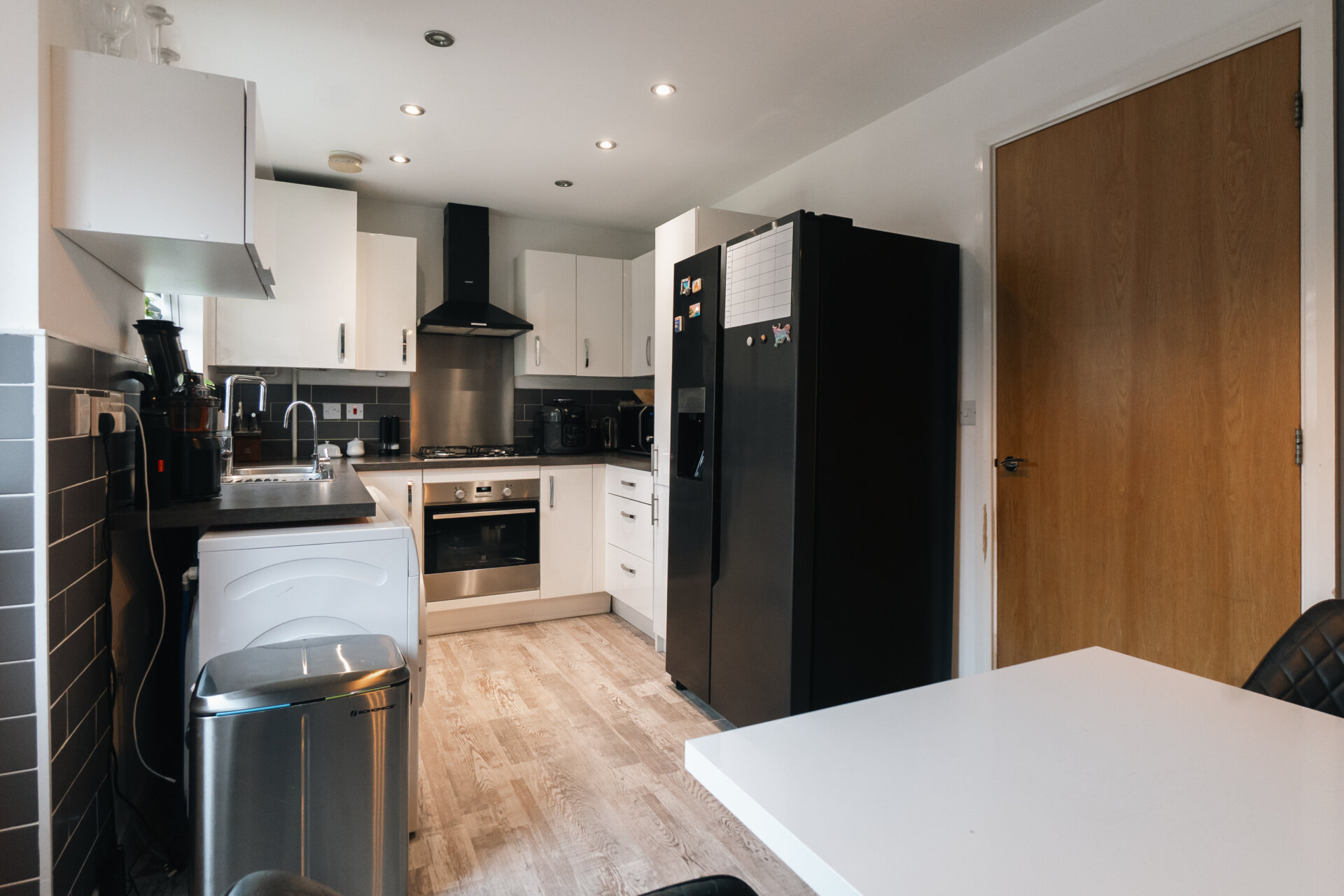 To the front, a driveway providing parking for two cars, the house opens into bright, neatly arranged interiors that flow naturally from room to room. The ground floor is defined by a spacious living area, where a large window fills the space with light, and a modern fitted kitchen sits to the rear, separated by a hallway providing access to a downstairs WC and an under-stairs utility room doubling as storage space. Upstairs, two generous double bedrooms provide flexible accommodation, complemented by a well-finished family bathroom.