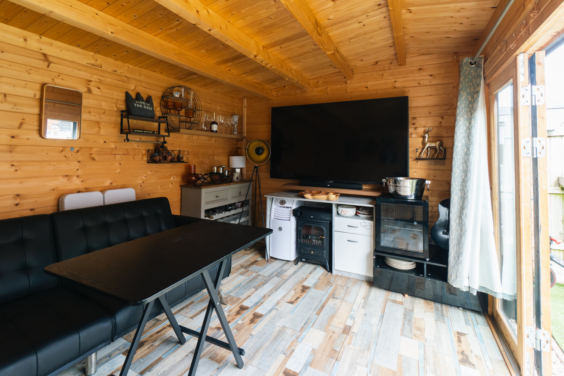 Outside, the rear garden offers both privacy and versatility. A summer house, fitted with electricity and heating, extends the living space and can be used year-round as a home office, creative studio, or social retreat. Just around the corner, a children’s playground adds to the family-friendly appeal of the location.