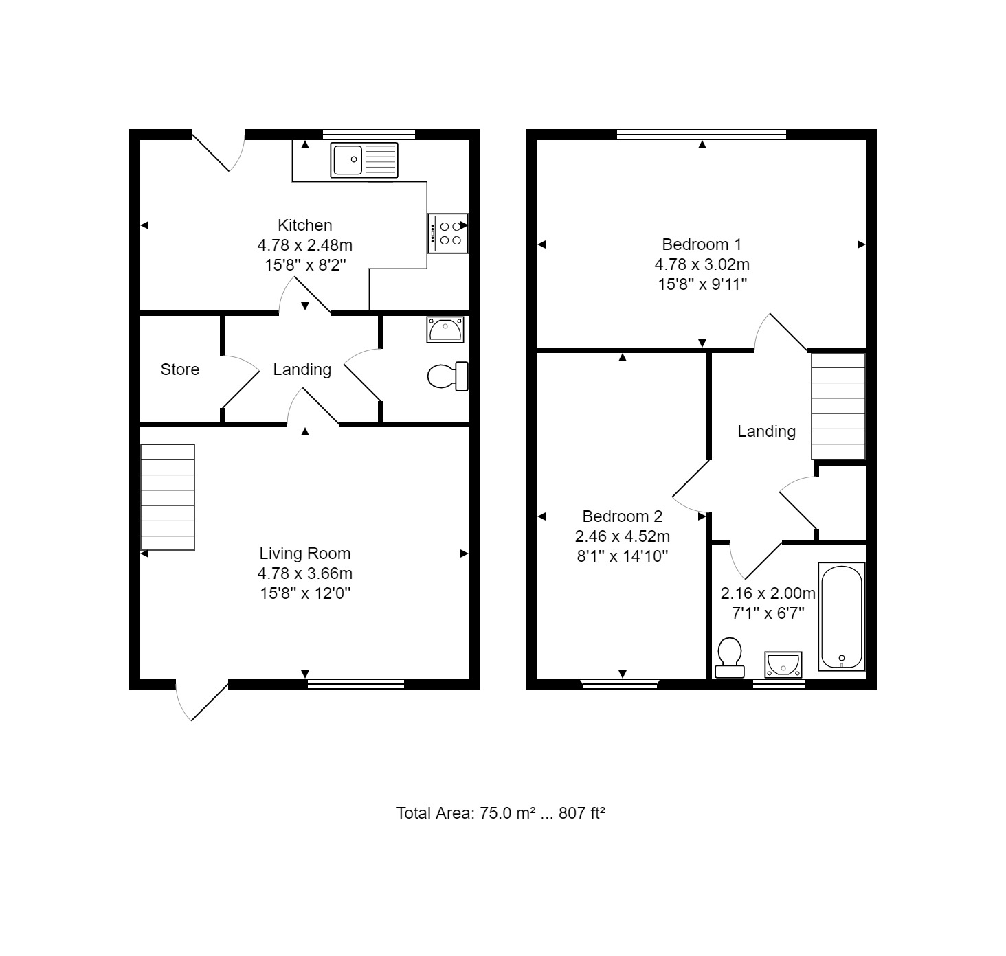 Bedroom 2 14' 10" x 8' 1" (4.52m x 2.46m)