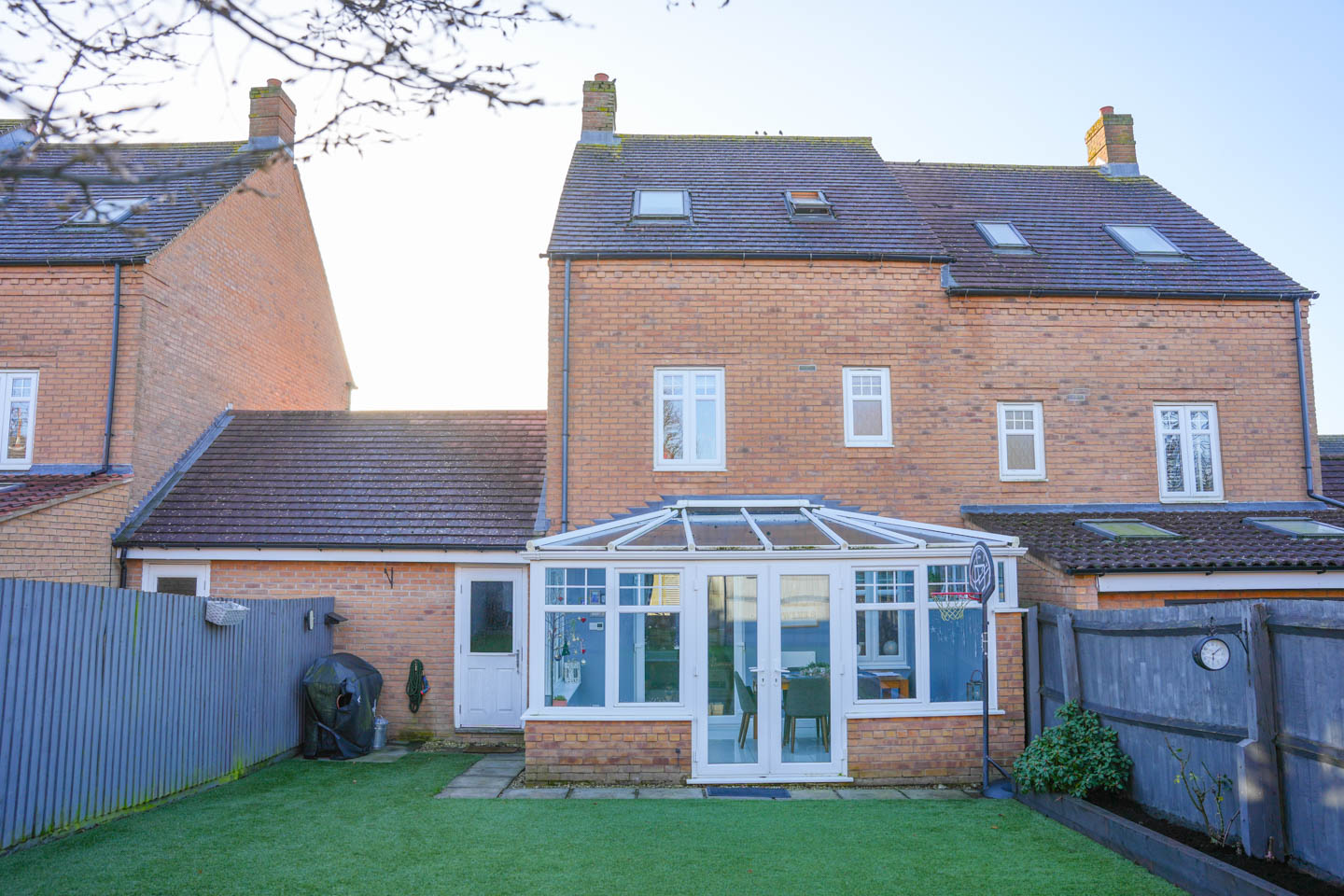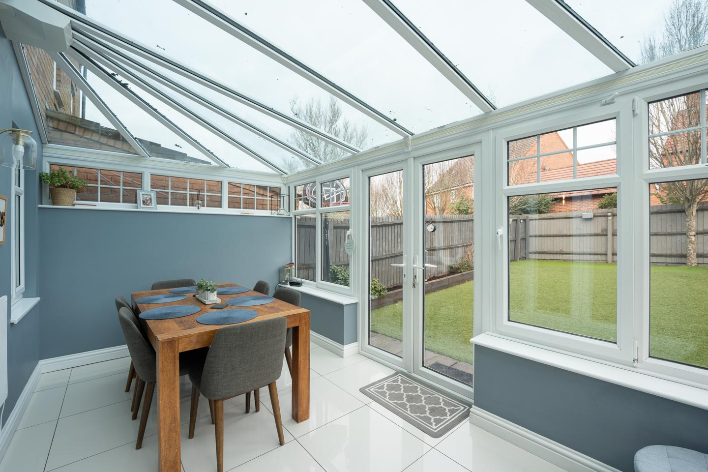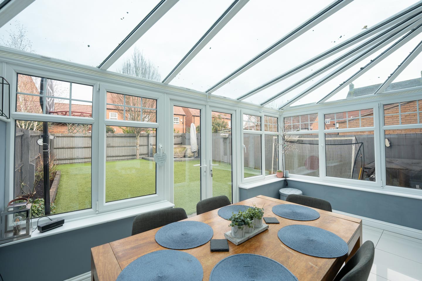 To the rear of the house is a bright and spacious L-shaped reception room, again finished with engineered oak flooring and attractive wall panelling. This space flows seamlessly into a full-width brick and glazed dining conservatory, creating an excellent entertaining and family space with pleasant views over the garden.
