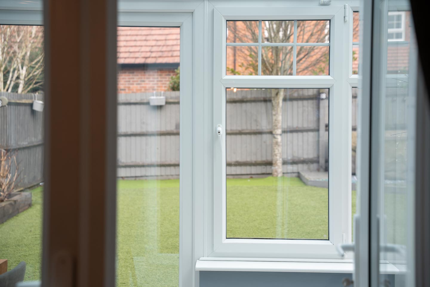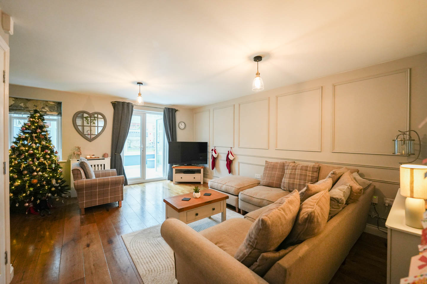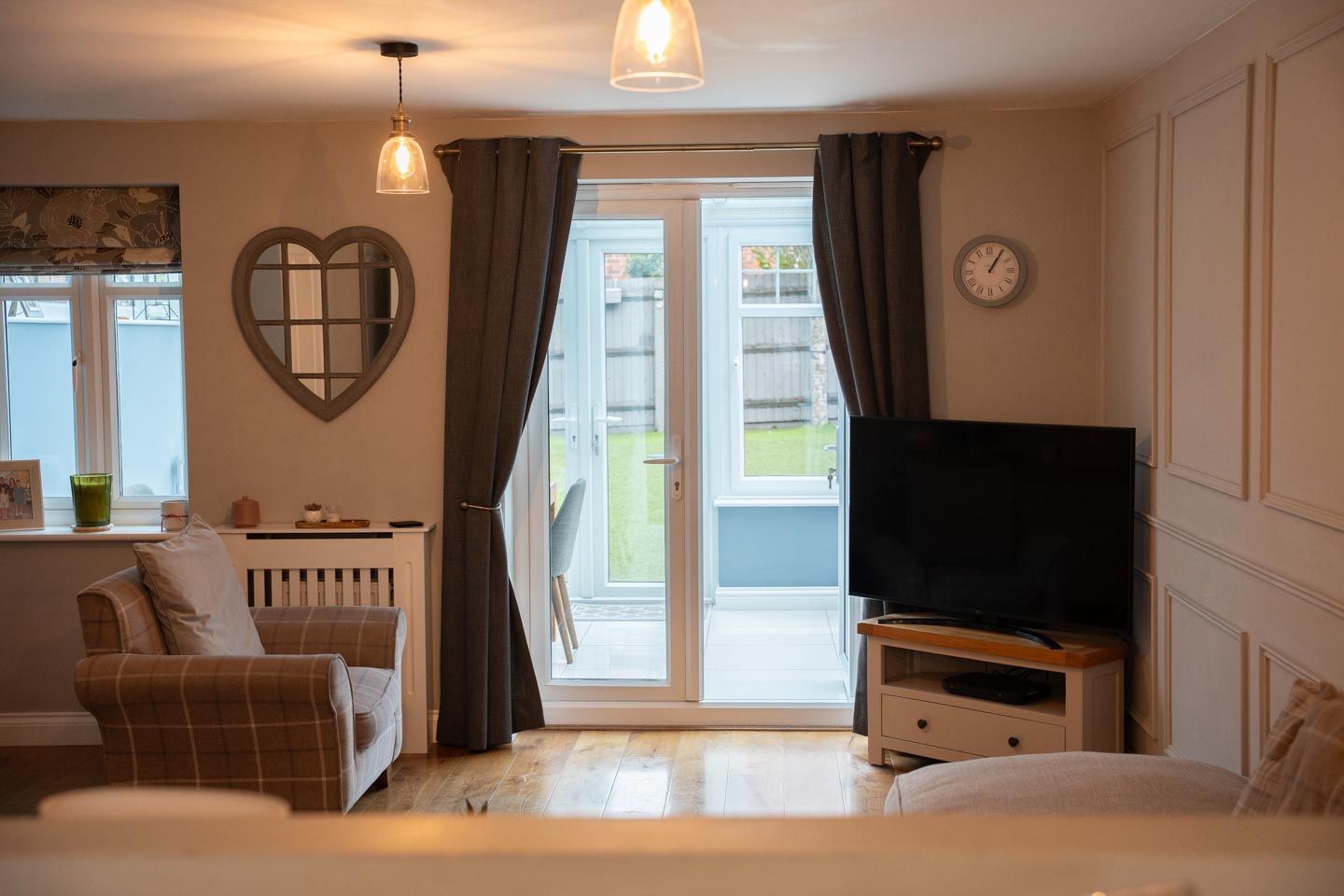 To the rear of the house is a bright and spacious L-shaped reception room, again finished with engineered oak flooring and attractive wall panelling. This space flows seamlessly into a full-width brick and glazed dining conservatory, creating an excellent entertaining and family space with pleasant views over the garden.