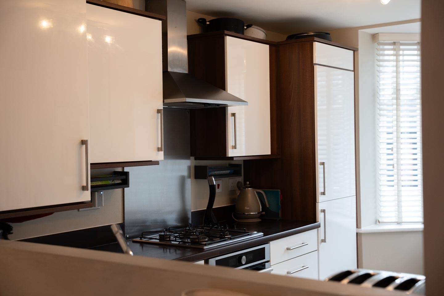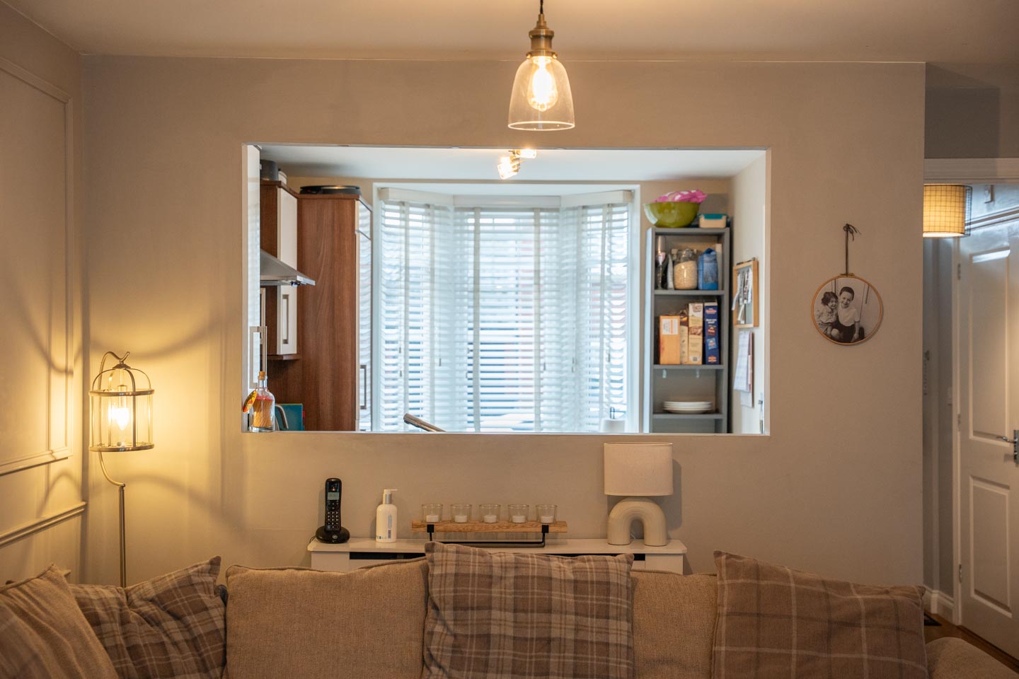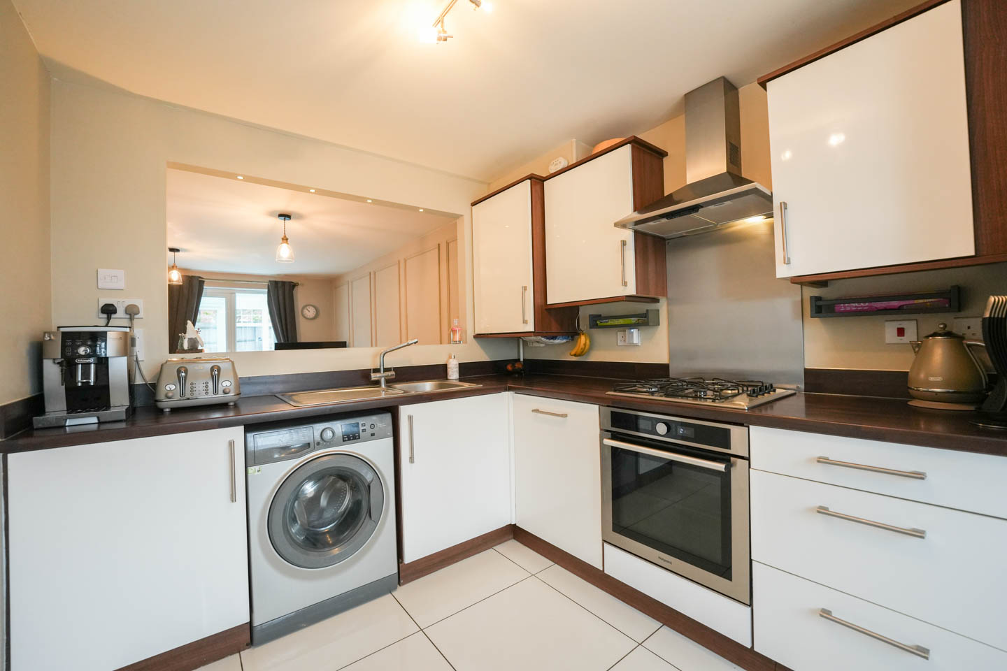 The accommodation begins with a welcoming entrance hall finished with engineered oak flooring, with a useful cloakroom/WC to one side and staircase to the first floor. The mordern kitchen is positioned to the front of the property and is fitted with a range of high gloss, soft-close units providing ample worktop space. Integrated appliances include an electric oven, four-ring hob with stainless steel splashback and extractor above, fridge/freezer and dishwasher, with additional space for a washing machine. The room is finished with tiled flooring and there is a bespoke opening overlooking the main living room.