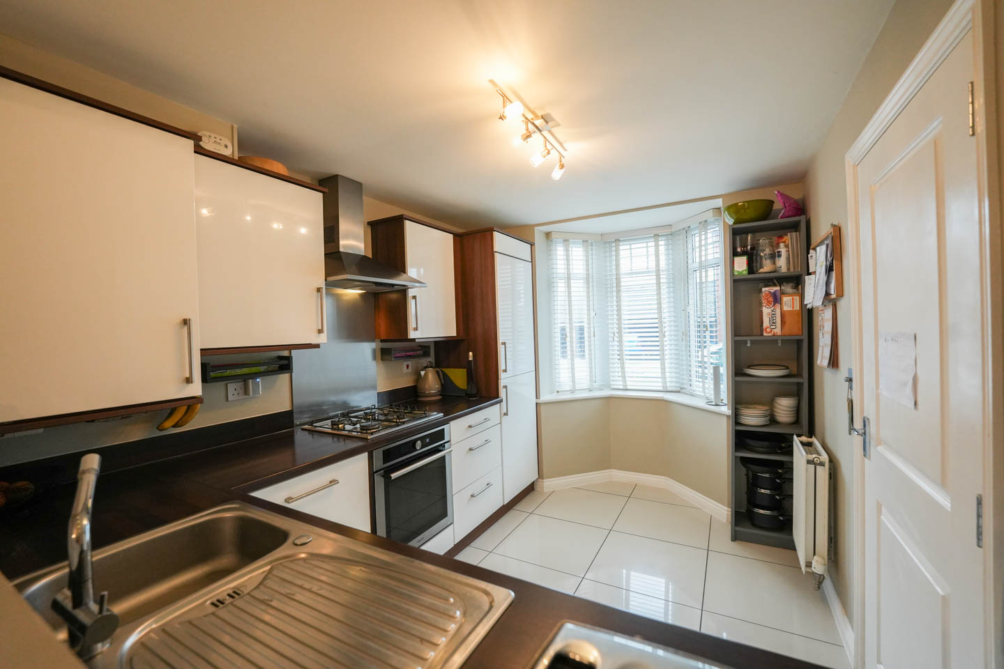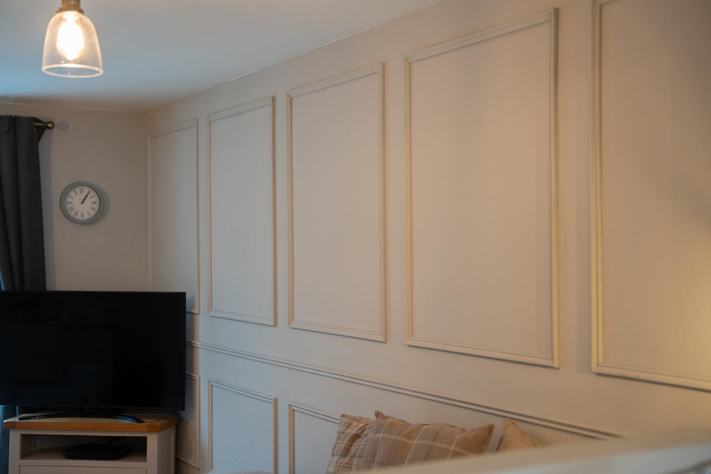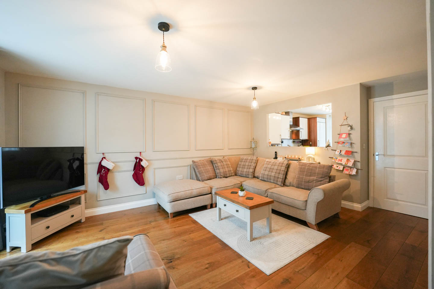 The accommodation begins with a welcoming entrance hall finished with engineered oak flooring, with a useful cloakroom/WC to one side and staircase to the first floor. The mordern kitchen is positioned to the front of the property and is fitted with a range of high gloss, soft-close units providing ample worktop space. Integrated appliances include an electric oven, four-ring hob with stainless steel splashback and extractor above, fridge/freezer and dishwasher, with additional space for a washing machine. The room is finished with tiled flooring and there is a bespoke opening overlooking the main living room.
