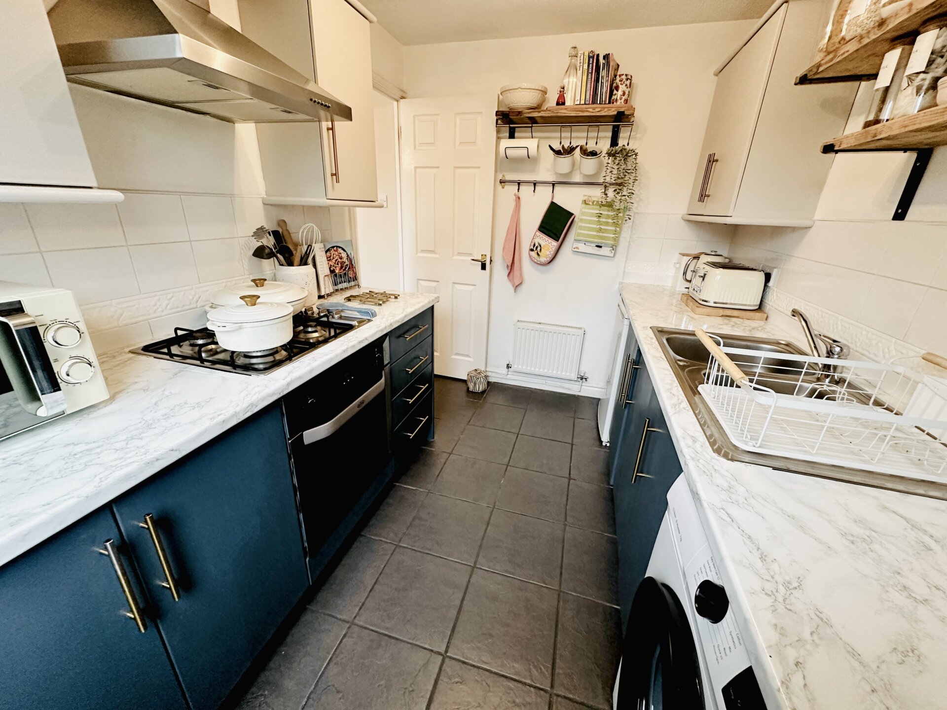 The kitchen presents a modern feel with an array of base and eye level units with worktops over, built-in hob, oven with extractor above, and space for fridge. The built-in stainless steel sink has a mixer tap over and there is space and plumbing for the washing machine. Furthermore, the kitchen houses the central heating boiler and half-glazed door giving direct access to the garden.
