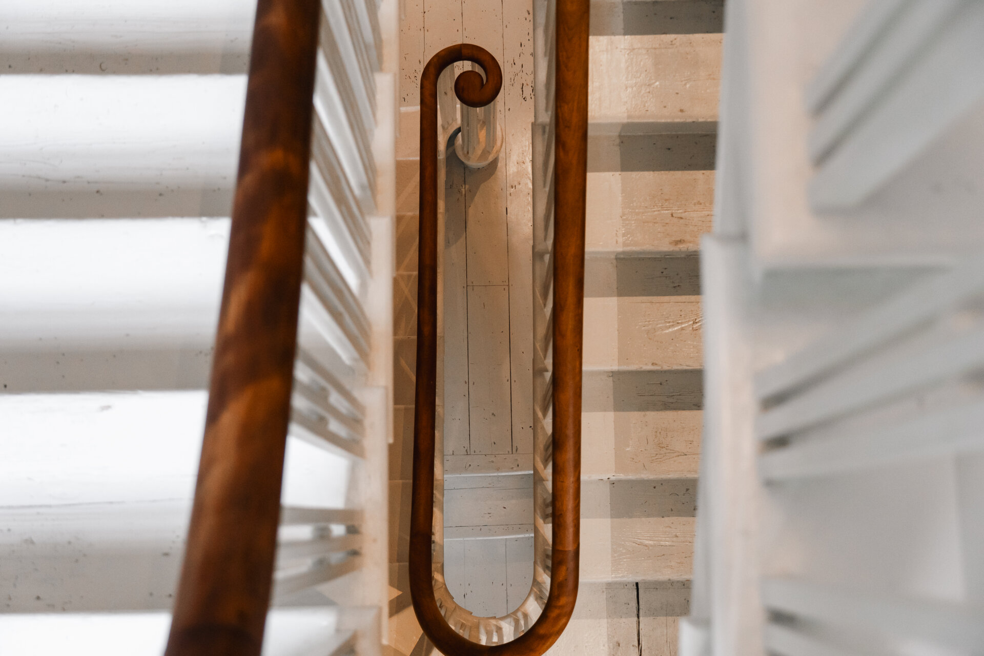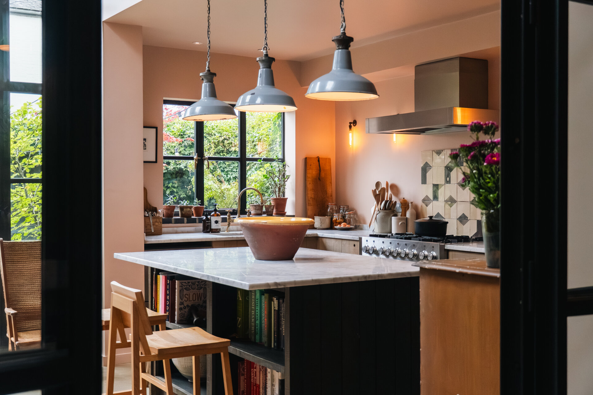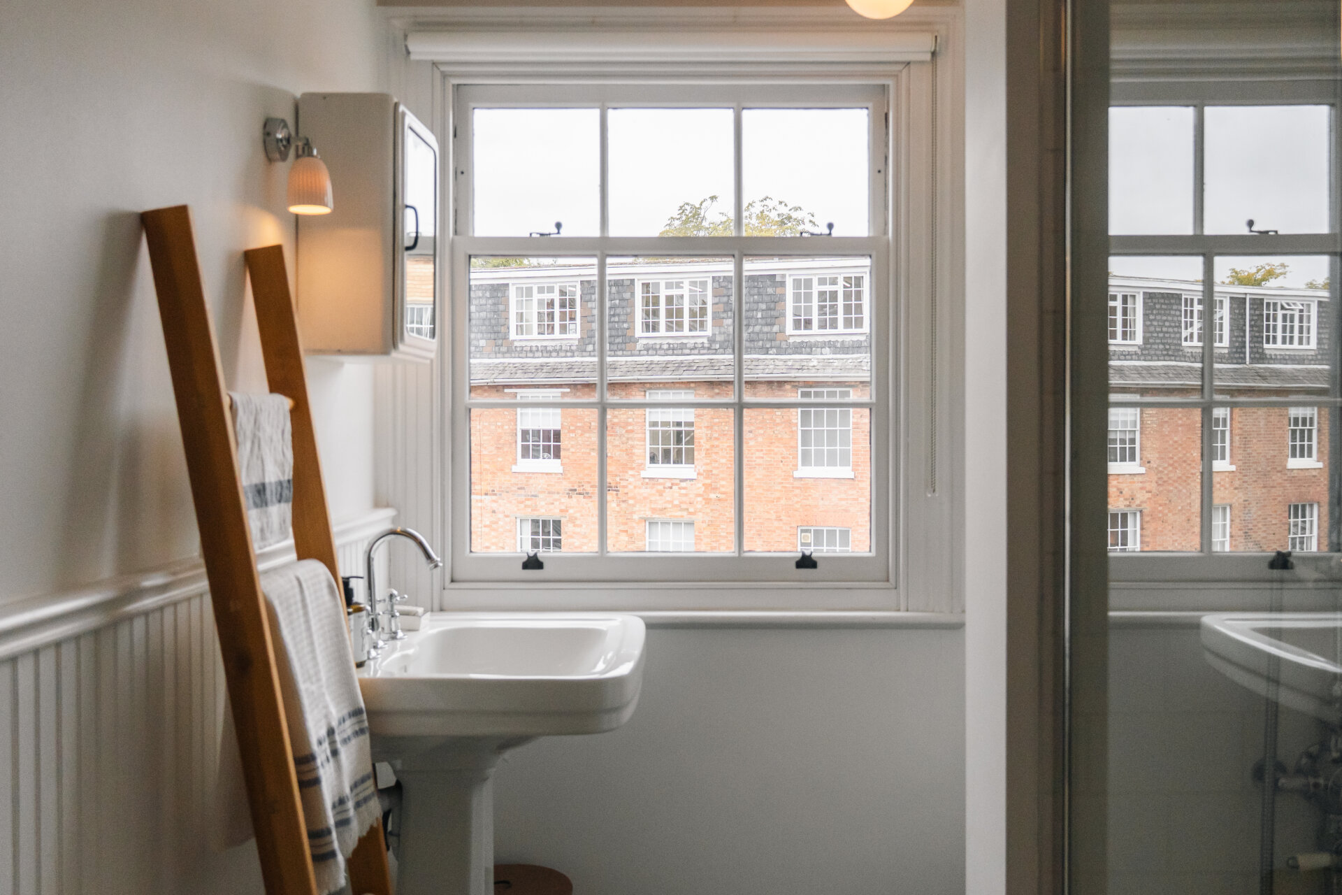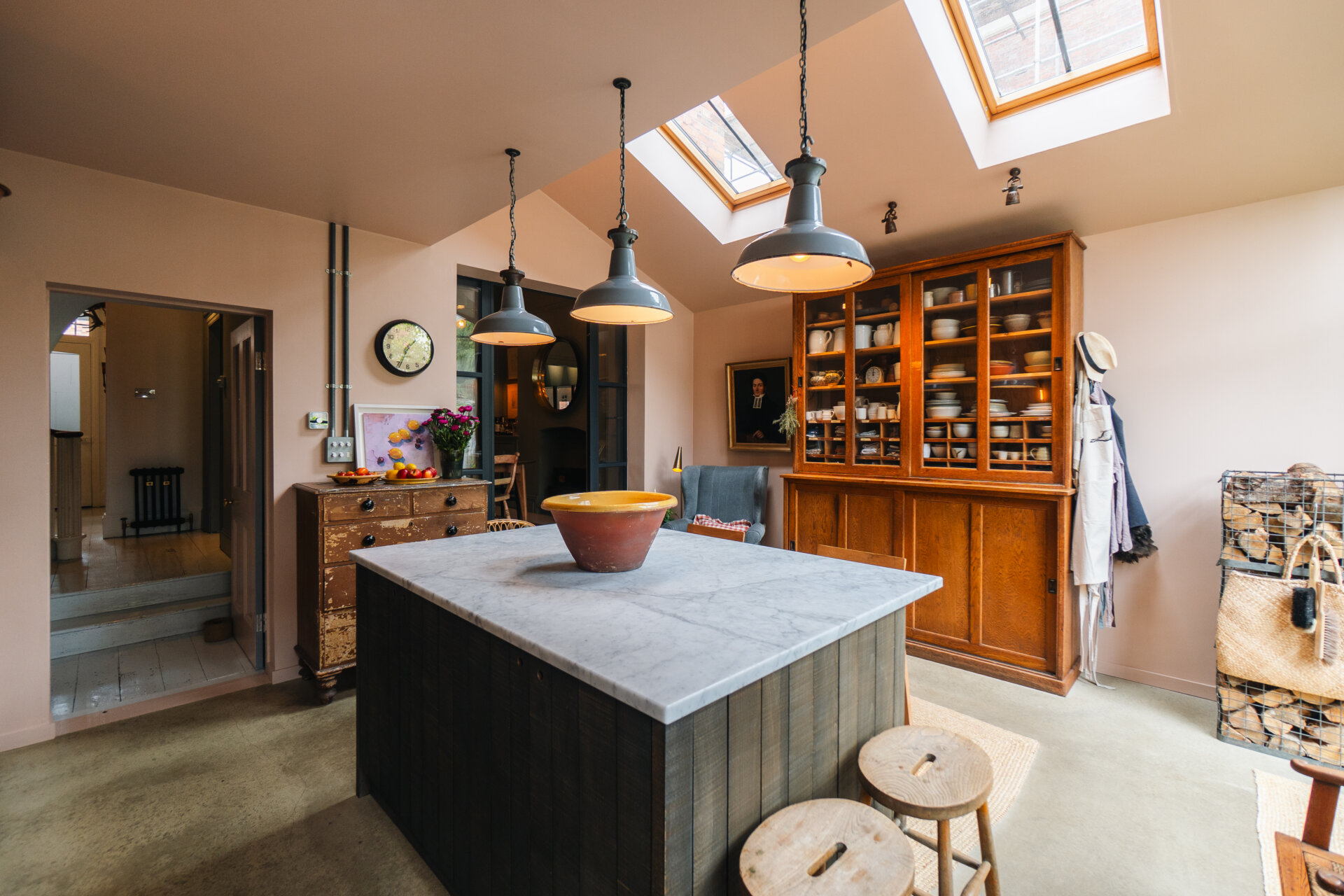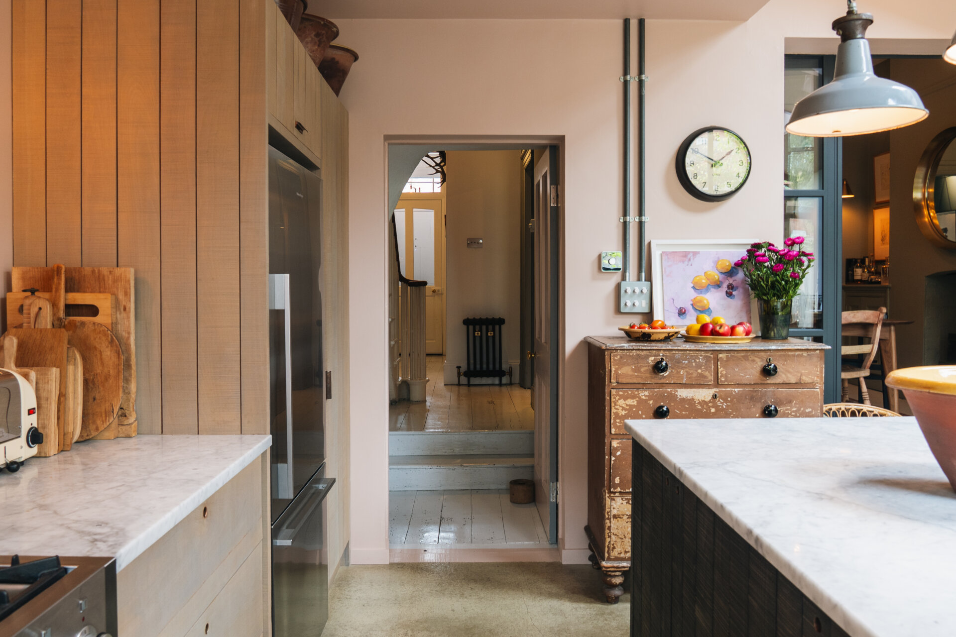 Forming part of a rear extension, the kitchen is a standout. The mono-pitched roof and full-height Met Therm Crittall-style glazing bring in abundant light. A palette of Carrara marble, beech, and Farrow & Ball’s ‘Setting Plaster’ creates a warm, tactile atmosphere. The cabinetry, designed by Sebastian Cox for deVol kitchens uses band-sawn beech in a minimalist format. Appliances are by Fisher & Paykel and Mercury, with a substantial Carrara marble slab anchoring the central workspace alongside underfloor heating.