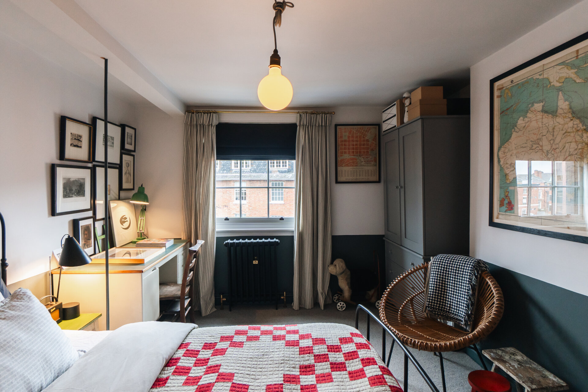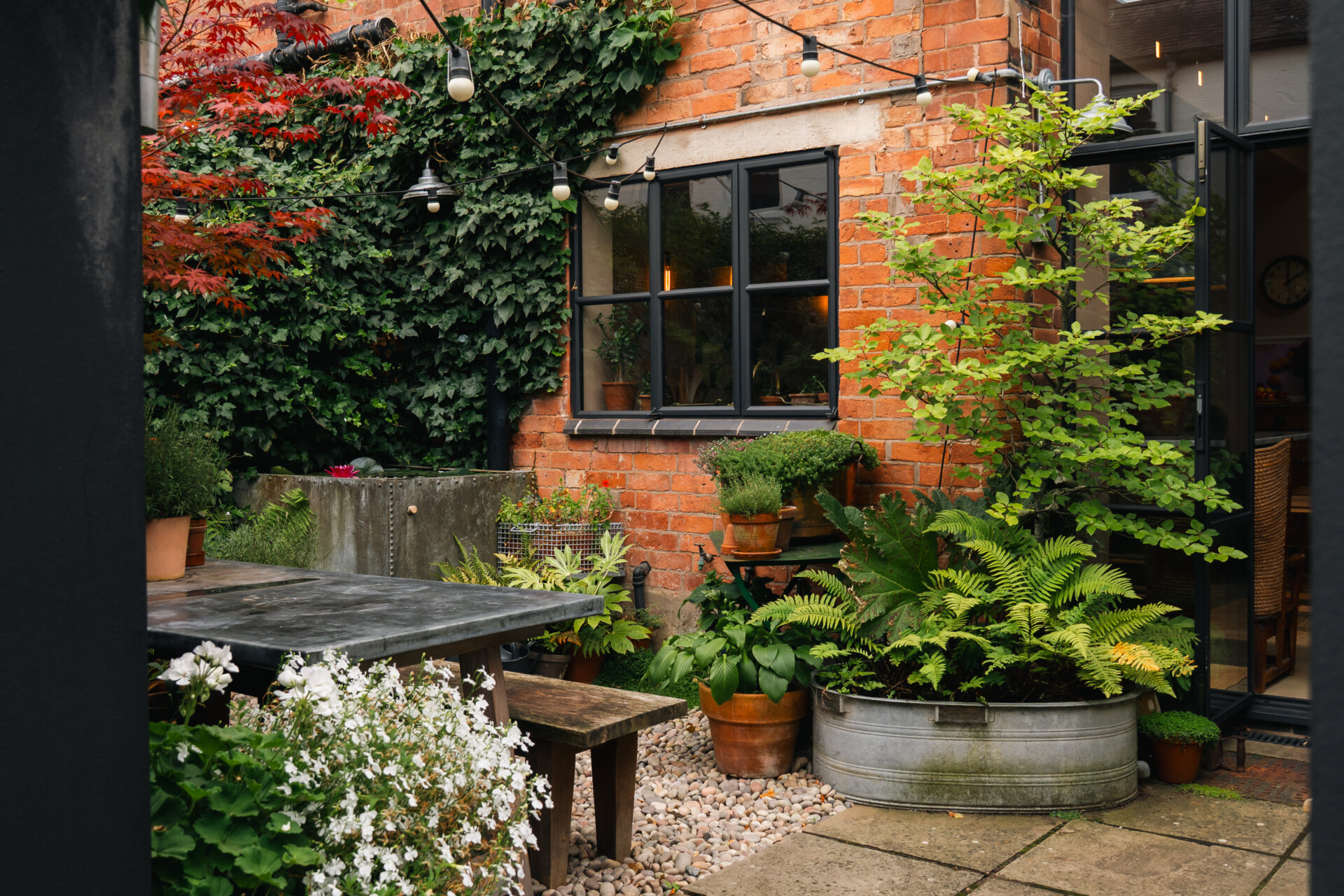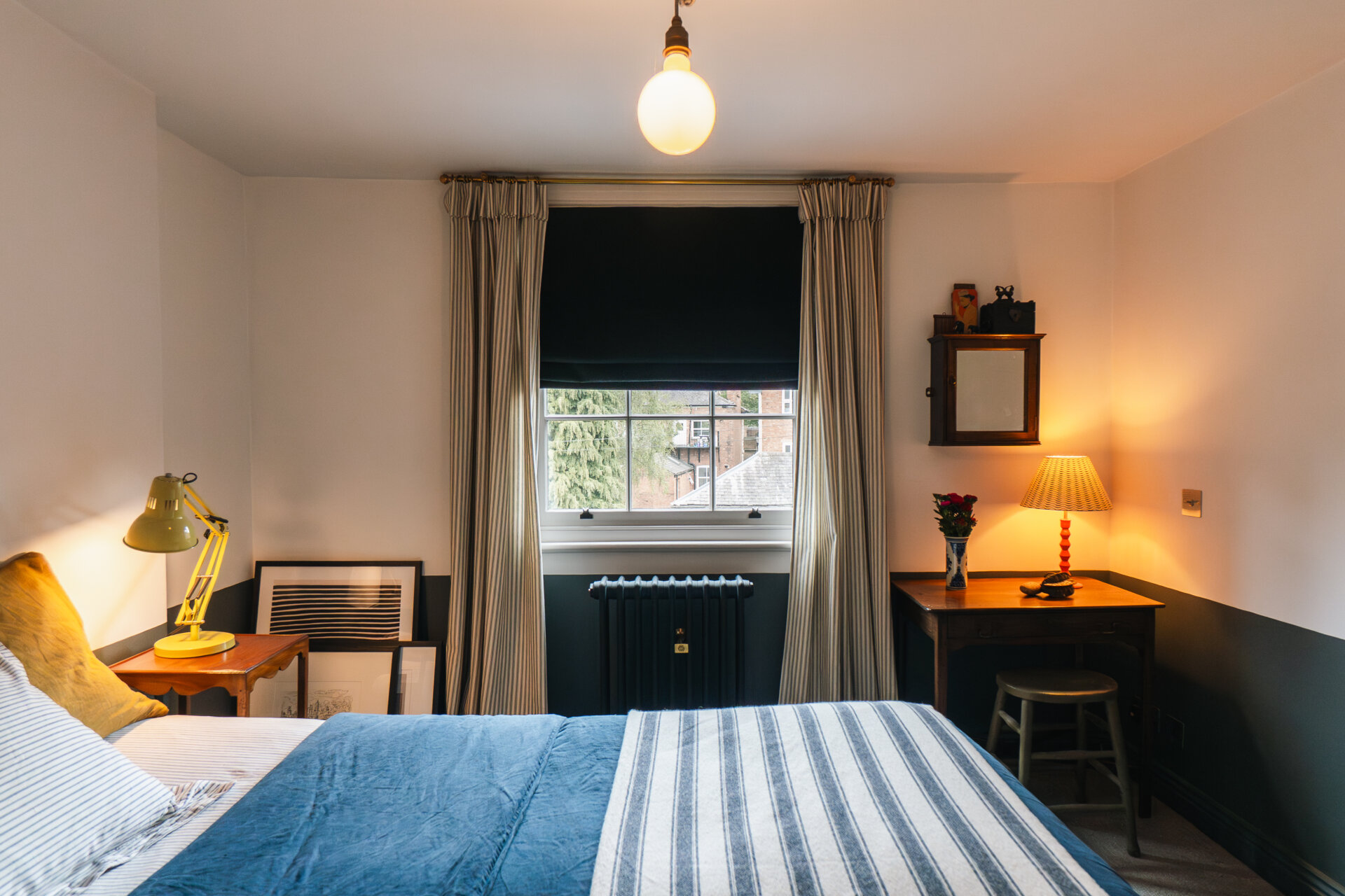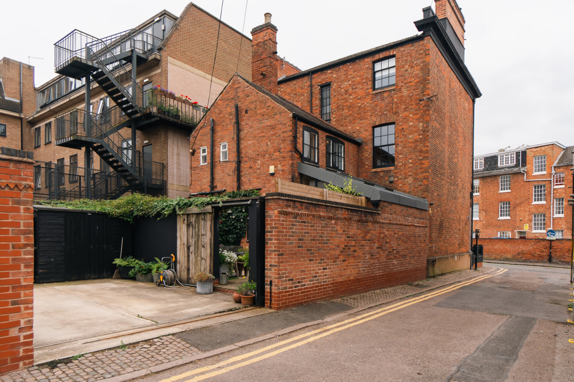Outside, the rear courtyard has been landscaped with structure and softness in mind. Walls are painted in Little Greene’s ‘Jack Black’ to echo the house’s exterior, softened by mature ivy and clematis. A repurposed water tank forms an urban pond, and architectural planting is lit for evening use. Beyond, a timber gate leads to private off-street parking for two cars, a rarity to have in the city centre.