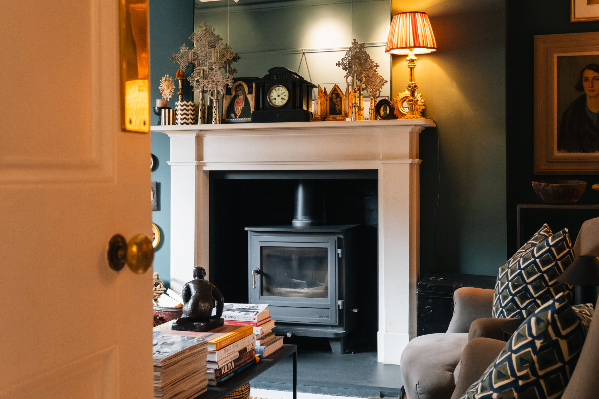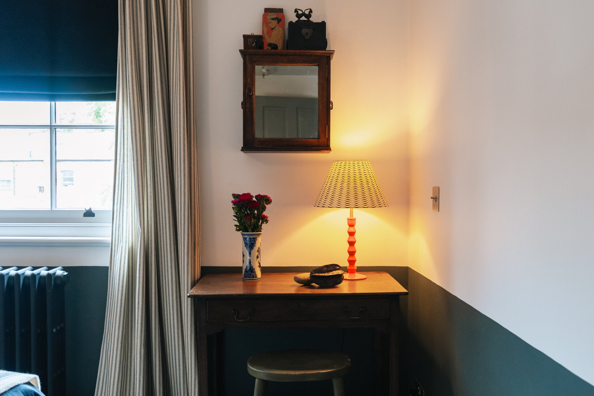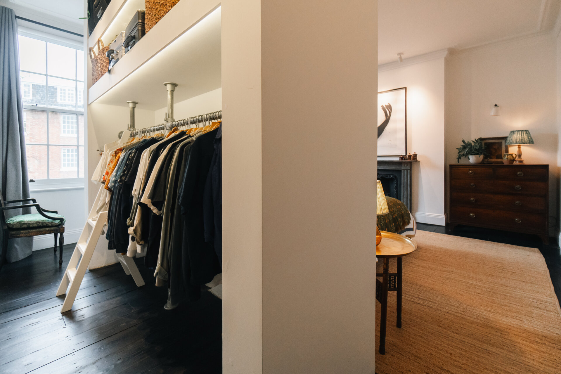 Outside, the rear courtyard has been landscaped with structure and softness in mind. Walls are painted in Little Greene’s ‘Jack Black’ to echo the house’s exterior, softened by mature ivy and clematis. A repurposed water tank forms an urban pond, and architectural planting is lit for evening use. Beyond, a timber gate leads to private off-street parking for two cars, a rarity to have in the city centre.