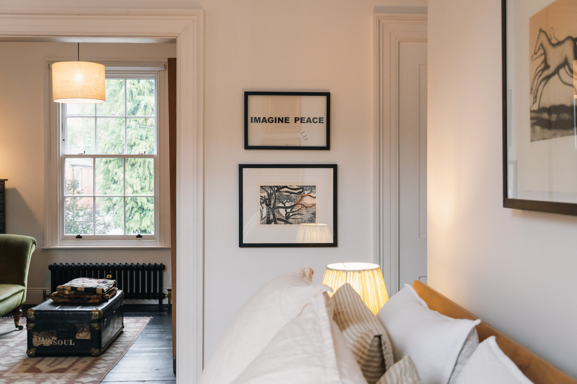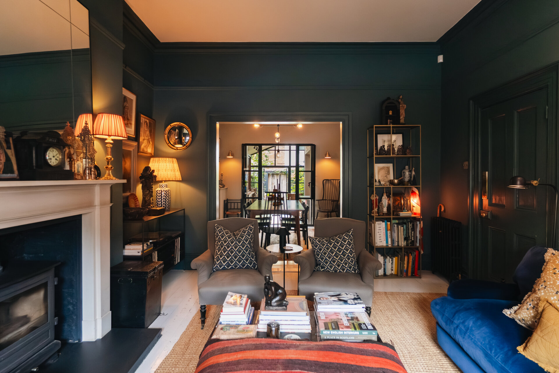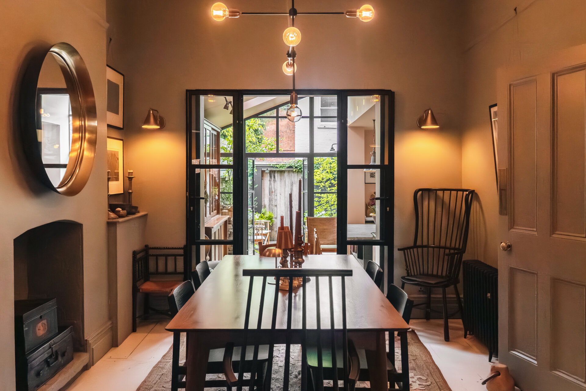 Set slightly above street level, the house opens to a wide, light-filled hallway. The sash windows have been reinstated and are heritage-approved sealed unit double-glazed throughout. The living room, painted in Farrow & Ball’s ‘Inchyra Blue’, centres around a traditional stone fireplace and features original cornicing and picture rails, it connects via a generous opening to the dining room. Painted floorboards unify both spaces and draw the eye down to the kitchen.