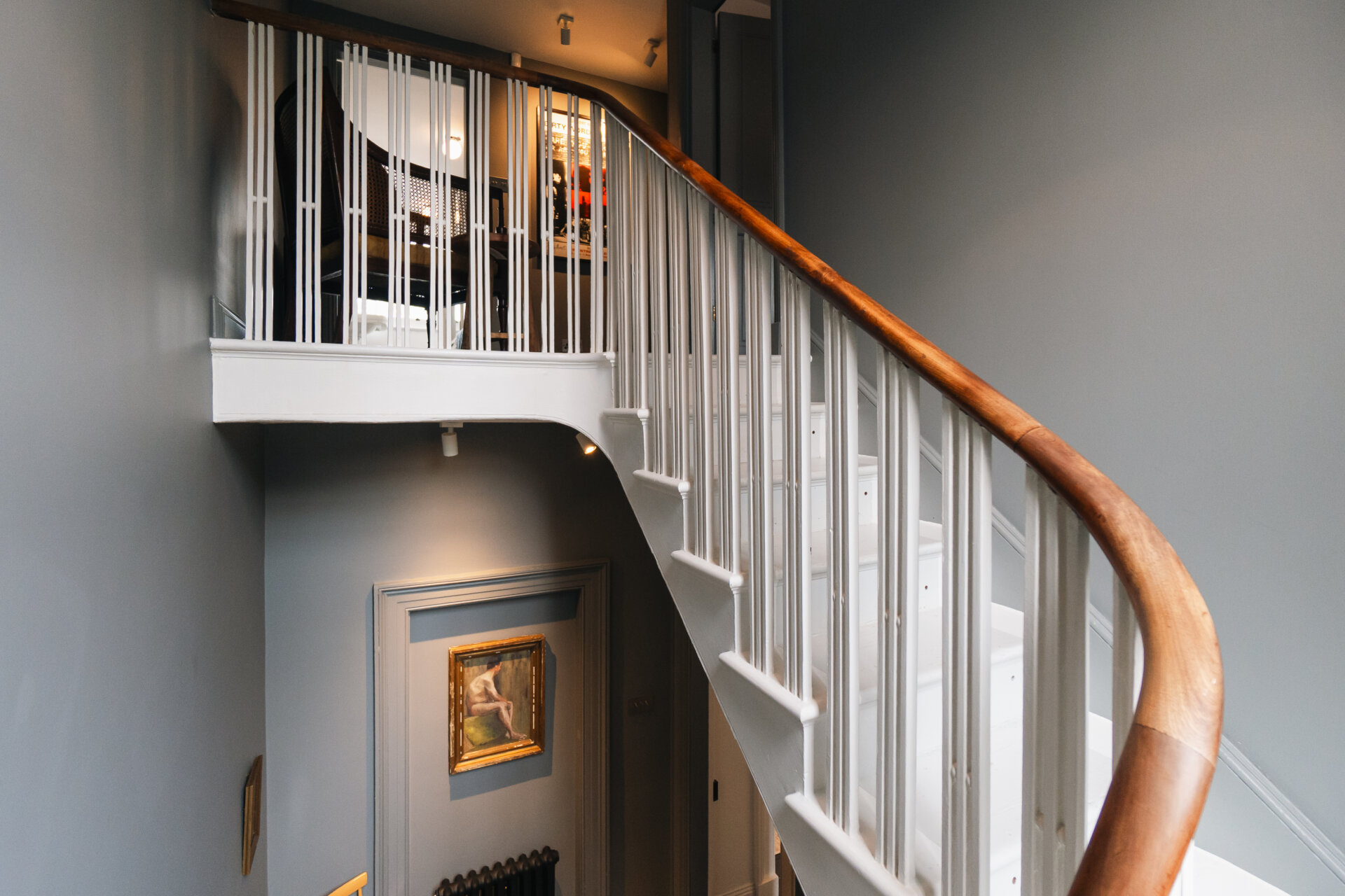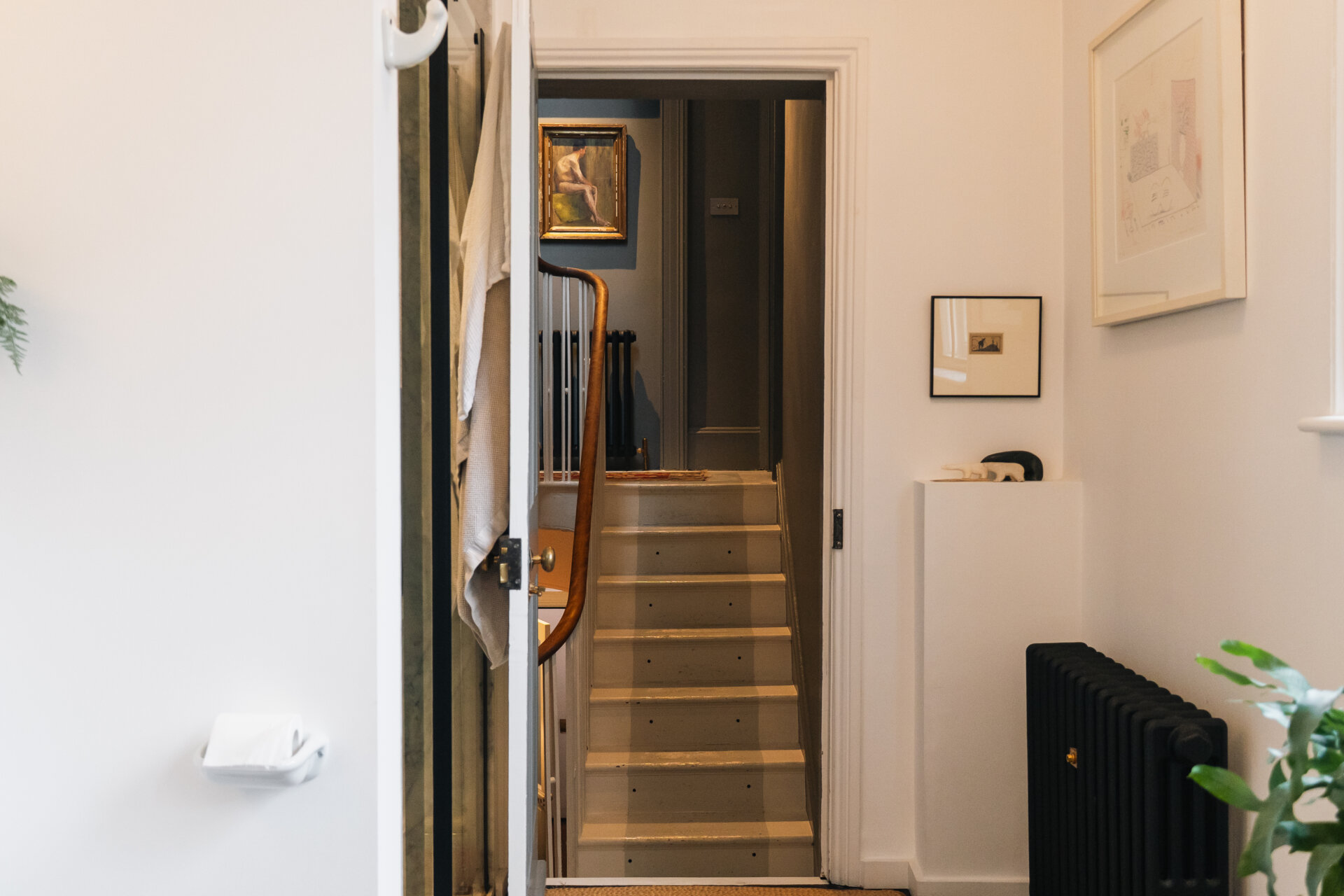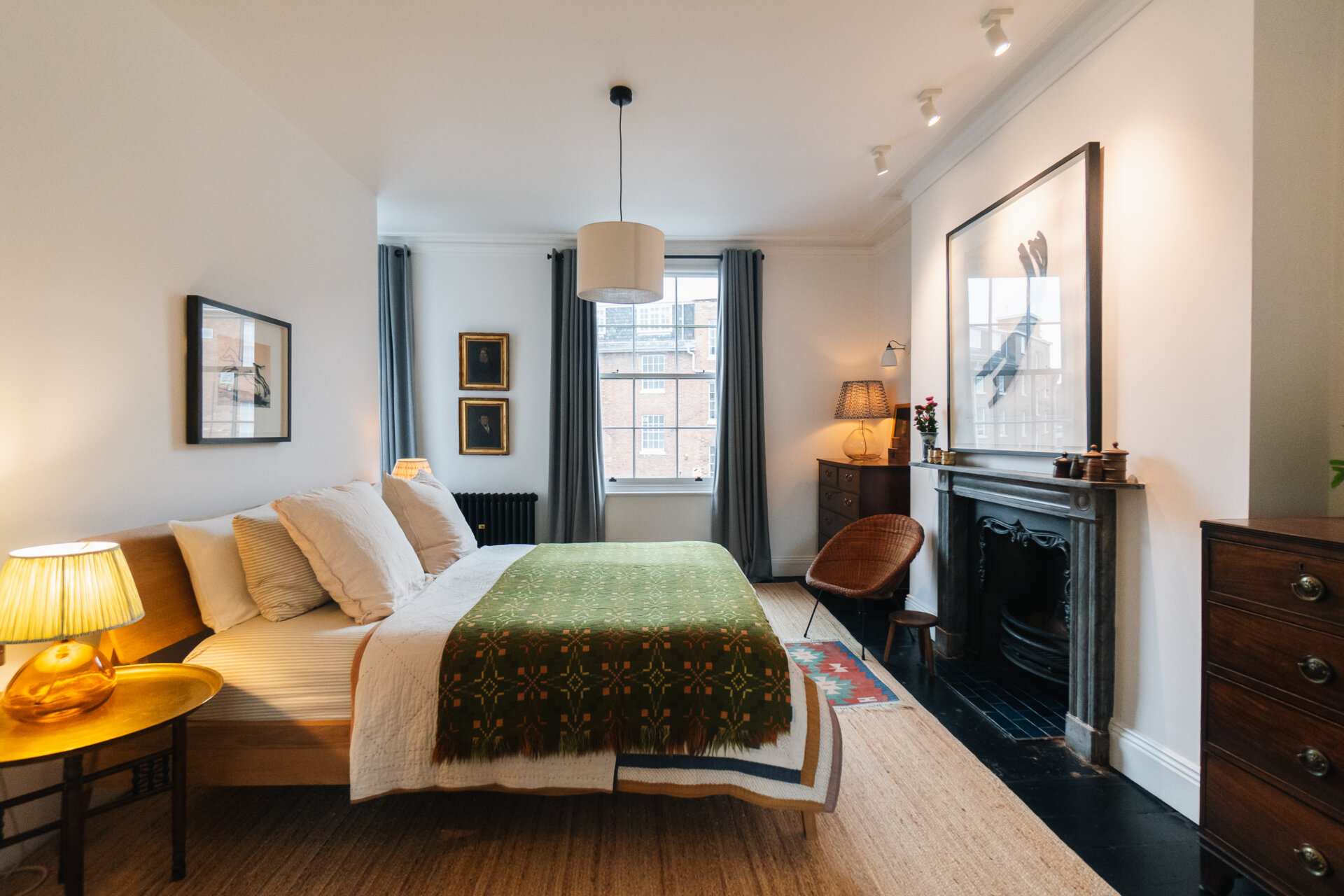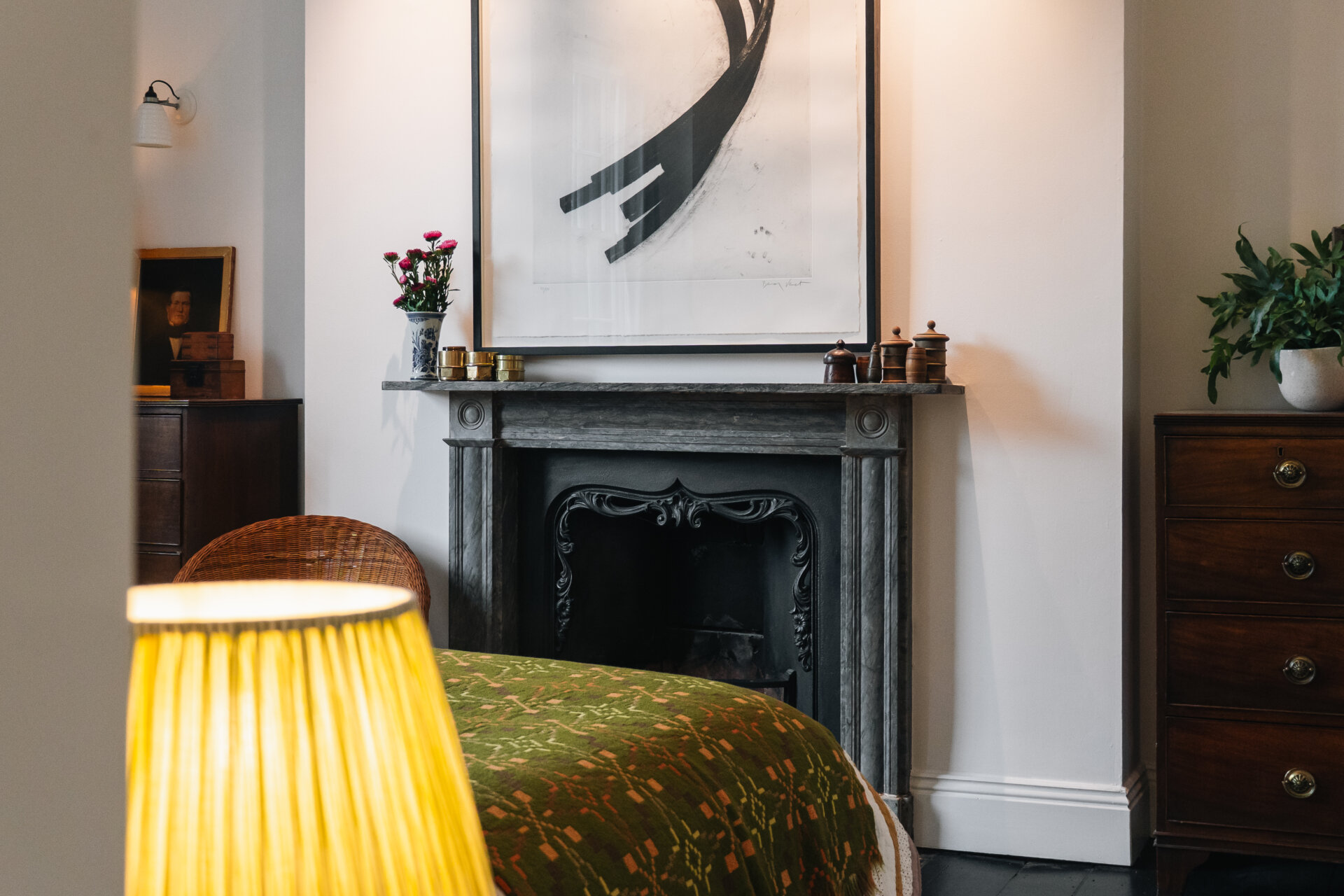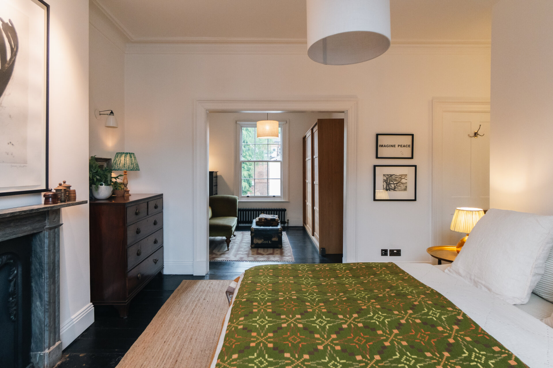 Upstairs, the first floor has been reconfigured into a full-width primary suite comprising a bedroom, dressing room and bathroom. Richly stained floorboards contrast with light-toned walls, and original marble and stone fireplaces. The bathroom, housed in the rear outrigger, is finished with full Carrara marble sheets in the walk-in shower, black Dornbracht fittings, and a freestanding Arroll ‘Lyon’ roll-top bath. Two further bedrooms lie on the top floor, each with views across the city’s varied roofline. A second bathroom sits between them, finished in a timeless, traditional style, providing ample space for all necessary furniture.