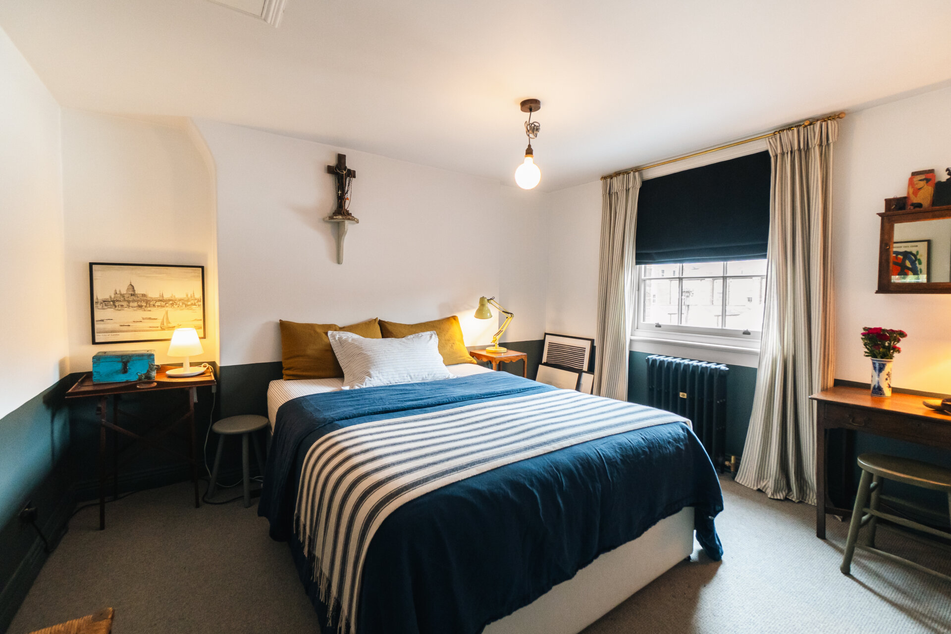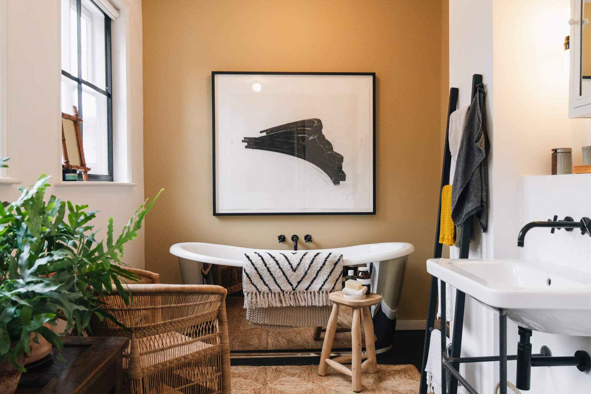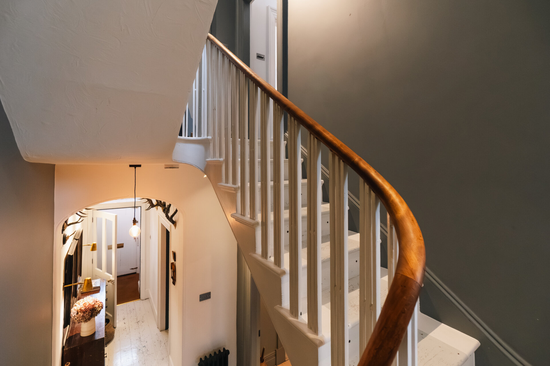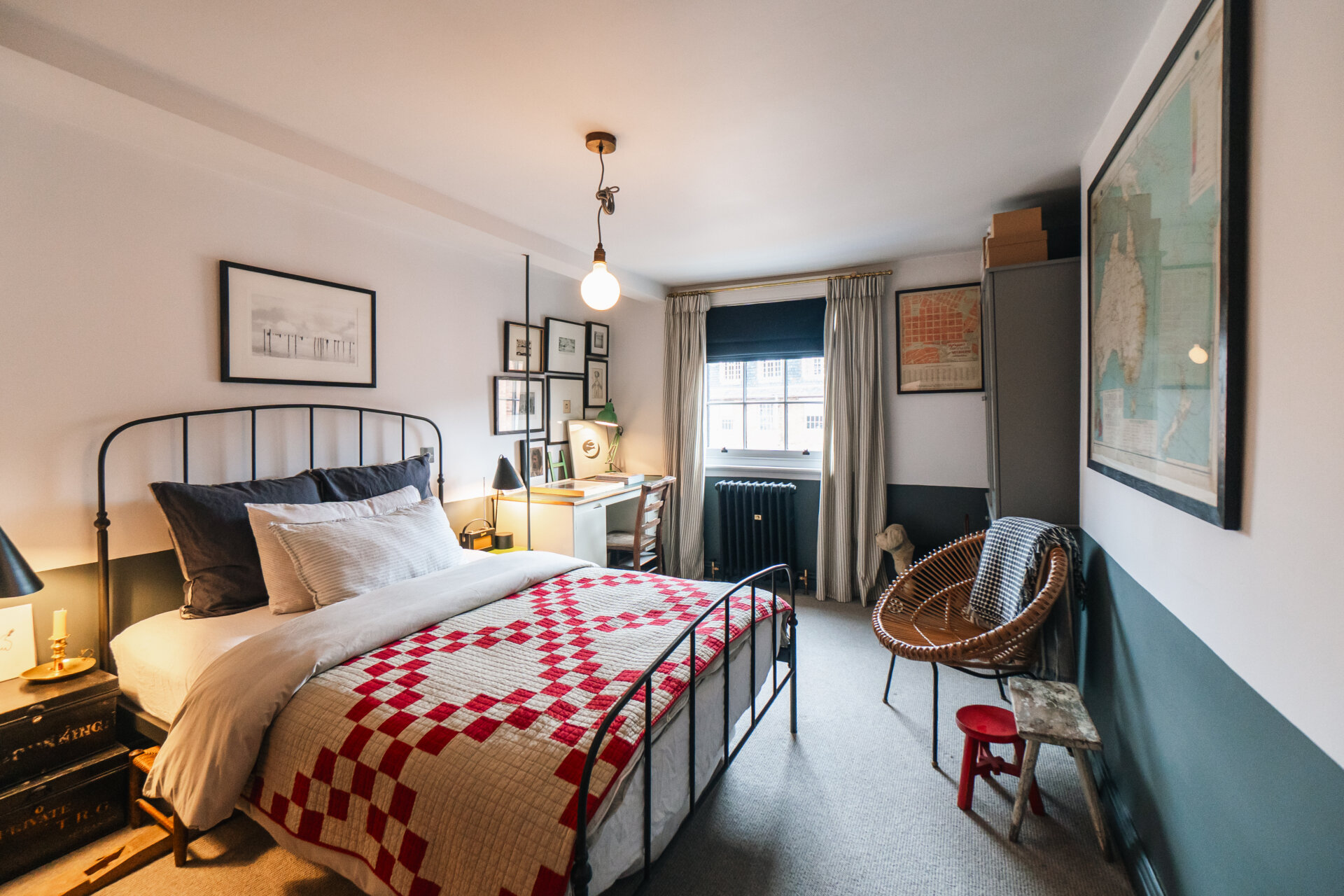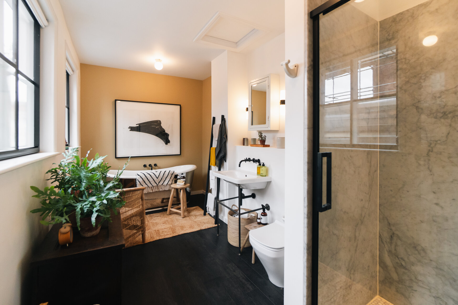 Upstairs, the first floor has been reconfigured into a full-width primary suite comprising a bedroom, dressing room and bathroom. Richly stained floorboards contrast with light-toned walls, and original marble and stone fireplaces. The bathroom, housed in the rear outrigger, is finished with full Carrara marble sheets in the walk-in shower, black Dornbracht fittings, and a freestanding Arroll ‘Lyon’ roll-top bath. Two further bedrooms lie on the top floor, each with views across the city’s varied roofline. A second bathroom sits between them, finished in a timeless, traditional style, providing ample space for all necessary furniture.