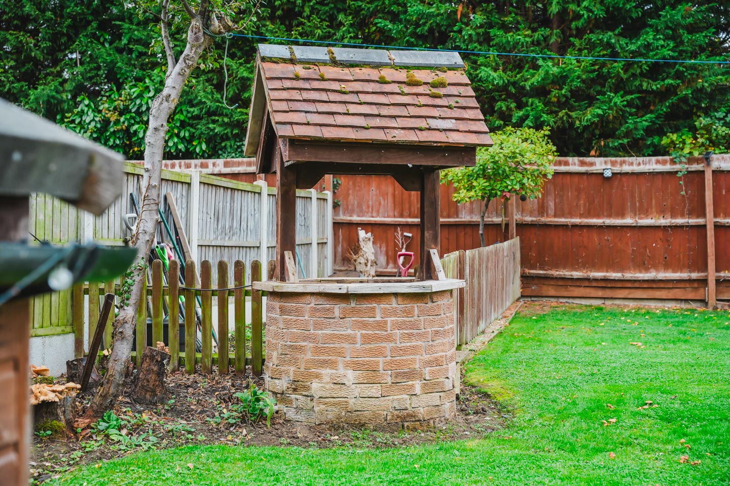 Outside, the property enjoys a block-paved driveway providing ample off road parking alongside a front lawn. The rear garden features a generous patio area, ideal for outdoor dining, steps leading up to a large lawn, and a charming feature well with a further fenced area uses as a vegetable garden.