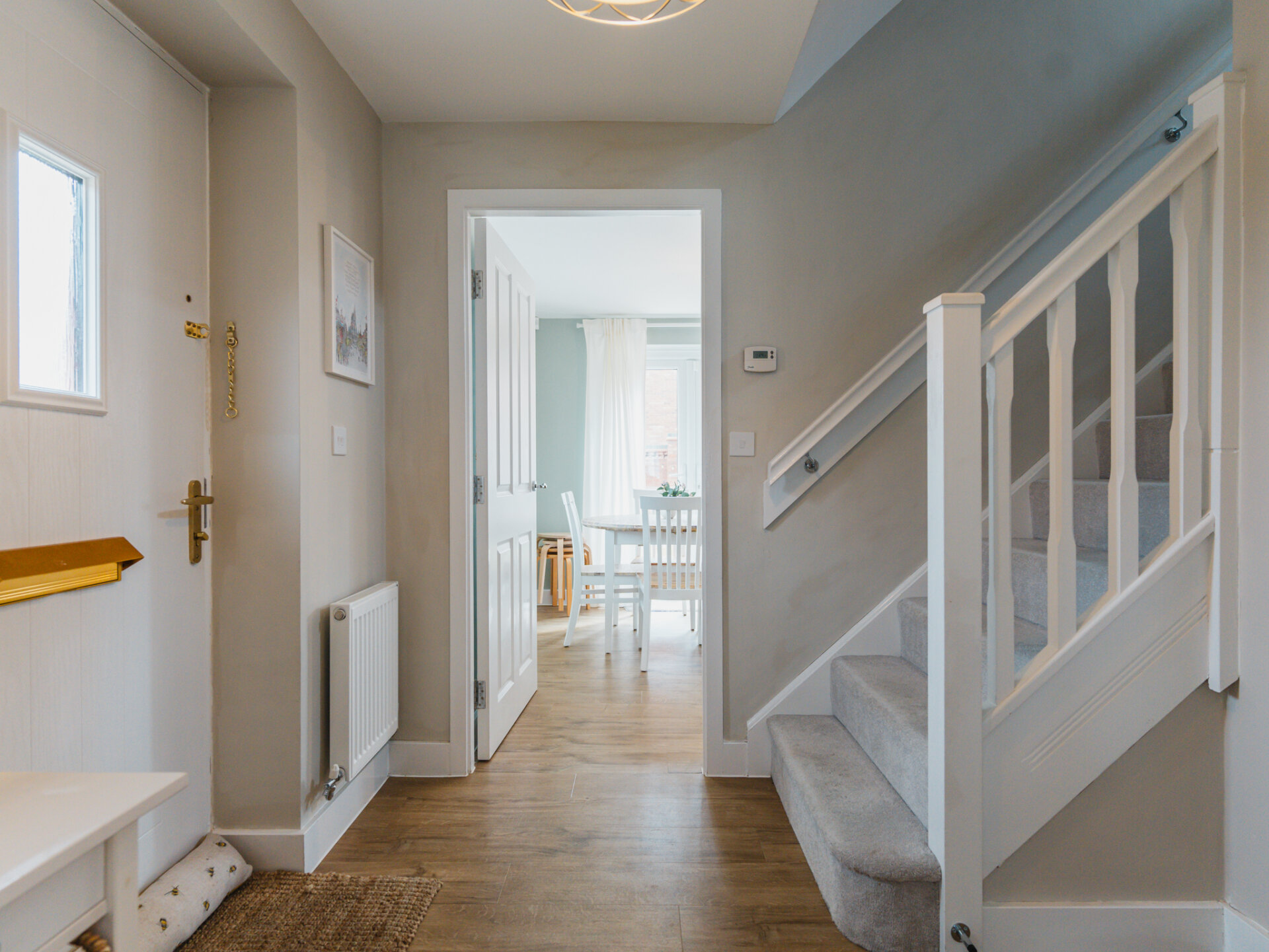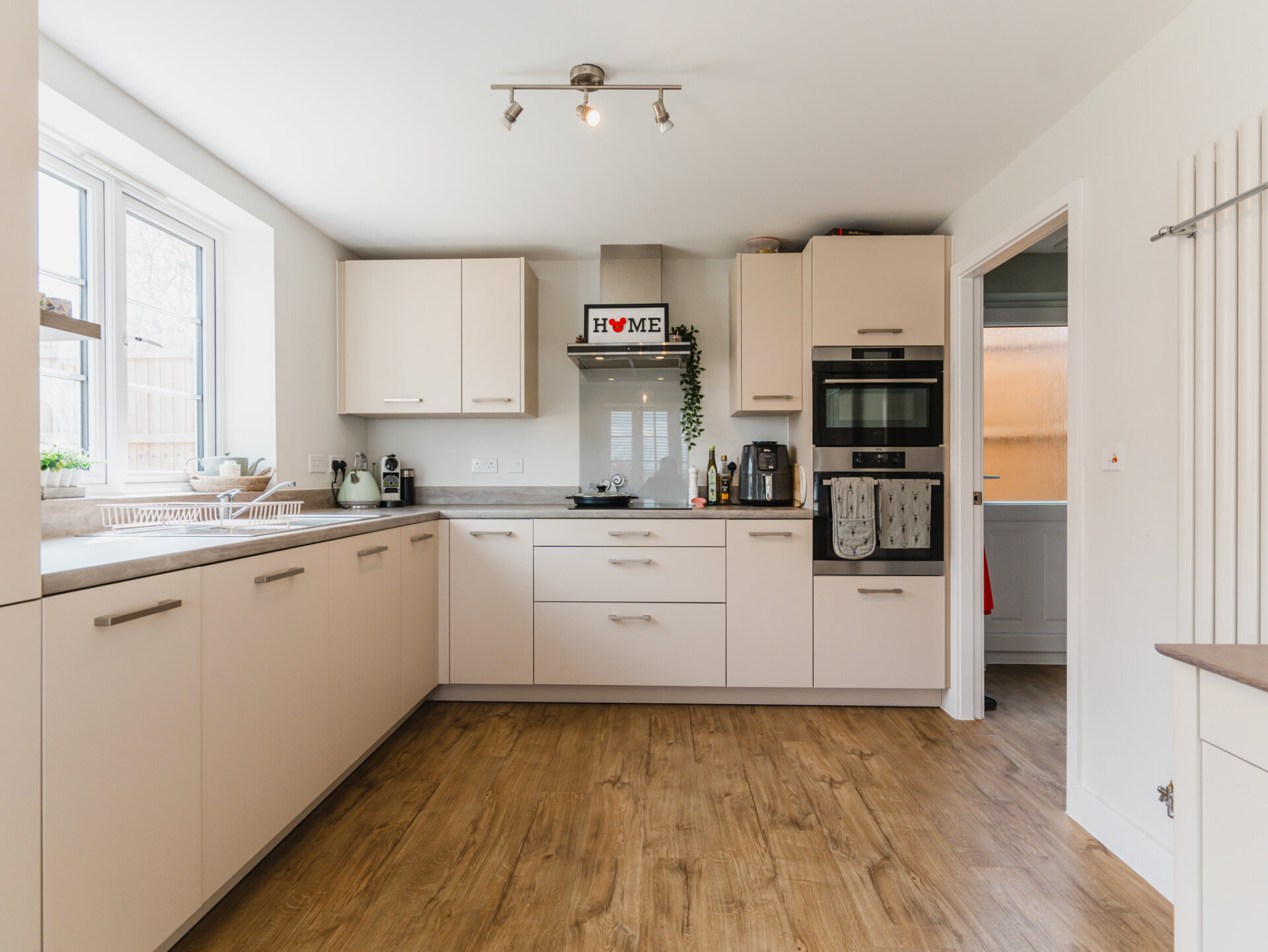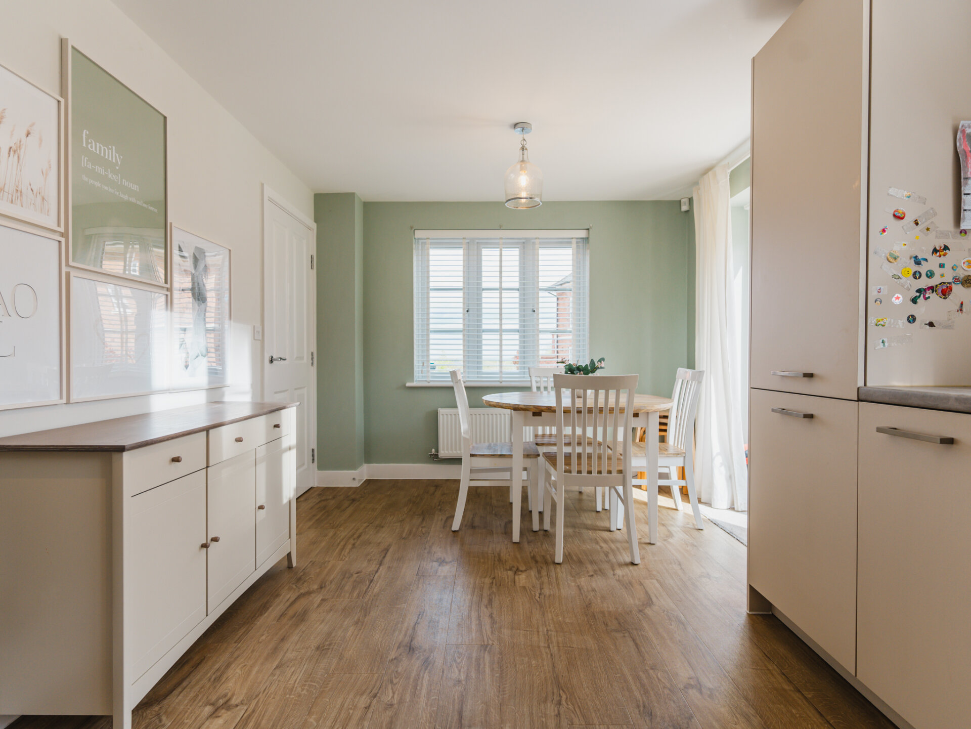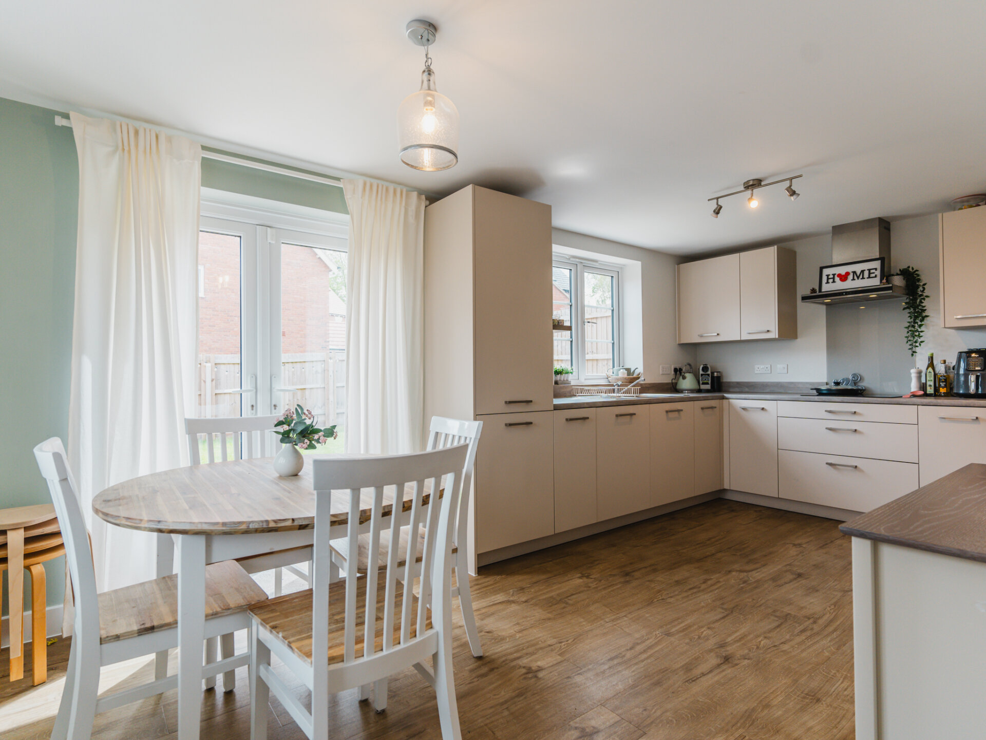 The heart of the home lies in the spacious kitchen dining room, offering delightful garden views through its window and French doors. Equipped with modern cabinetry and integrated appliances, including a fridge/freezer, dishwasher, oven, combi oven and induction hob, this space is perfect for culinary enthusiasts and family gatherings. There's ample room for a six-seat dining table, creating the perfect setting for shared meals and memorable moments.