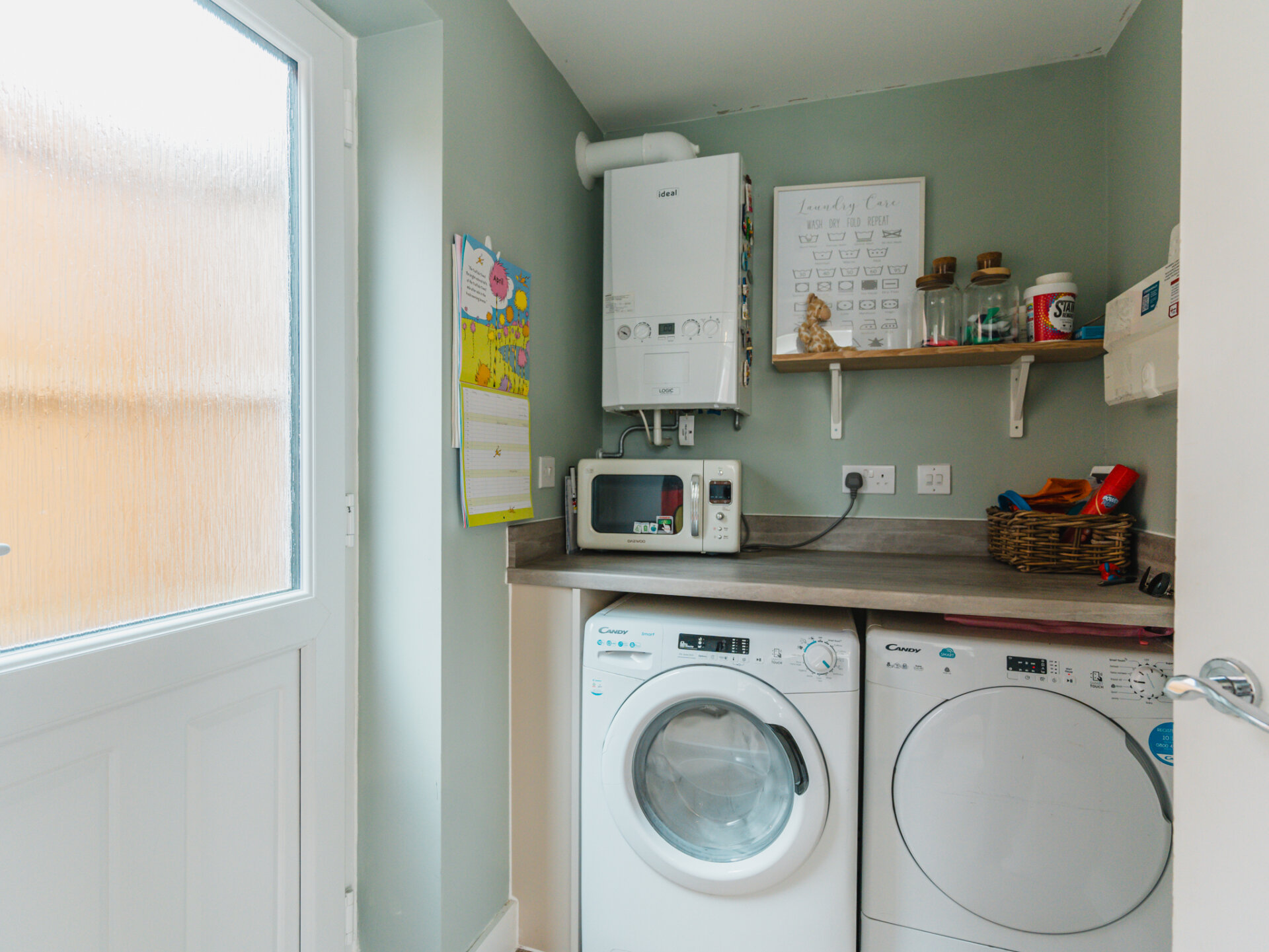 Adjacent to the kitchen is the utility room, providing practicality and additional storage space, along with provisions for a washing machine and tumble dryer.