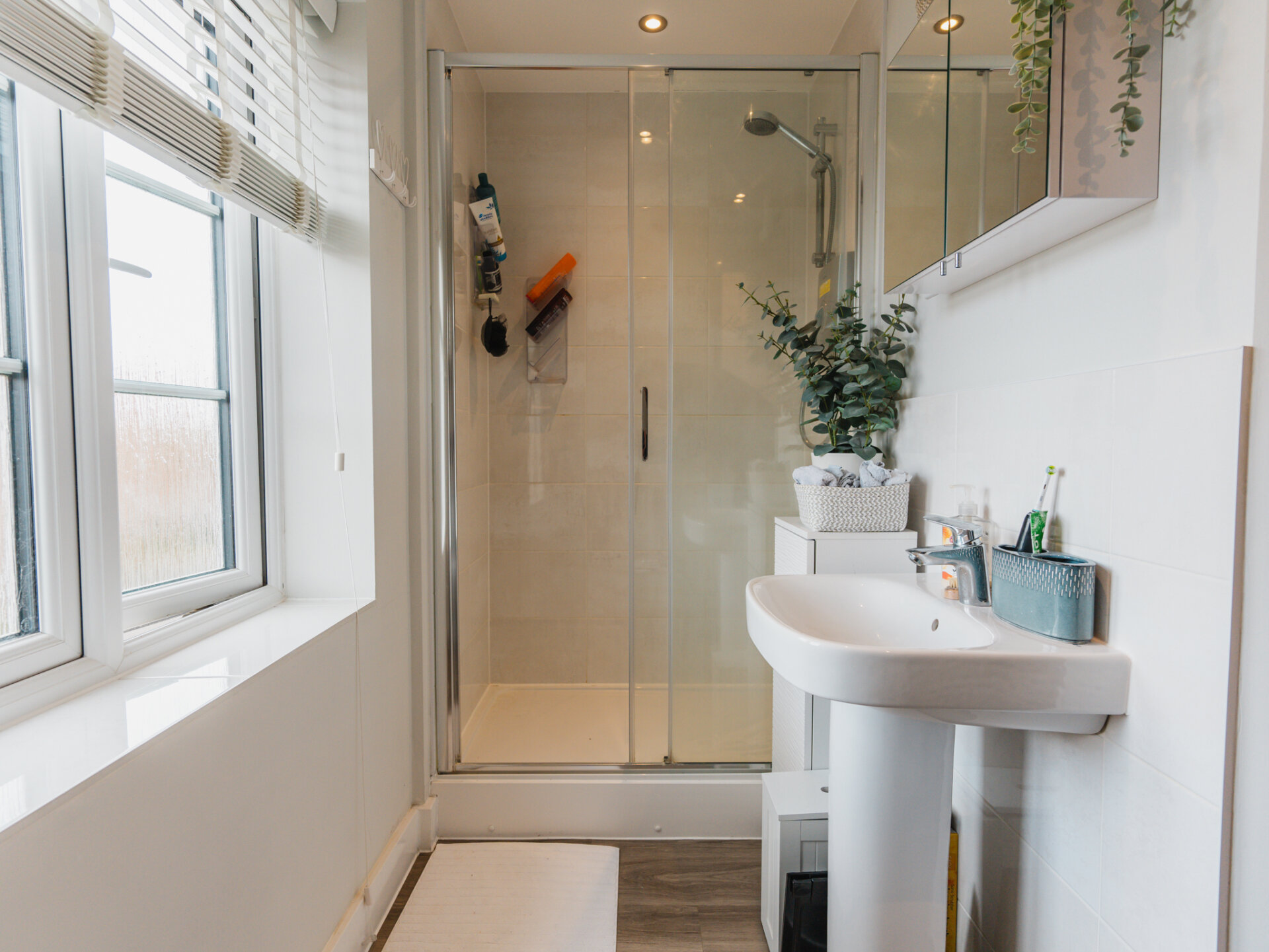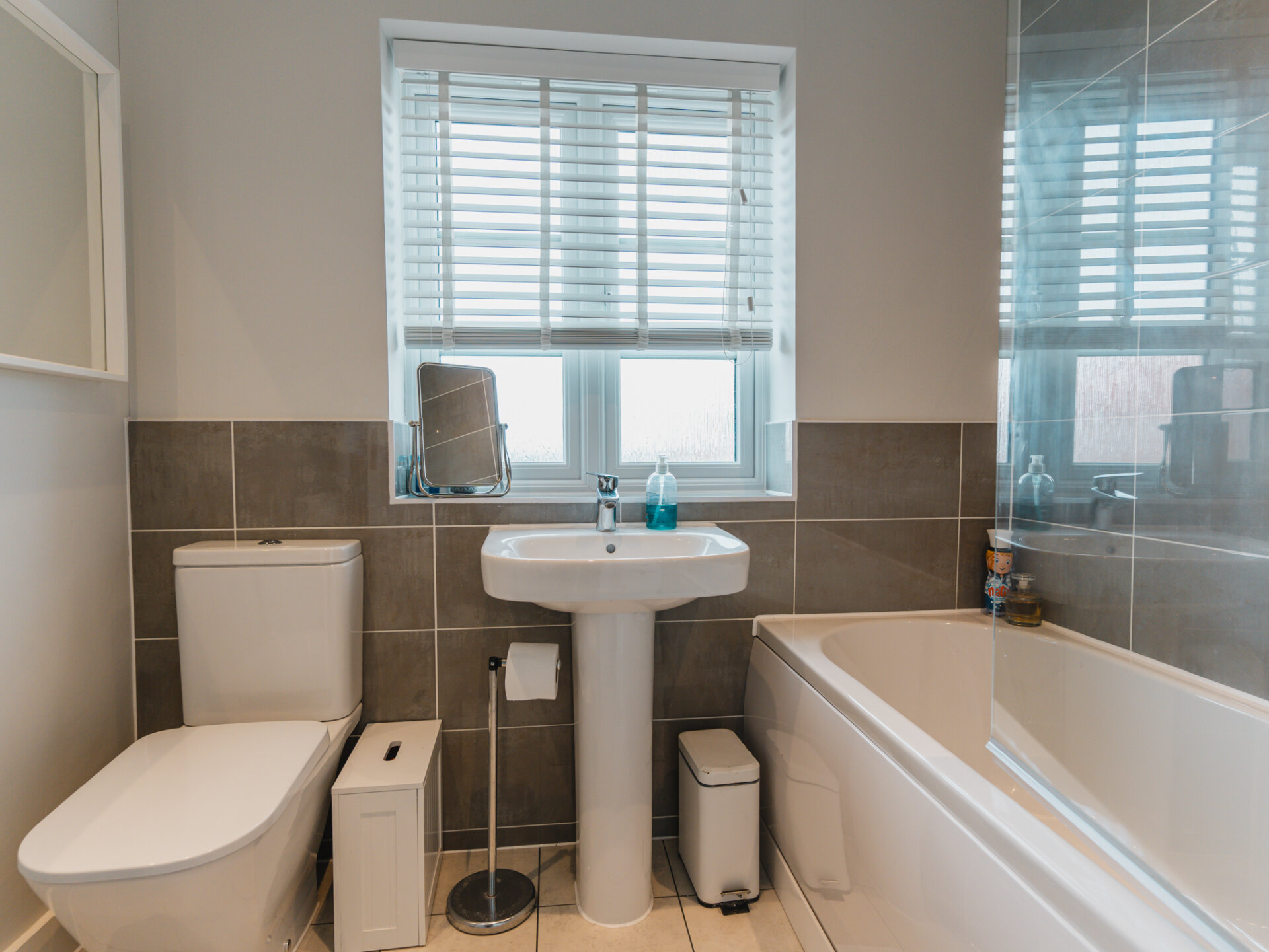The family bathroom, adorned with a modern white suite, features a bath with shower overhead, WC, and pedestal basin, providing convenience and style.