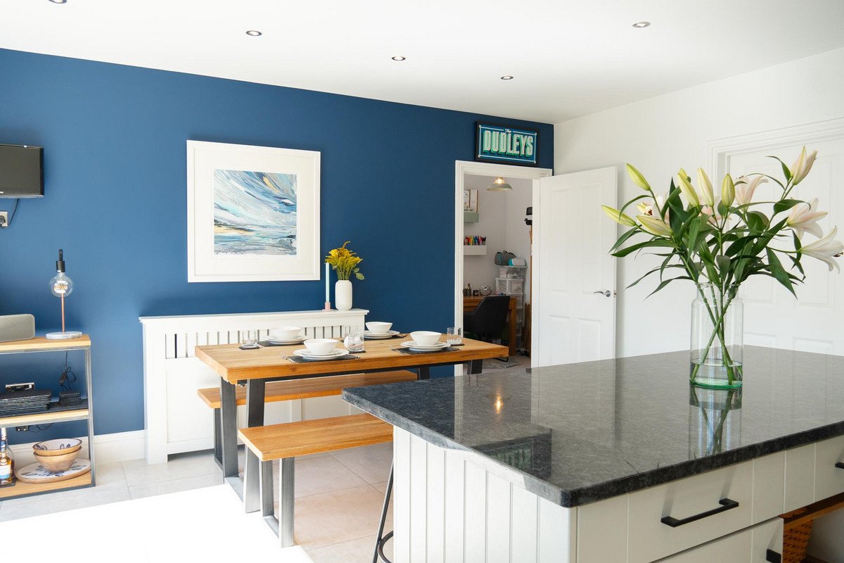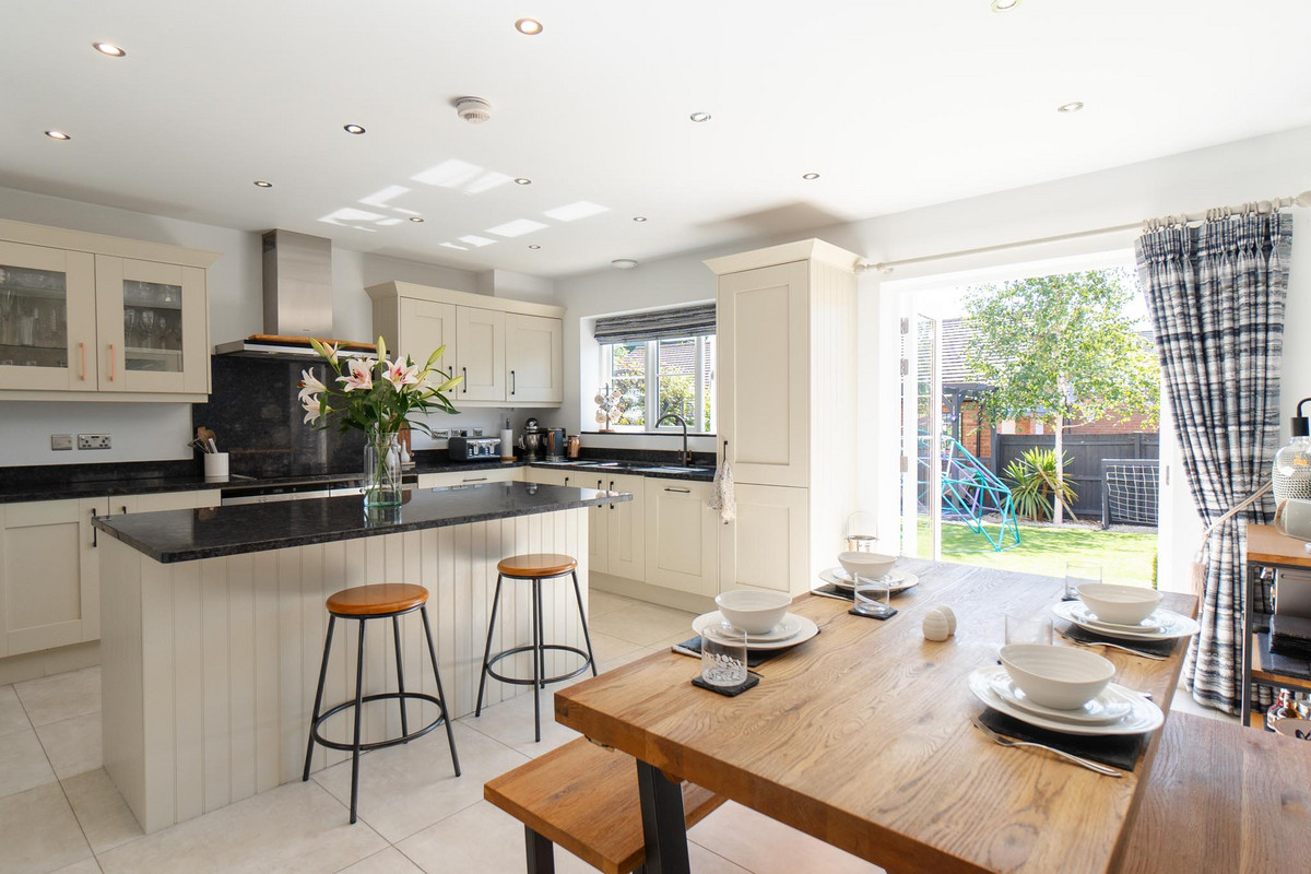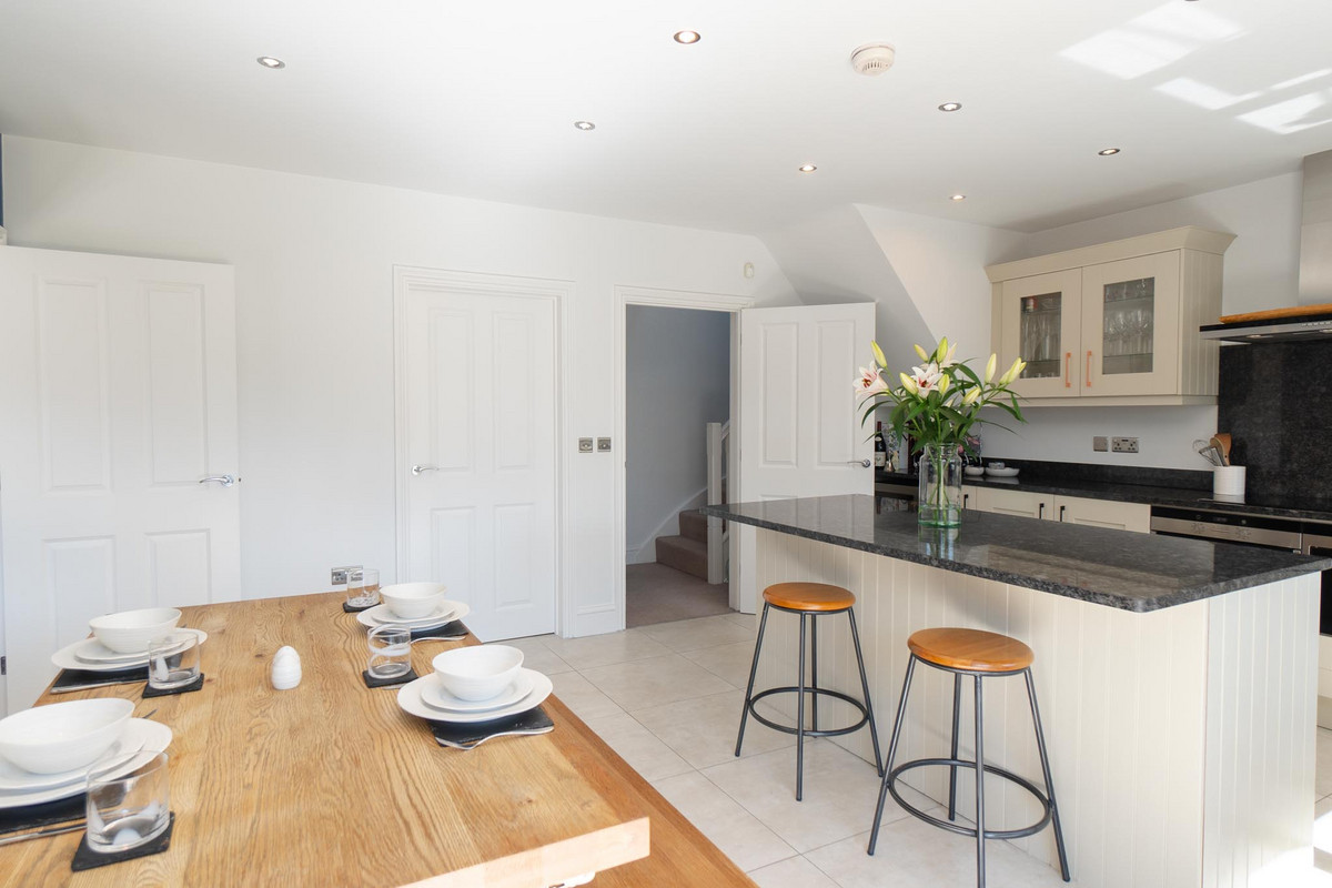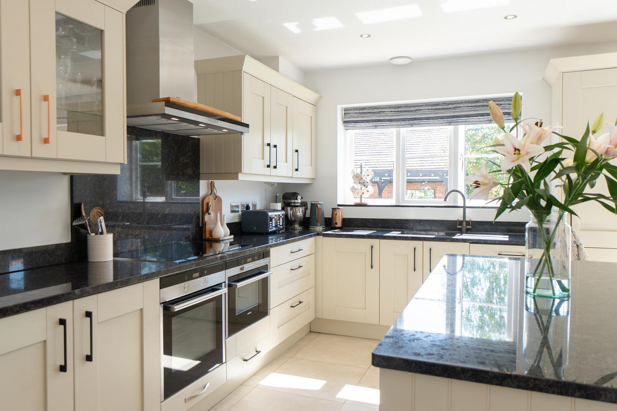 The heart of the home is the open-plan living dining kitchen, a spacious area overlooking the garden. The kitchen itself offers a stylish array of base and eye level units adorned with premium granite work surfaces. A matching island unit serves as both a practical workspace and a breakfast bar. Integrated Siemens appliances, including an induction hob, oven, microwave/combination oven, dishwasher, and fridge freezer, cater to the needs of a family or anyone who enjoys cooking in a great space! Tiled flooring extends throughout this area, and French doors again connect the dining area to the garden, perfect for entertaining in summer months.