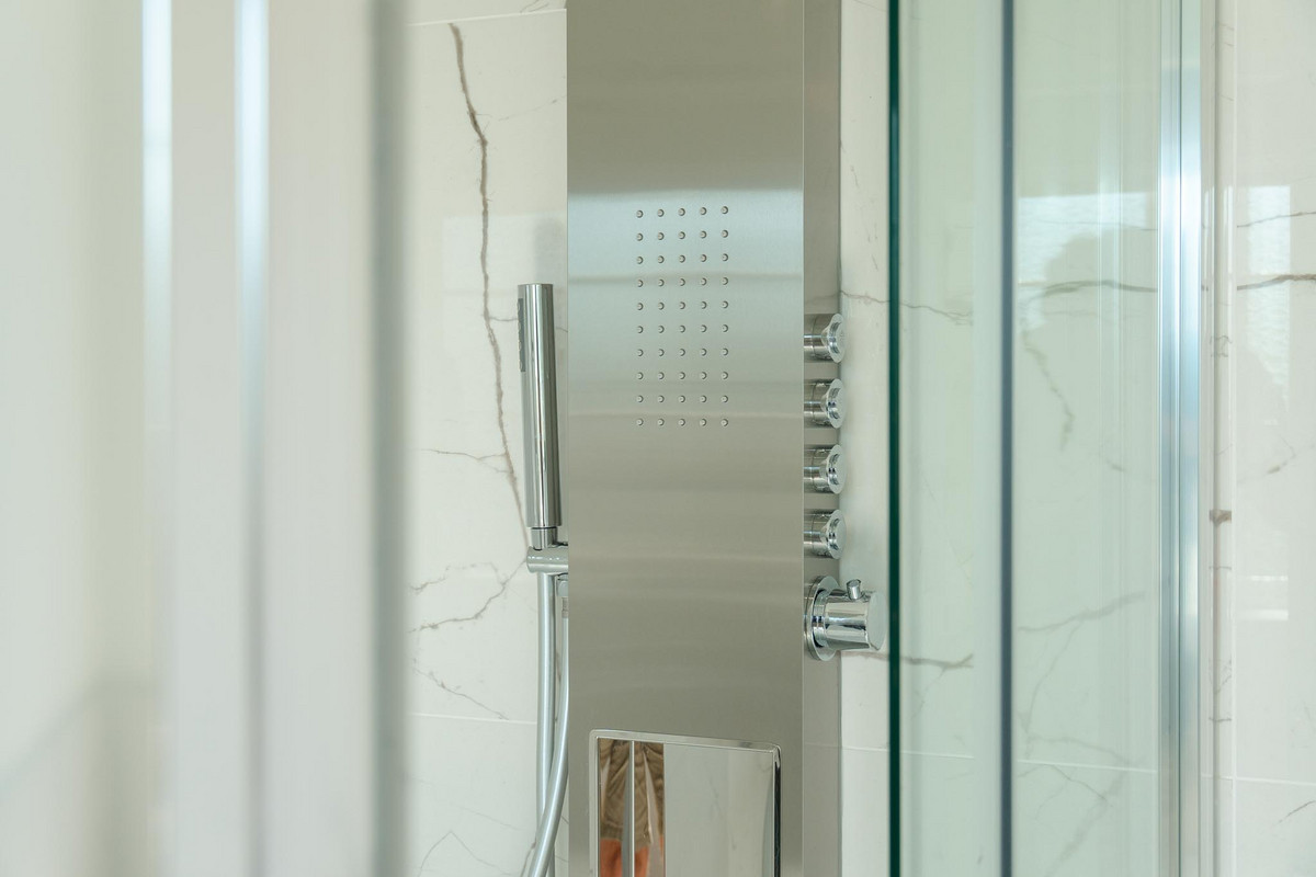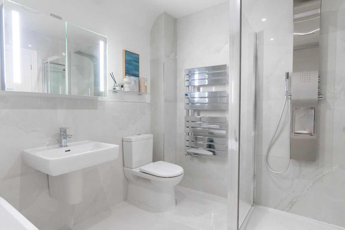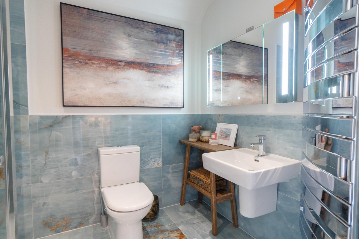 The bathroom & ensuite’s offer a spa-like experience with some waterfall tower showers, body jets, heated towel rails. Above the washbasins, are large LED mirror cabinets with Bluetooth speakers adding a touch of luxury modern convenience. The en-suite is adorned with aqua blue polished tiles, elevating the overall aesthetic.