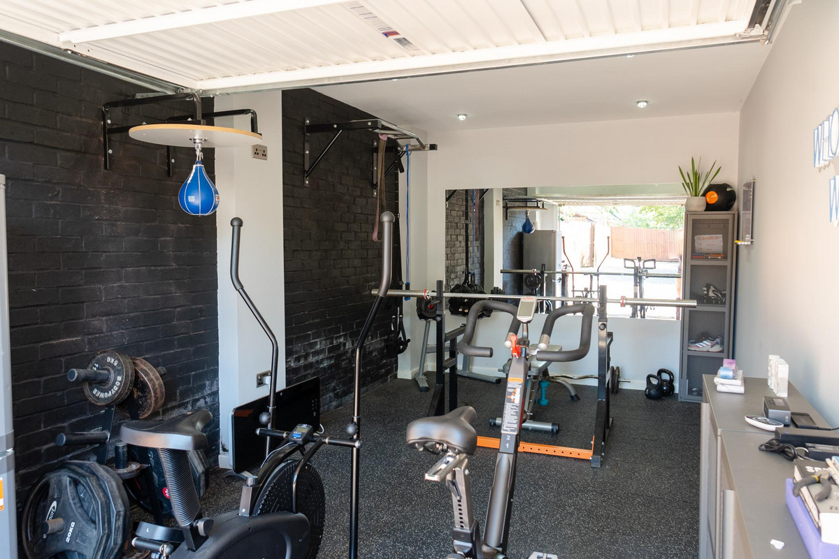 A charming frontage welcomes you as you approach the home, and the driveway, leading through an archway, reveals the double garage currently split in two with one side utilised as a gymnasium.