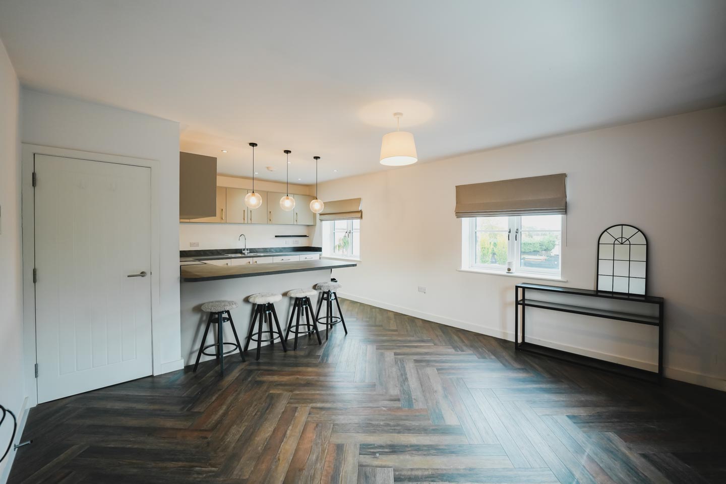 From the modern entrance, Flat 4 is located on the first floor, offering privacy as well as pleasant views. Stepping into the hallway you instantly gain a sense of the quality of this premium apartment, leading in to open plan living space designed for comfort and practicality. The living/dining kitchen is a welcoming, a dual aspect room filled with natural light, finished with stylish flooring and the warmth of underfloor heating. The kitchen itself is fitted with a range of quality units and integrated appliances, including an electric oven, hob, dishwasher, and washer-dryer, as well as a large breakfast bar with plenty of space for seating beneath.