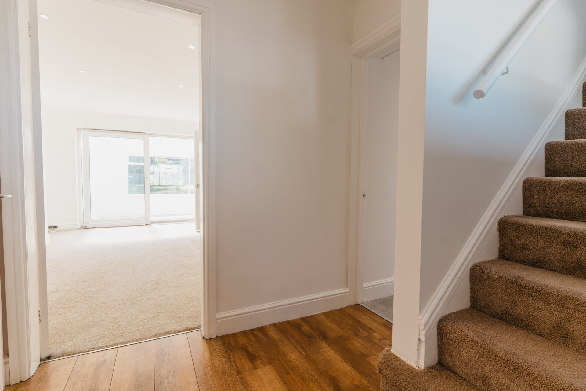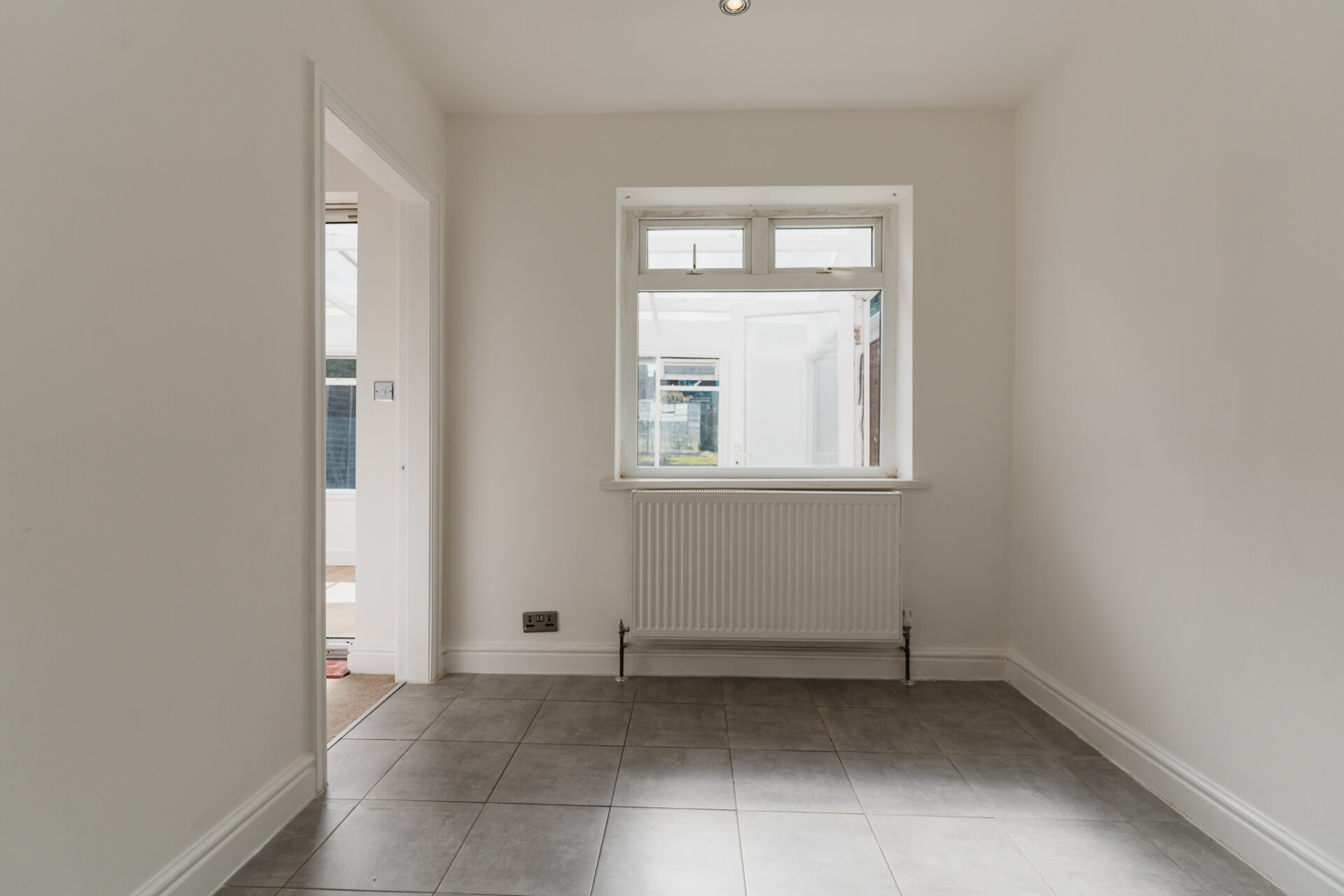 A wide, welcoming hallway sets the tone for the interiors beyond, where an understated, neutral palette complements the abundant natural light throughout. To the front, the living room is wonderfully proportioned, with a broad picture window framing verdant views of the front garden and inviting in the morning sun. At the rear, a separate dining area enjoys a peaceful garden outlook and offers a natural space for entertaining. The adjoining kitchen is both practical and well-designed, fitted with sleek cabinetry and providing ample room for freestanding appliances. Beyond, a generous lean-to conservatory offers a year-round connection to the garden, with glazing on all sides drawing in the greenery and light.