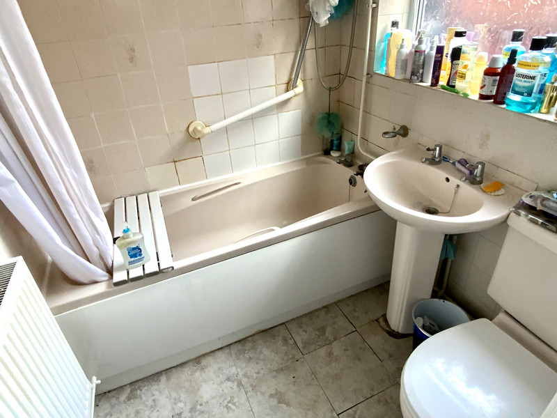 The three piece bathroom suite comprises; panelled bath with shower over, pedestal sink and w.c., window to the side.