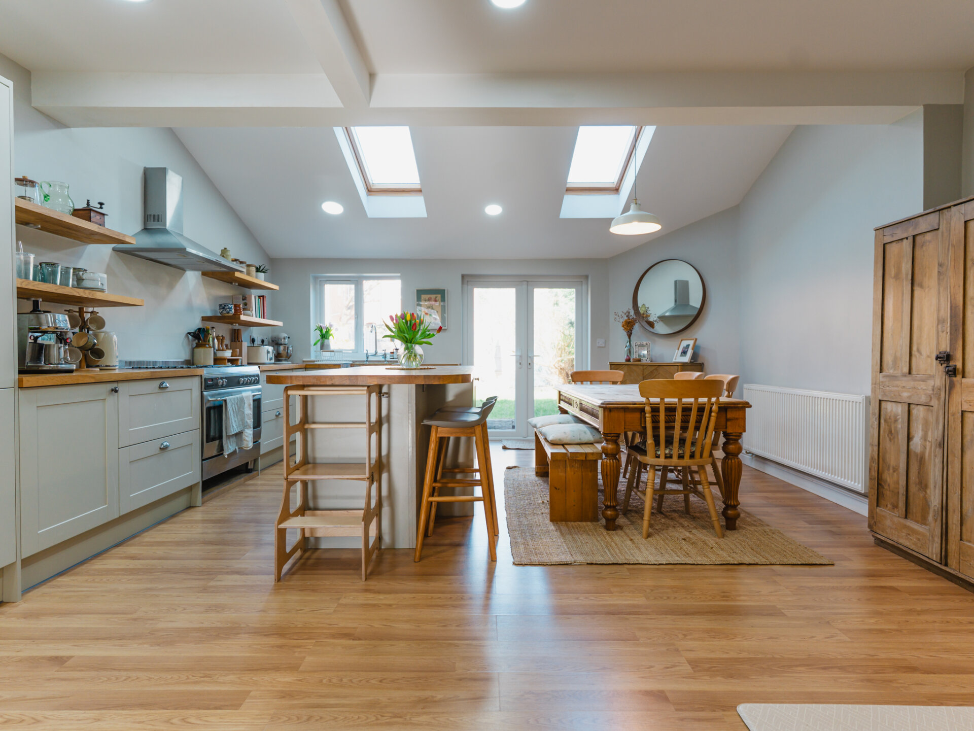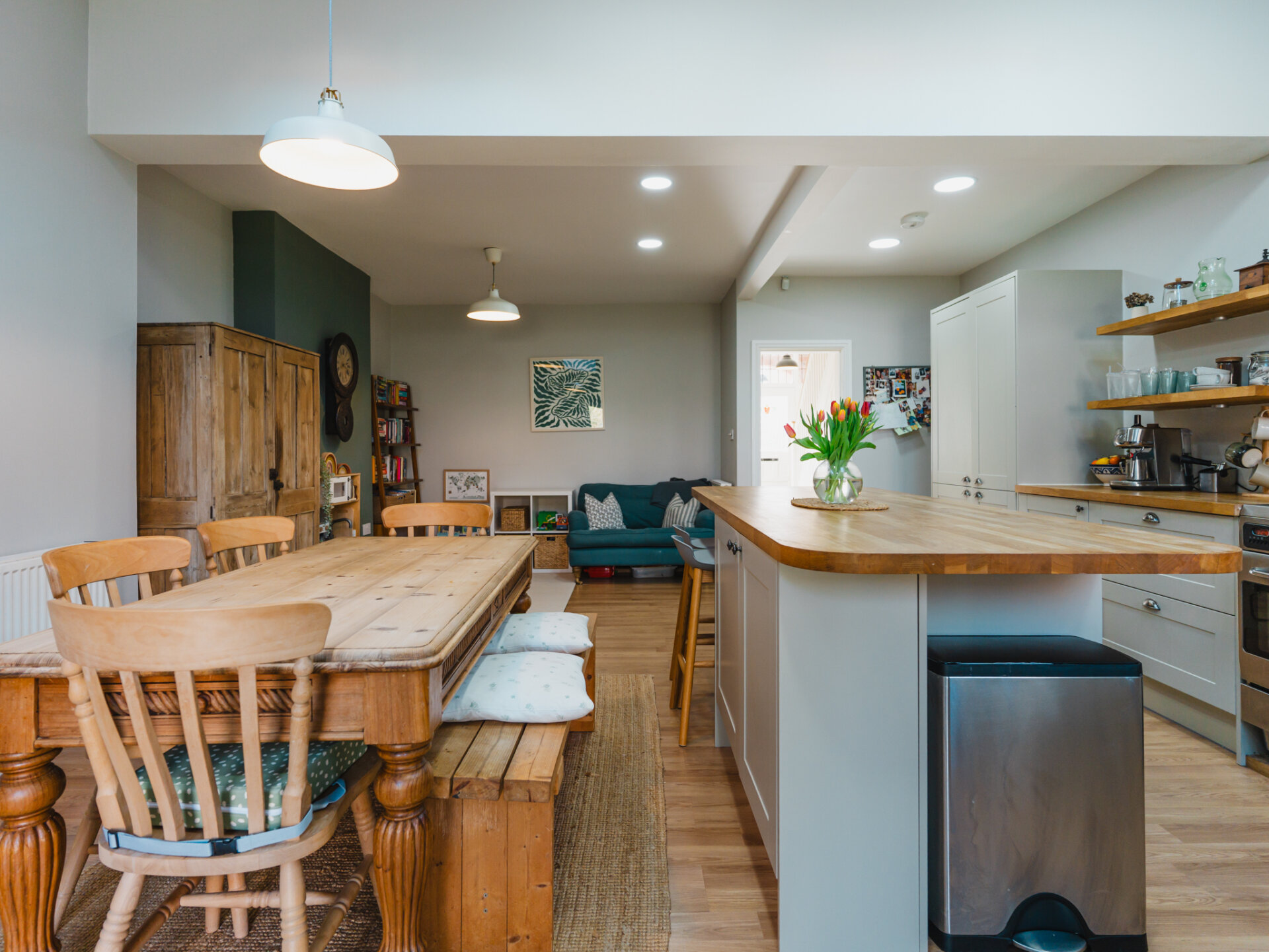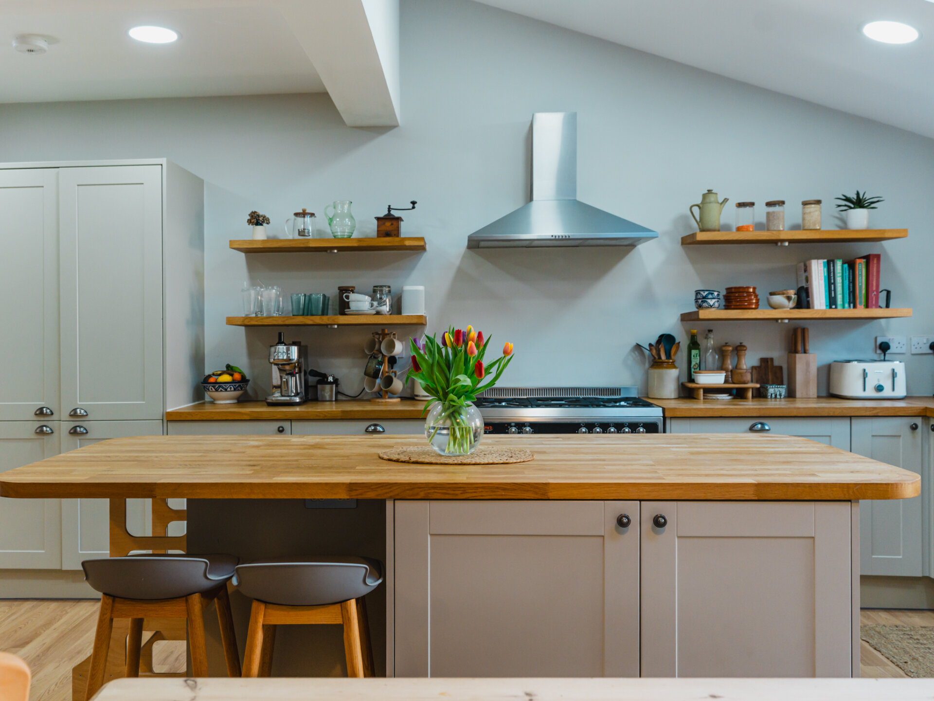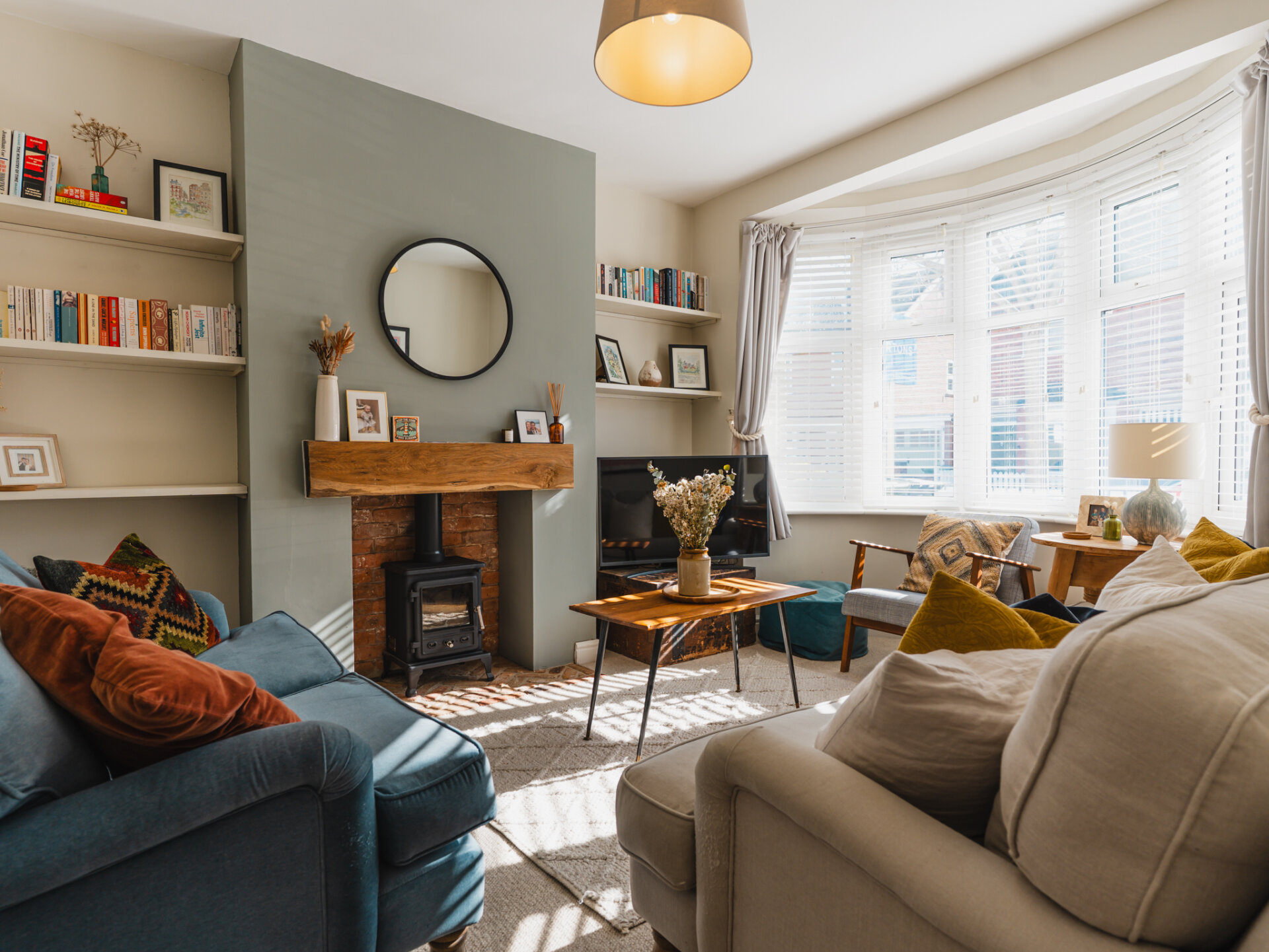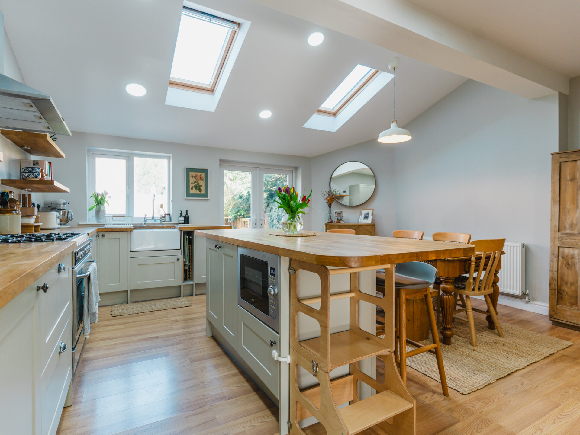A natural stone pathway leads to a composite leaded stained-glass front door, opening into a spacious entrance hall with Victorian-inspired tiling. The principal reception at the front features a bay window with bespoke shutter-blinds, providing immediate privacy. Built-in shelving and storage occupy the alcoves on either side of a newly fitted log-burner fireplace, creating a dramatic focal point that complements the tasteful colour palette of off-grey and teal blue. To the rear of the ground-floor accommodation, and arguably the standout feature of this fabulous home, is a beautifully presented open-plan breakfast kitchen, featuring hints of teal. Designed for both style and functionality while enabling a sociable space ideal for entertaining, the kitchen includes twin French doors that open to the rear, framing leafy views onto the north-facing garden and paired with twin skylights for an abundance of natural light. The kitchen boasts a Belfast sink with a mixer tap, a range of base units with pan storage, and a tall pull-out larder cupboard, all finished with sleek oak worktops. A matching island unit incorporates additional storage and a built-in microwave. Integrated appliances include a stainless steel range cooker, fridge, freezer, and dishwasher. Additional features include oak floating display shelves with down-lighters and modern oak flooring throughout. A conveniently positioned utility room offers uPVC doors to the rear garden and internal access to the garage. It includes plumbing for a washing machine, space for a condensing dryer, an oak worktop, a wall-mounted unit, a tall laundry/storage cupboard, and a wall-mounted gas boiler, all complemented by a limestone-style tiled floor. A downstairs WC completes the ground-floor accommodation on offer.