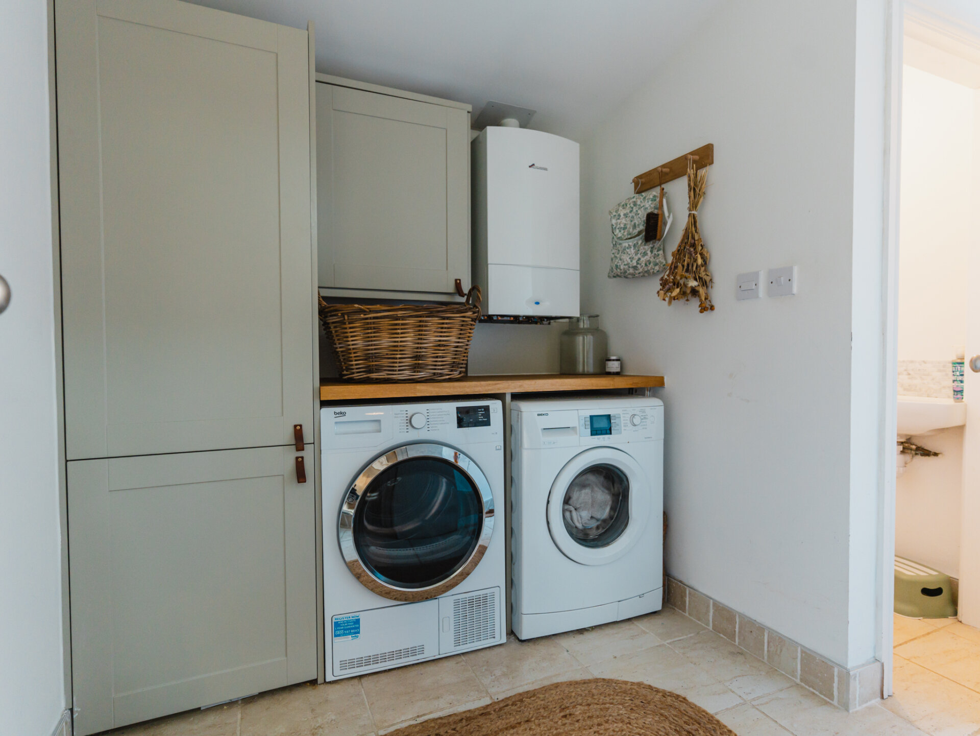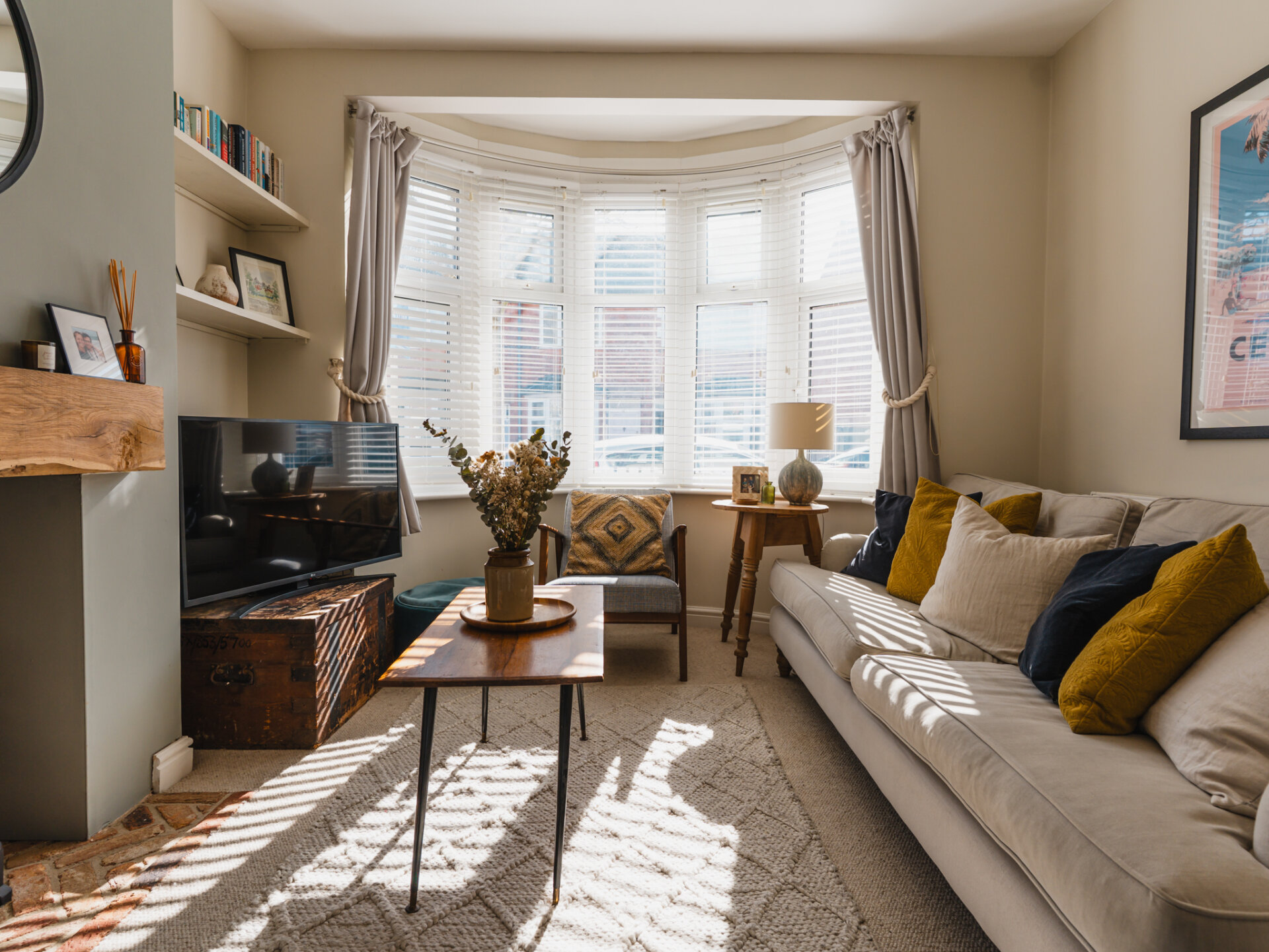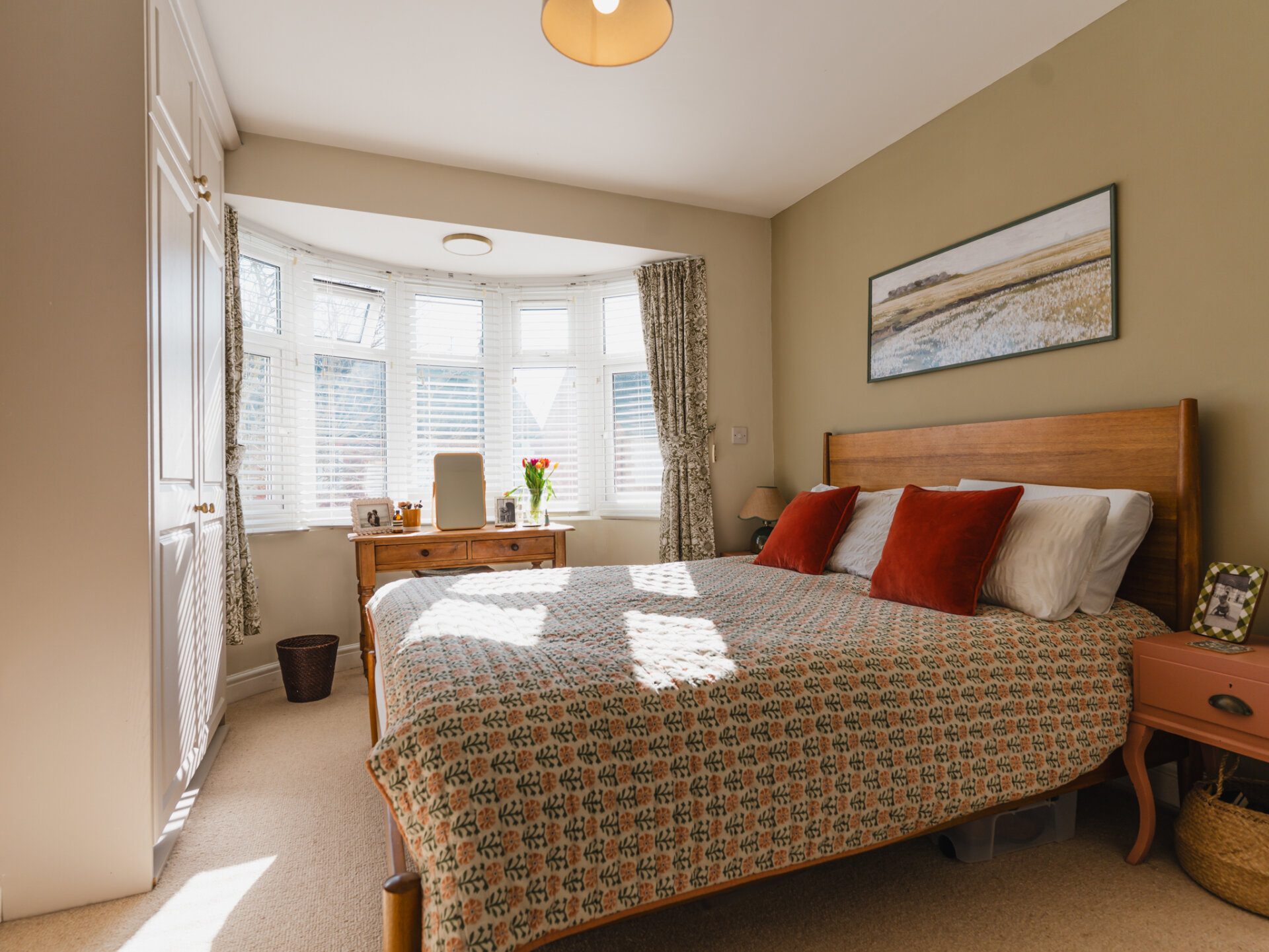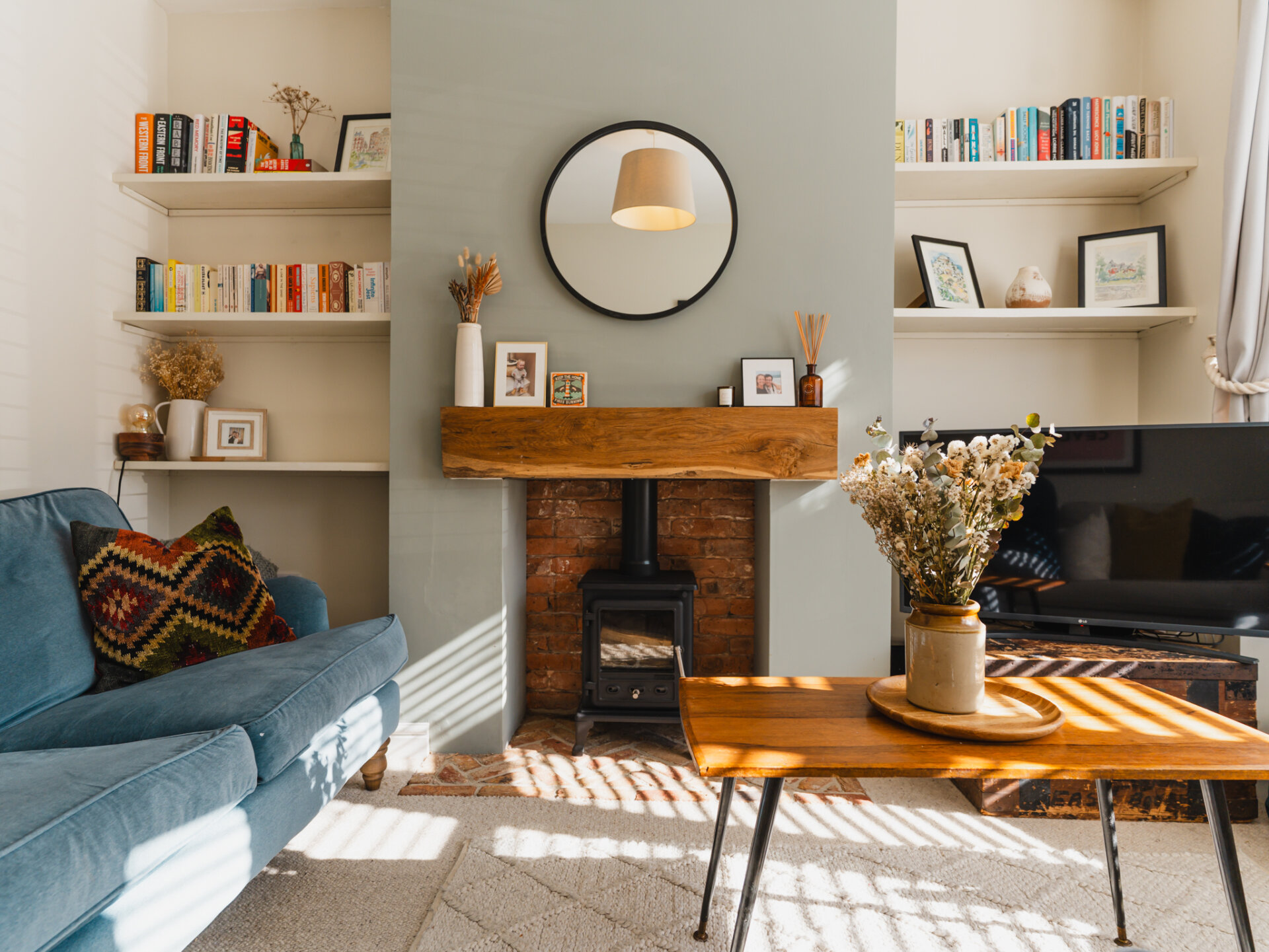 A natural stone pathway leads to a composite leaded stained-glass front door, opening into a spacious entrance hall with Victorian-inspired tiling. The principal reception at the front features a bay window with bespoke shutter-blinds, providing immediate privacy. Built-in shelving and storage occupy the alcoves on either side of a newly fitted log-burner fireplace, creating a dramatic focal point that complements the tasteful colour palette of off-grey and teal blue. To the rear of the ground-floor accommodation, and arguably the standout feature of this fabulous home, is a beautifully presented open-plan breakfast kitchen, featuring hints of teal. Designed for both style and functionality while enabling a sociable space ideal for entertaining, the kitchen includes twin French doors that open to the rear, framing leafy views onto the north-facing garden and paired with twin skylights for an abundance of natural light. The kitchen boasts a Belfast sink with a mixer tap, a range of base units with pan storage, and a tall pull-out larder cupboard, all finished with sleek oak worktops. A matching island unit incorporates additional storage and a built-in microwave. Integrated appliances include a stainless steel range cooker, fridge, freezer, and dishwasher. Additional features include oak floating display shelves with down-lighters and modern oak flooring throughout. A conveniently positioned utility room offers uPVC doors to the rear garden and internal access to the garage. It includes plumbing for a washing machine, space for a condensing dryer, an oak worktop, a wall-mounted unit, a tall laundry/storage cupboard, and a wall-mounted gas boiler, all complemented by a limestone-style tiled floor. A downstairs WC completes the ground-floor accommodation on offer.