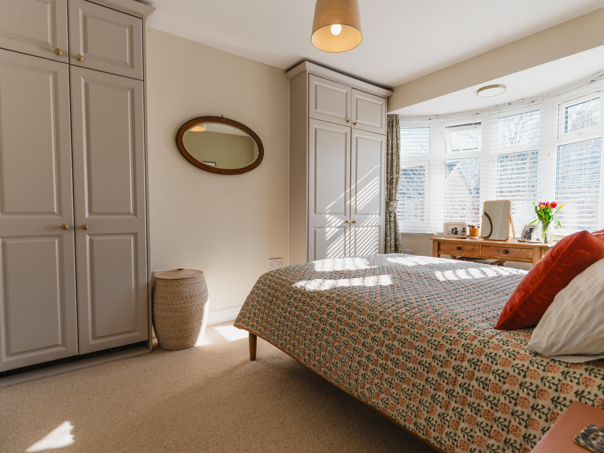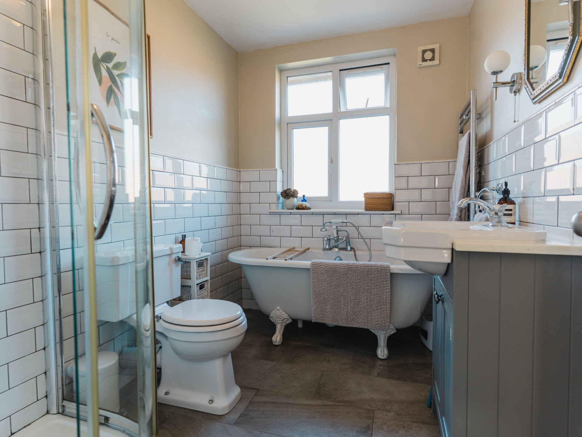 The second floor is well-configured with three bedrooms, serviced by a four-piece family bathroom with a roll-top bath. The largest bedroom is set at the front of the first floor, beautifully light and airy, complete with fitted wardrobes and plush wool carpets. A second bedroom overlooks the rear garden, also complete with fitted wardrobes and plush wool carpets. A third, smaller bedroom lies adjacent to the principal room at the front. A traditional, beautifully designed four-piece family bathroom boasts art-deco inspired lighting, a roll-top bath with a separate shower, completing the accommodation.