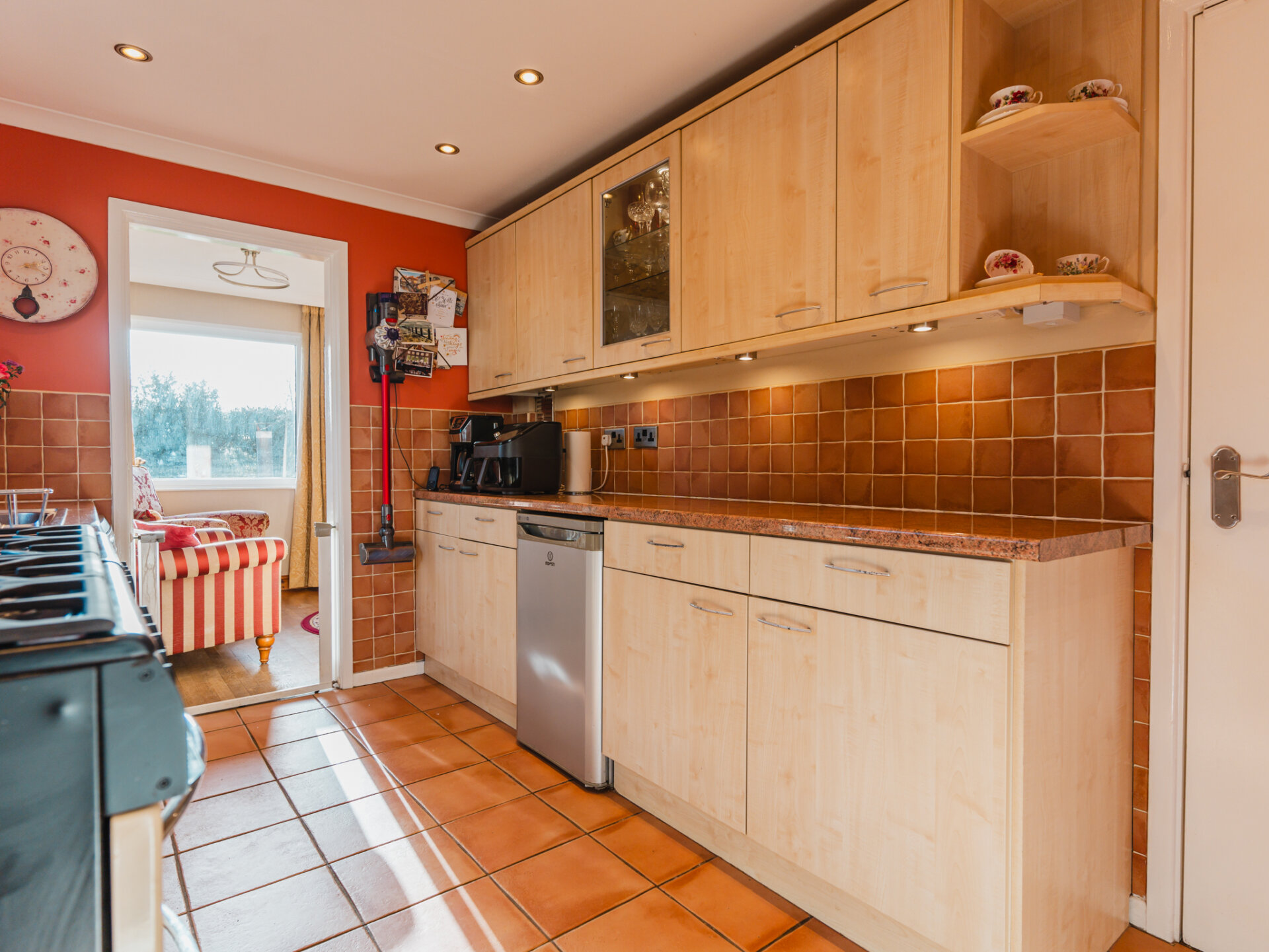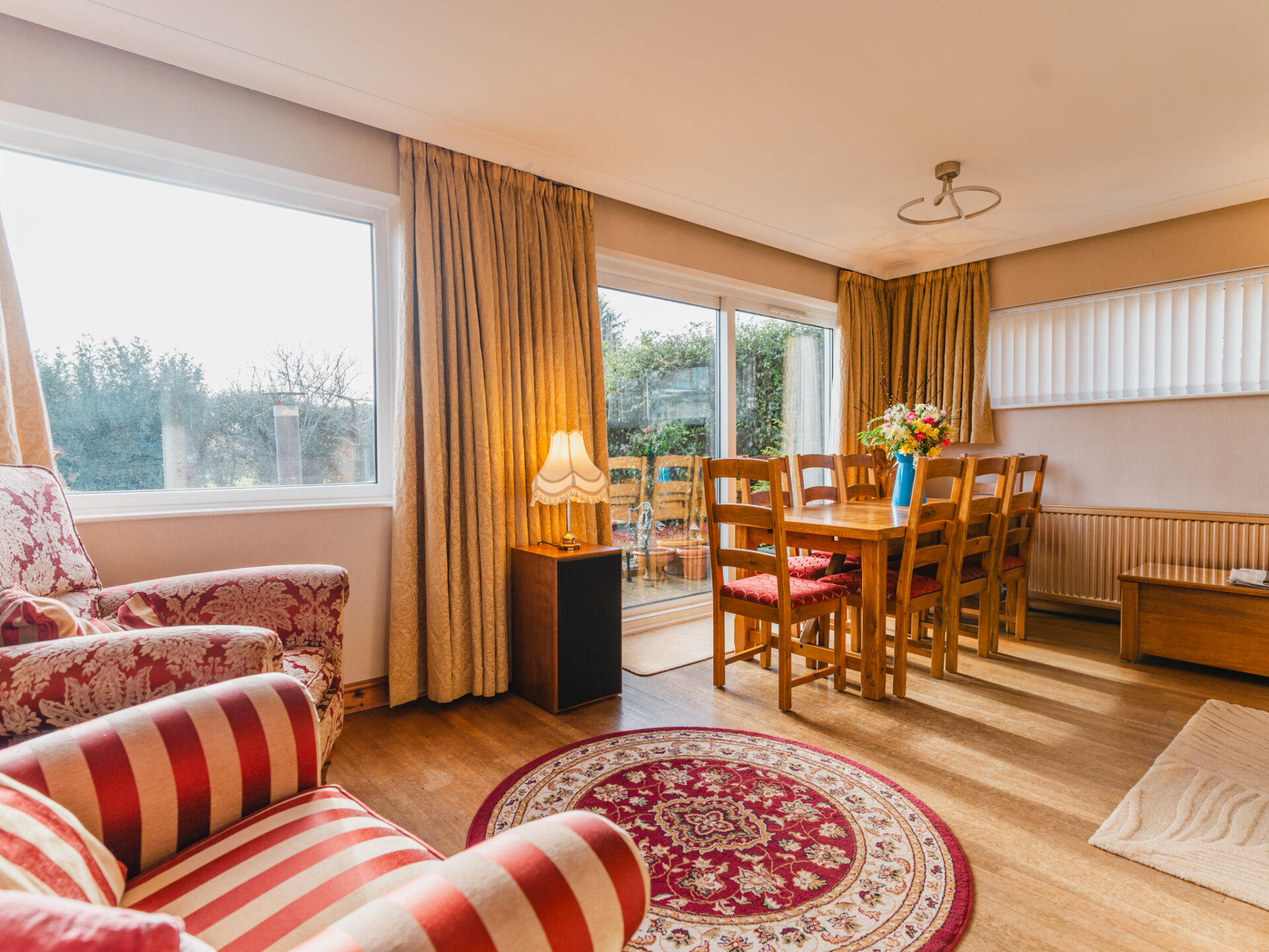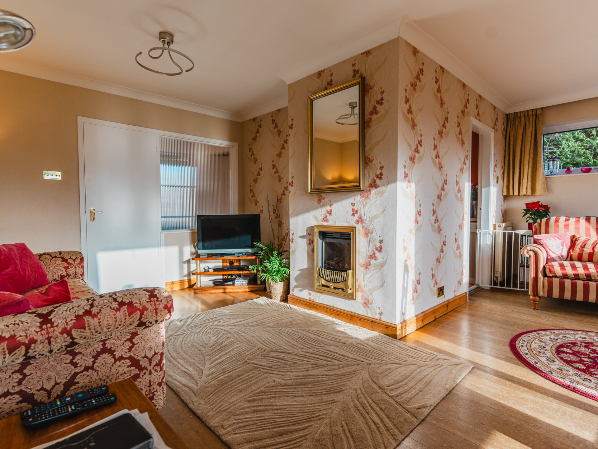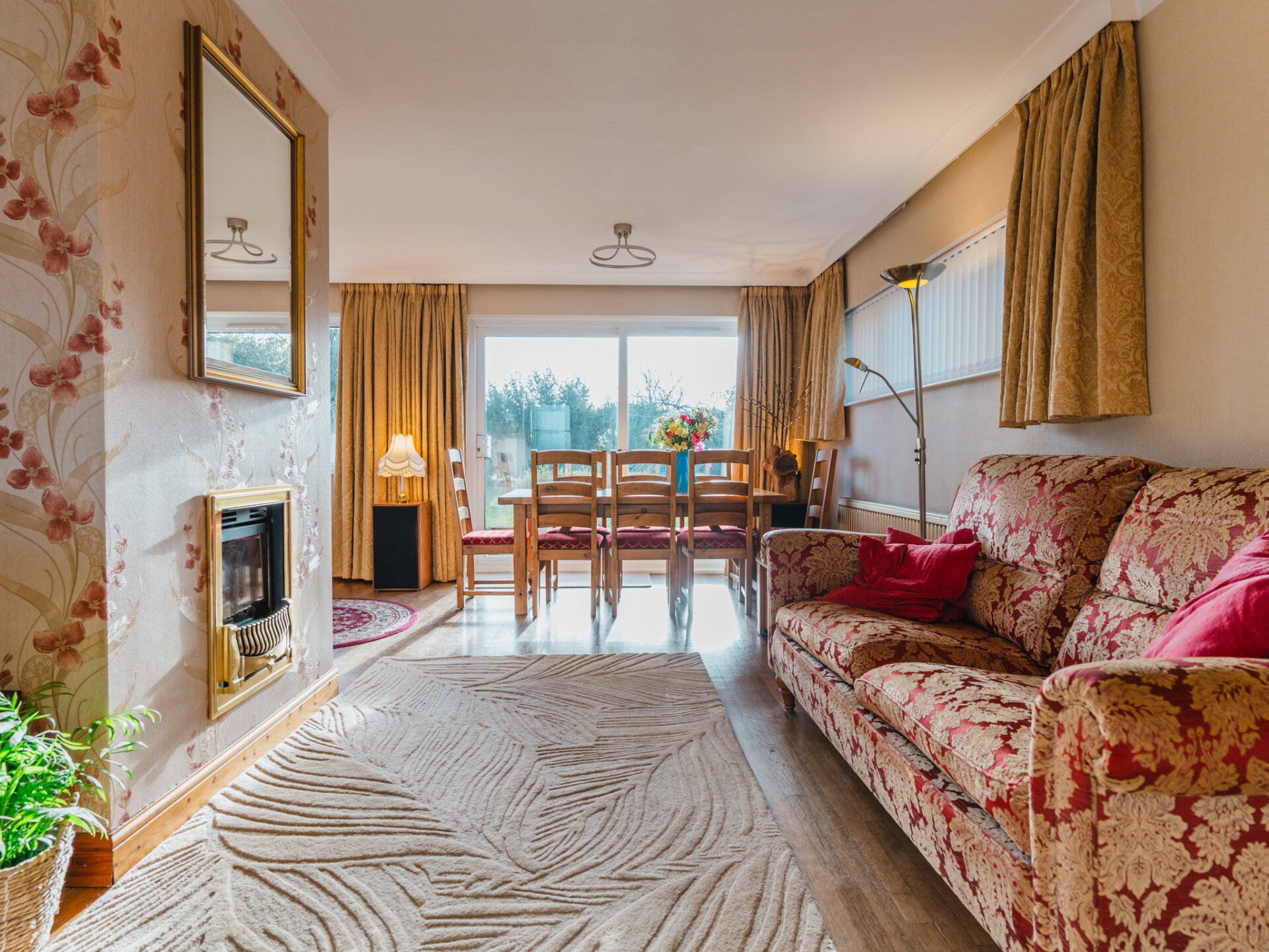 The property’s kerb appeal is immediately evident, with its commanding position at the end of the cul-de-sac complemented by off-road parking for at least two vehicles and a garage, which could be adapted to suit contemporary needs. Upon entering, the wide and welcoming entrance porch leads into a generously proportioned hallway, featuring oak flooring and a neatly positioned WC for added convenience. To the rear of the home, the open-plan living and dining room is bathed in natural light, thanks to double-glazed sliding patio doors that frame a leafy aspect of the landscaped South-facing garden. The combination of stripped oak flooring and a coal-effect gas fire creates a sophisticated yet cosy ambience. The breakfast kitchen is thoughtfully designed, with an extensive range of wall and base units, ample worktop space, and plumbing provisions for essential appliances. A discreet pantry offers additional storage, while doors leading to the side passage and rear garden enhance the practicality of the layout. This area holds significant potential for extension or reconfiguration to create a larger, contemporary kitchen-diner.
