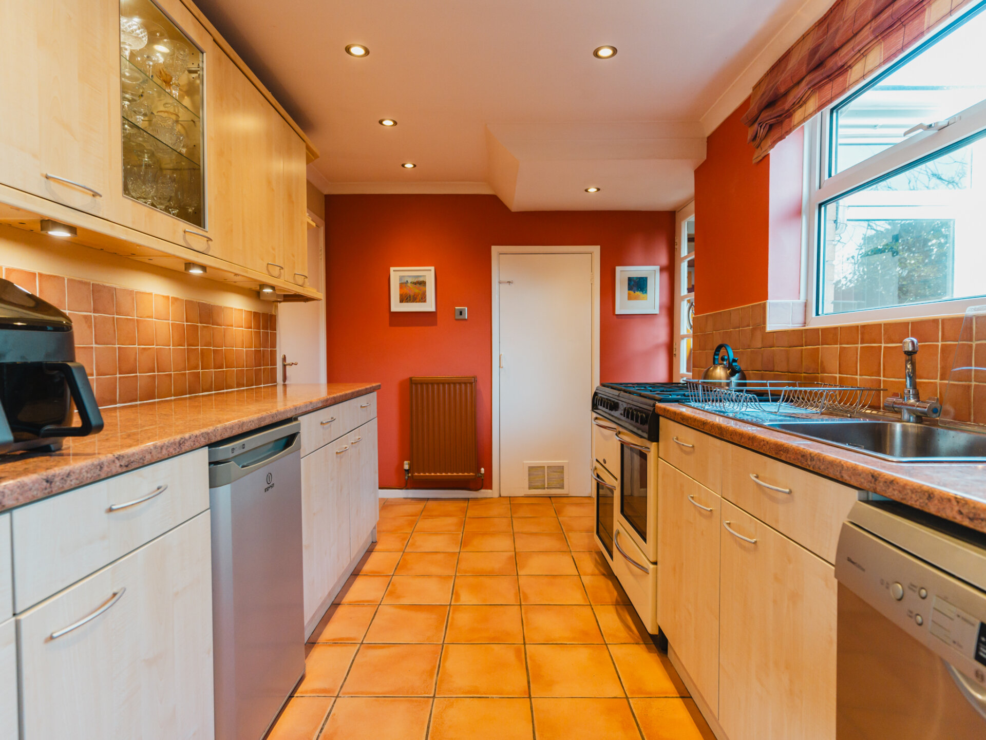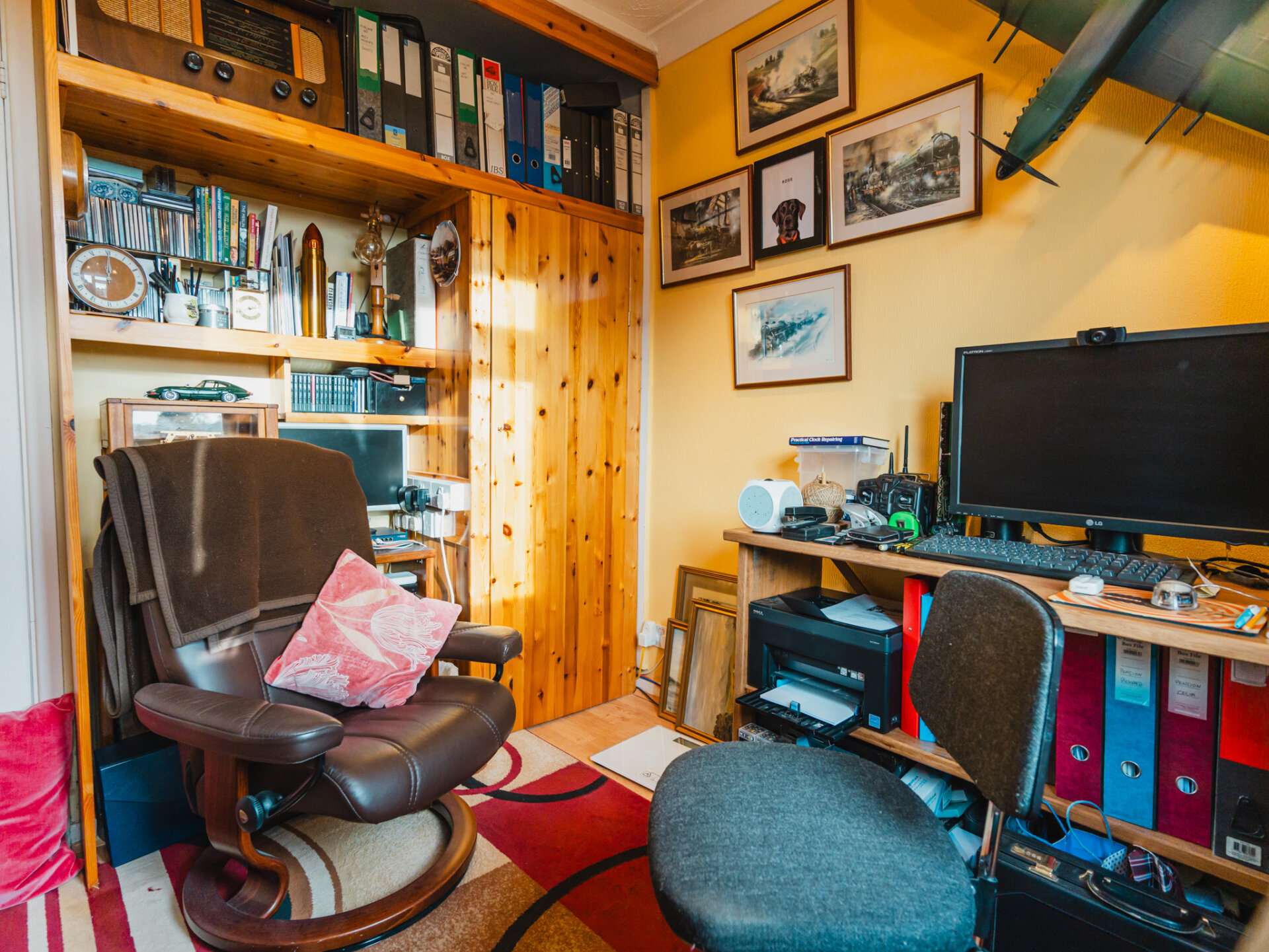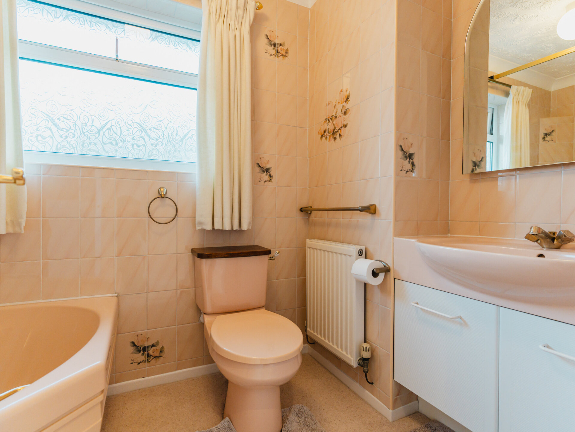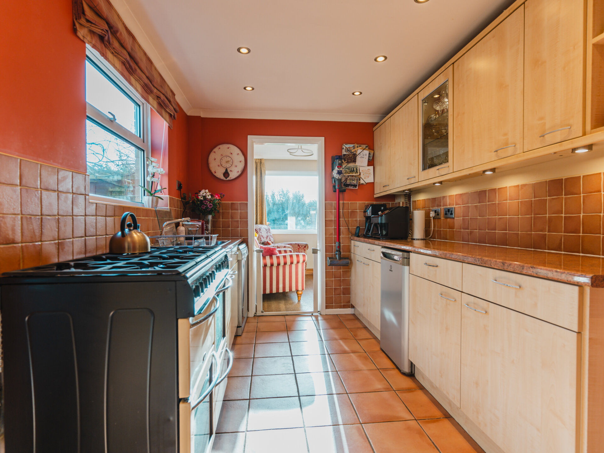 The property’s kerb appeal is immediately evident, with its commanding position at the end of the cul-de-sac complemented by off-road parking for at least two vehicles and a garage, which could be adapted to suit contemporary needs. Upon entering, the wide and welcoming entrance porch leads into a generously proportioned hallway, featuring oak flooring and a neatly positioned WC for added convenience. To the rear of the home, the open-plan living and dining room is bathed in natural light, thanks to double-glazed sliding patio doors that frame a leafy aspect of the landscaped South-facing garden. The combination of stripped oak flooring and a coal-effect gas fire creates a sophisticated yet cosy ambience. The breakfast kitchen is thoughtfully designed, with an extensive range of wall and base units, ample worktop space, and plumbing provisions for essential appliances. A discreet pantry offers additional storage, while doors leading to the side passage and rear garden enhance the practicality of the layout. This area holds significant potential for extension or reconfiguration to create a larger, contemporary kitchen-diner.
