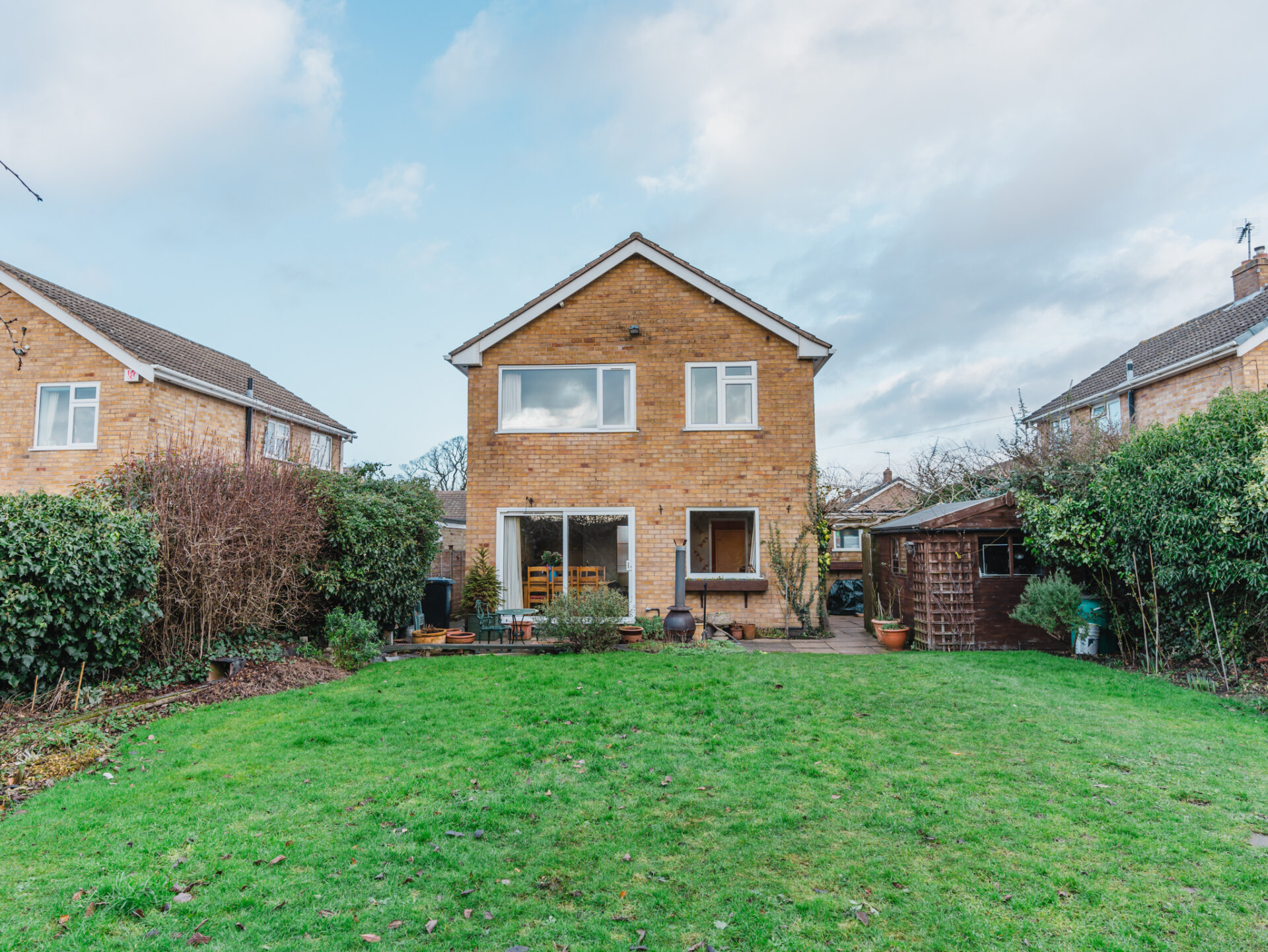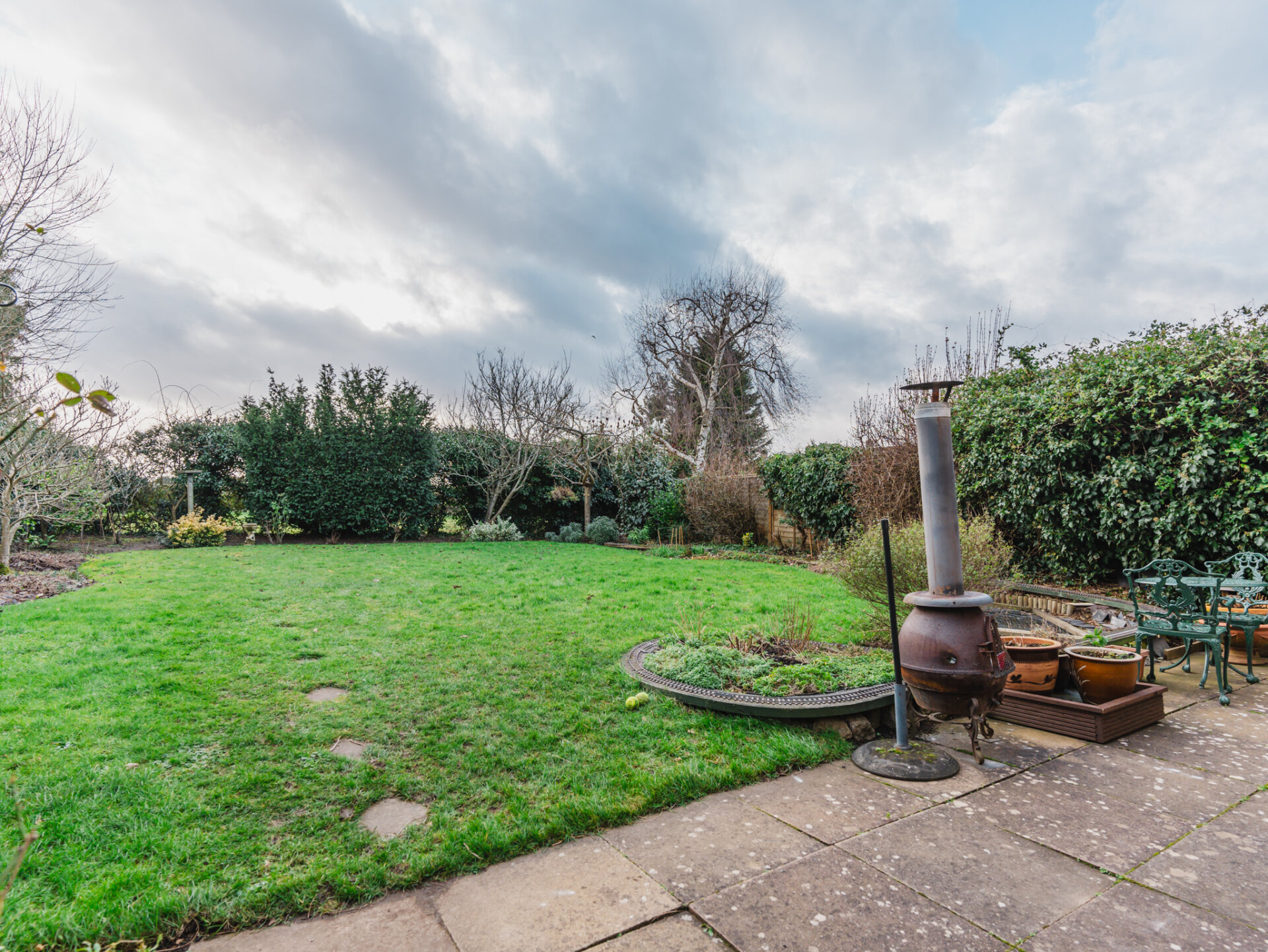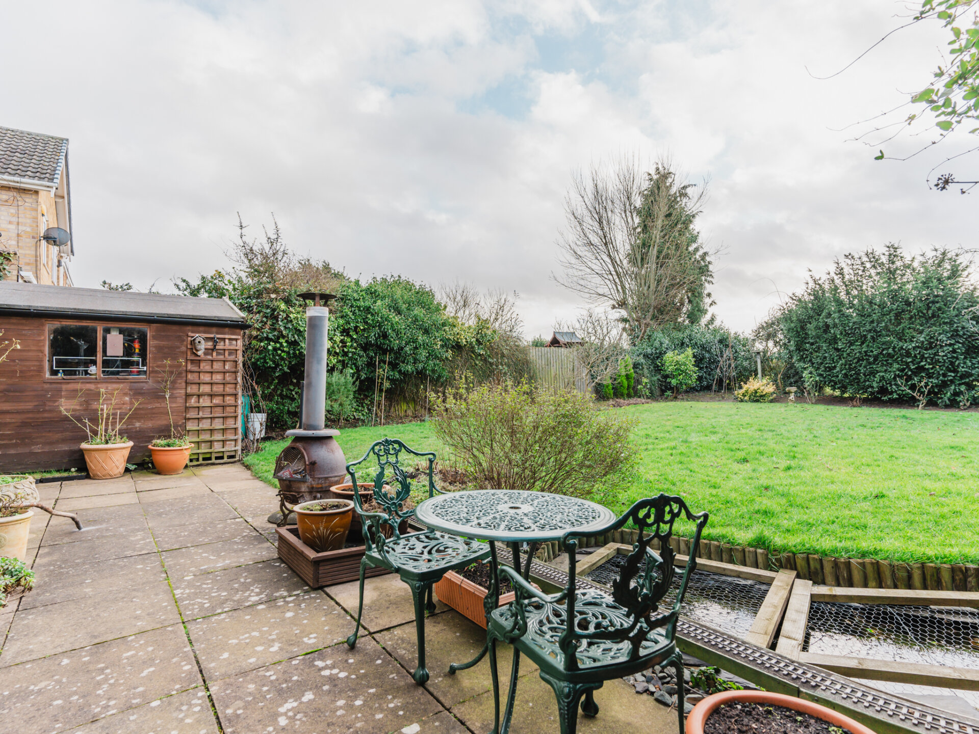 Externally, the south-facing rear garden is a true highlight. Impeccably maintained, it features a manicured lawn bordered by mature trees and shrubs, offering a high degree of privacy. Two distinct patio areas provide idyllic settings for outdoor dining or relaxation. To the front, the driveway accommodates at least two vehicles, while a neatly tended lawn adds to the property’s overall charm.