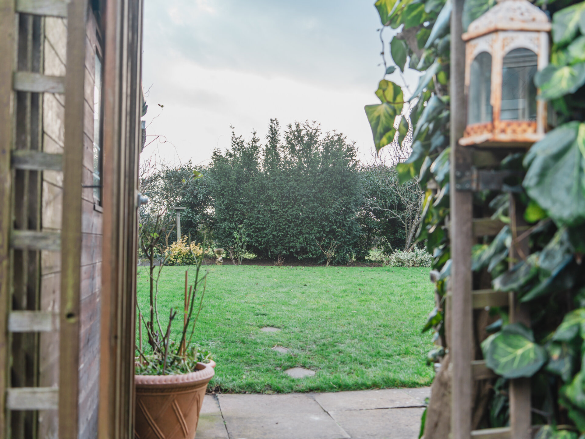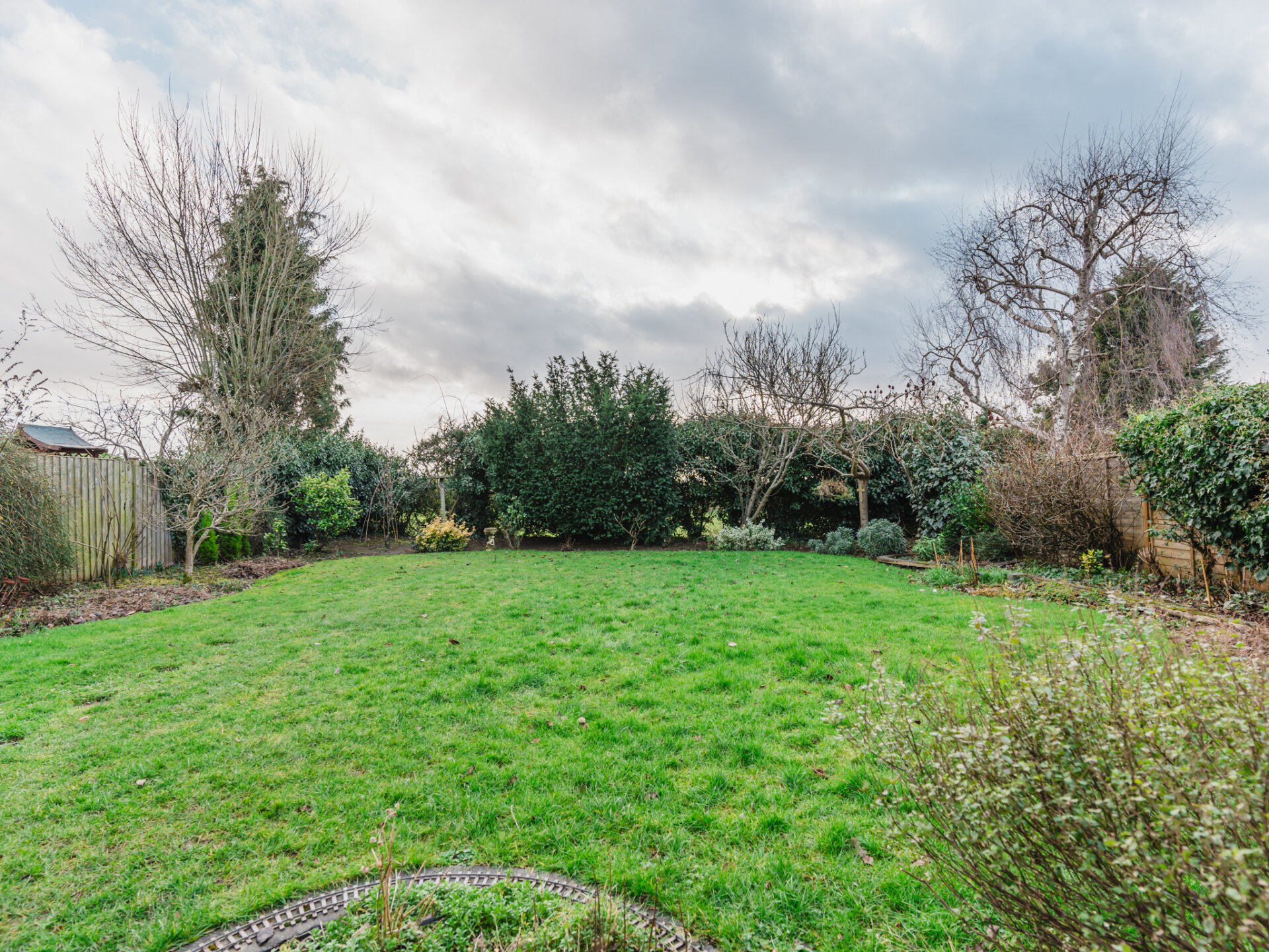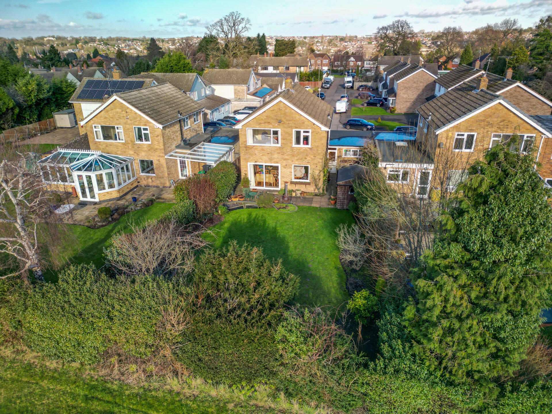 Externally, the south-facing rear garden is a true highlight. Impeccably maintained, it features a manicured lawn bordered by mature trees and shrubs, offering a high degree of privacy. Two distinct patio areas provide idyllic settings for outdoor dining or relaxation. To the front, the driveway accommodates at least two vehicles, while a neatly tended lawn adds to the property’s overall charm.