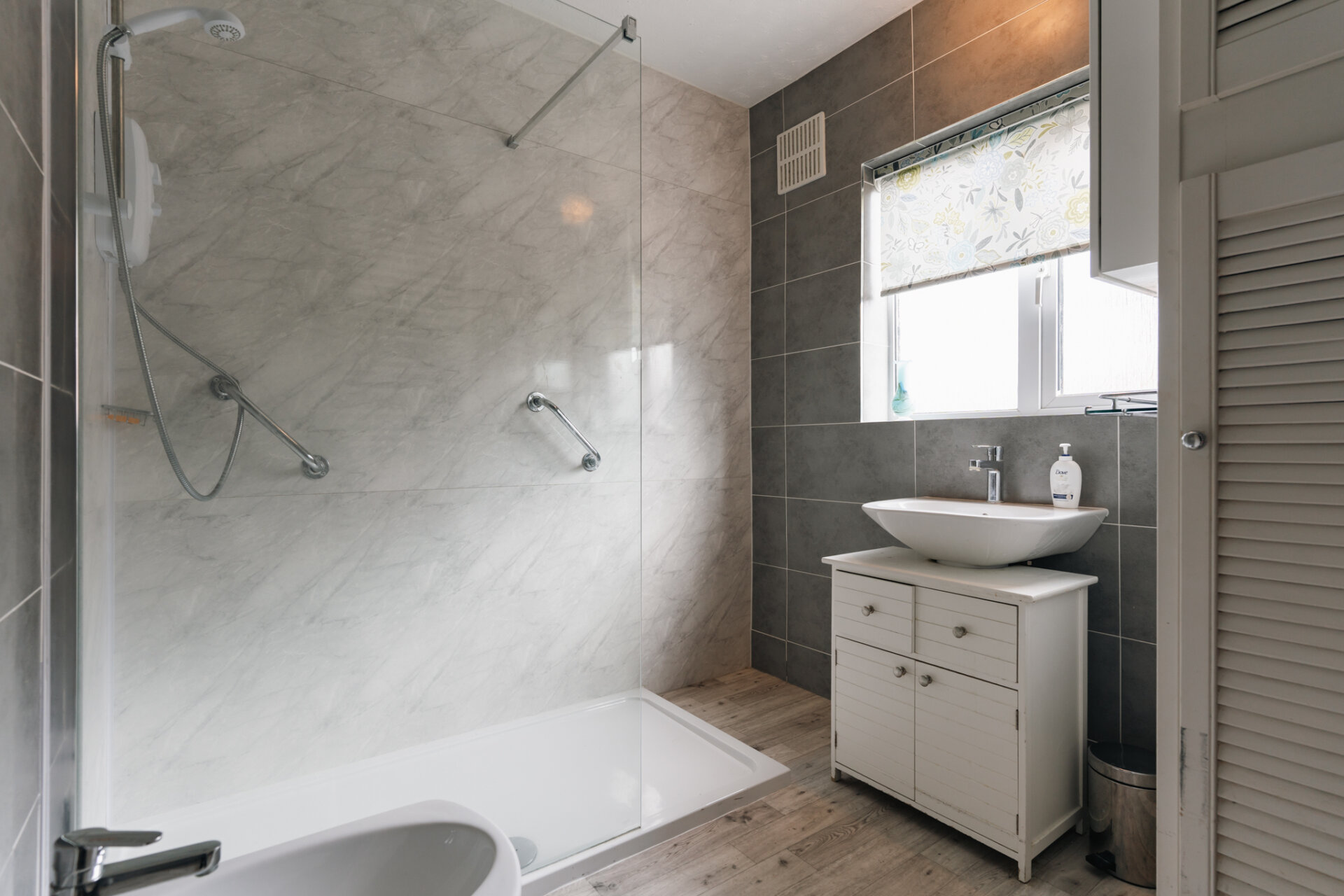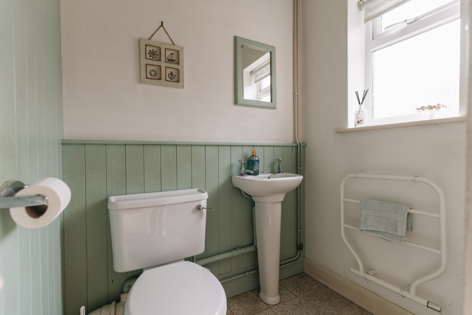 The bathroom has been refitted in more recent years and now comprises a double-width shower enclosure, pedestal wash basin and full-height tiling. A separate WC is accessed from the landing, maintaining a traditional yet practical layout.
