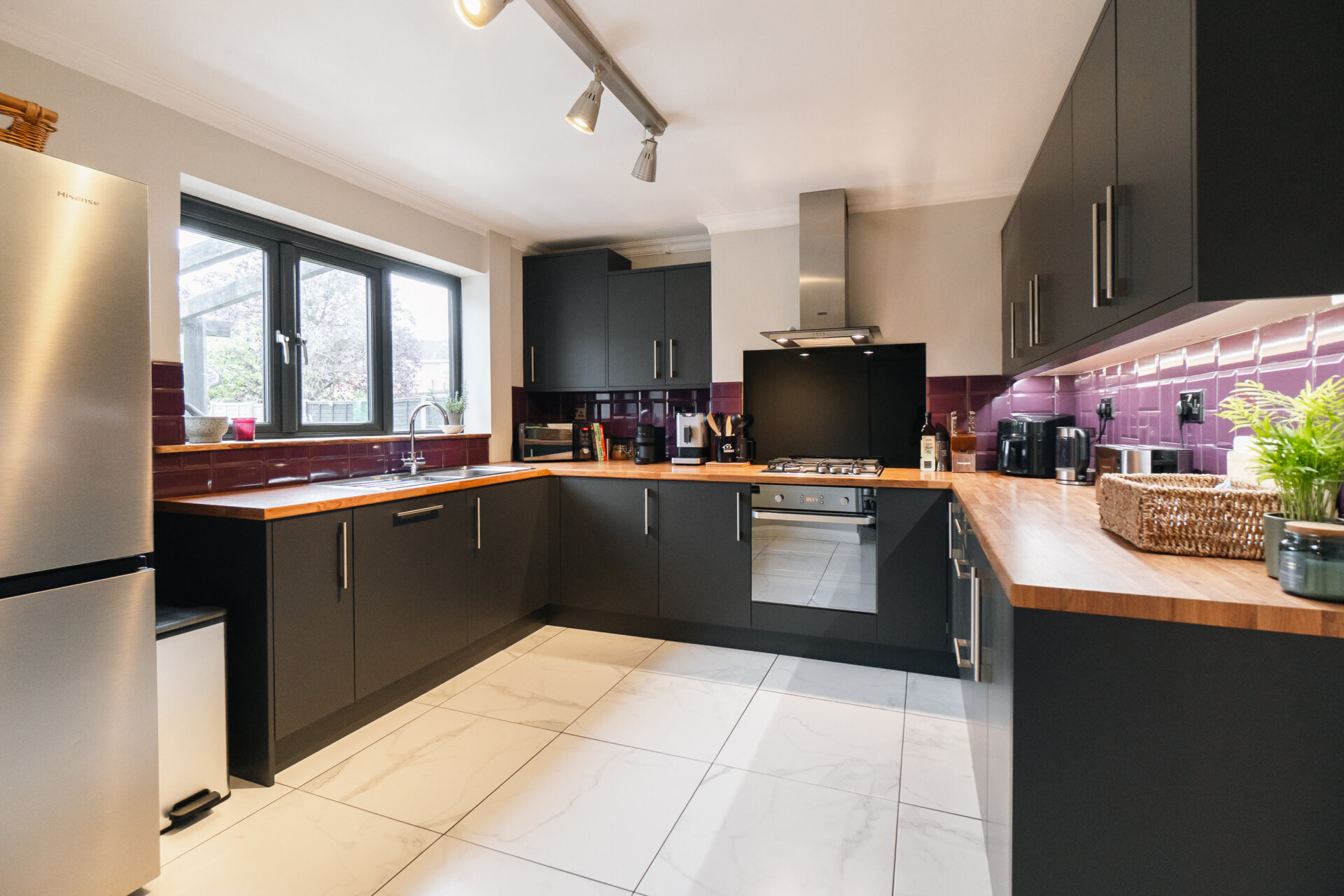 Upstairs, three substantial bedrooms are arranged around a light-filled landing. Each room is generous in proportion. The family bathroom continues the home’s contemporary feel.