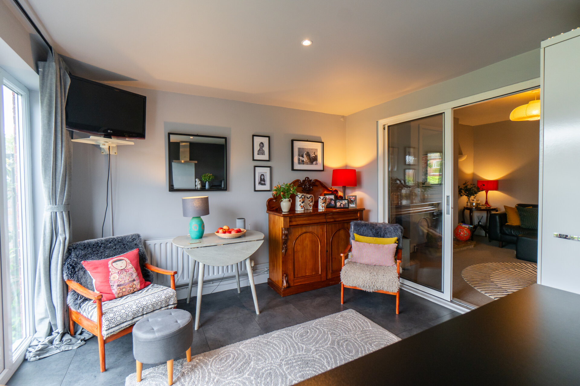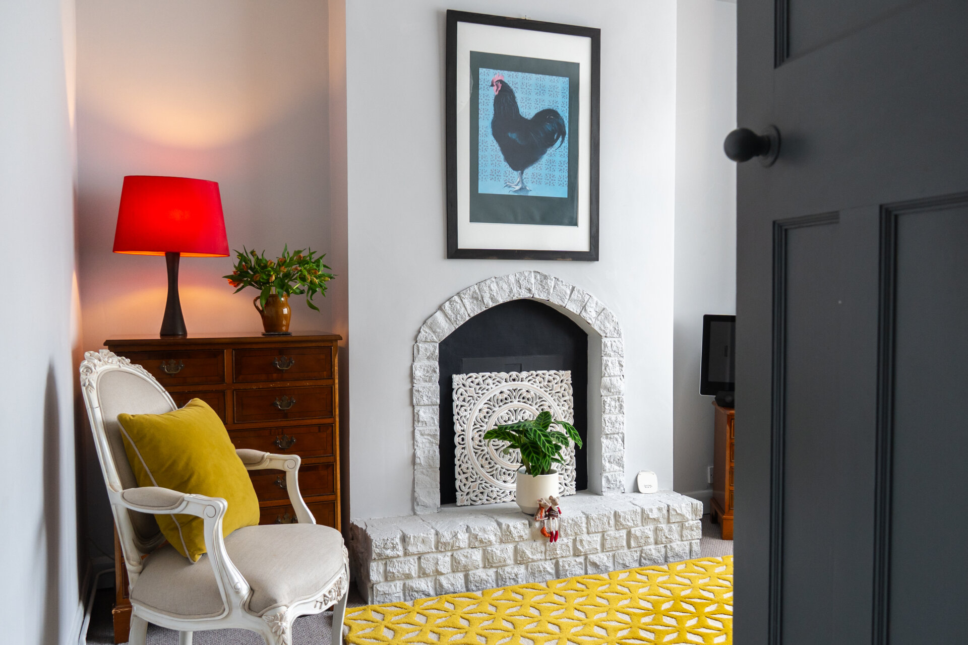 The approach is quietly striking, anchored by a black timber entrance door, with scope to introduce off-street parking for two vehicles. Inside, a generous hallway with restored oak flooring sets the tone, leading to two reception spaces that have been reimagined for modern living. To the front, a calm, light-filled room is centred around an exposed brick feature, offering texture and warmth. Beyond, a second reception room is more intimate in feel, subtly separated with glazed sliding doors to allow flexibility between open and closed living. The rear of the plan opens out into a carefully composed kitchen, dining and living space. Framed by views of the garden, this is a room designed for both everyday living and entertaining. Clean-lined cabinetry is paired with integrated appliances, while an L-shaped island introduces a social focal point with informal seating. There is ample room for a dedicated dining setting, and French doors extend the space outward, reinforcing the indoor–outdoor dialogue. A newly finished WC completes the ground floor.