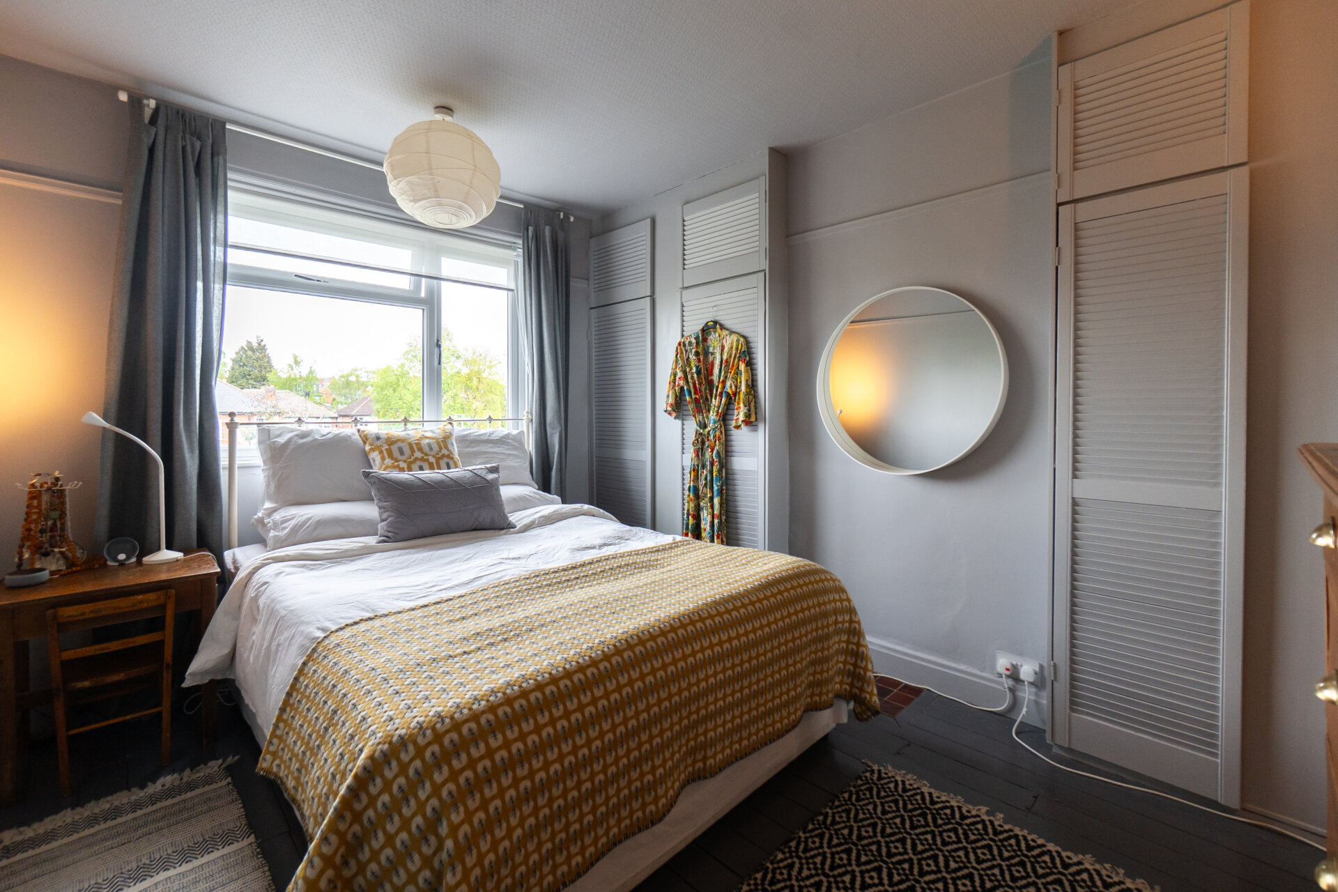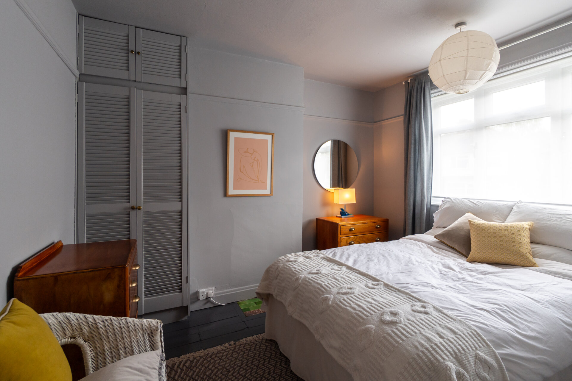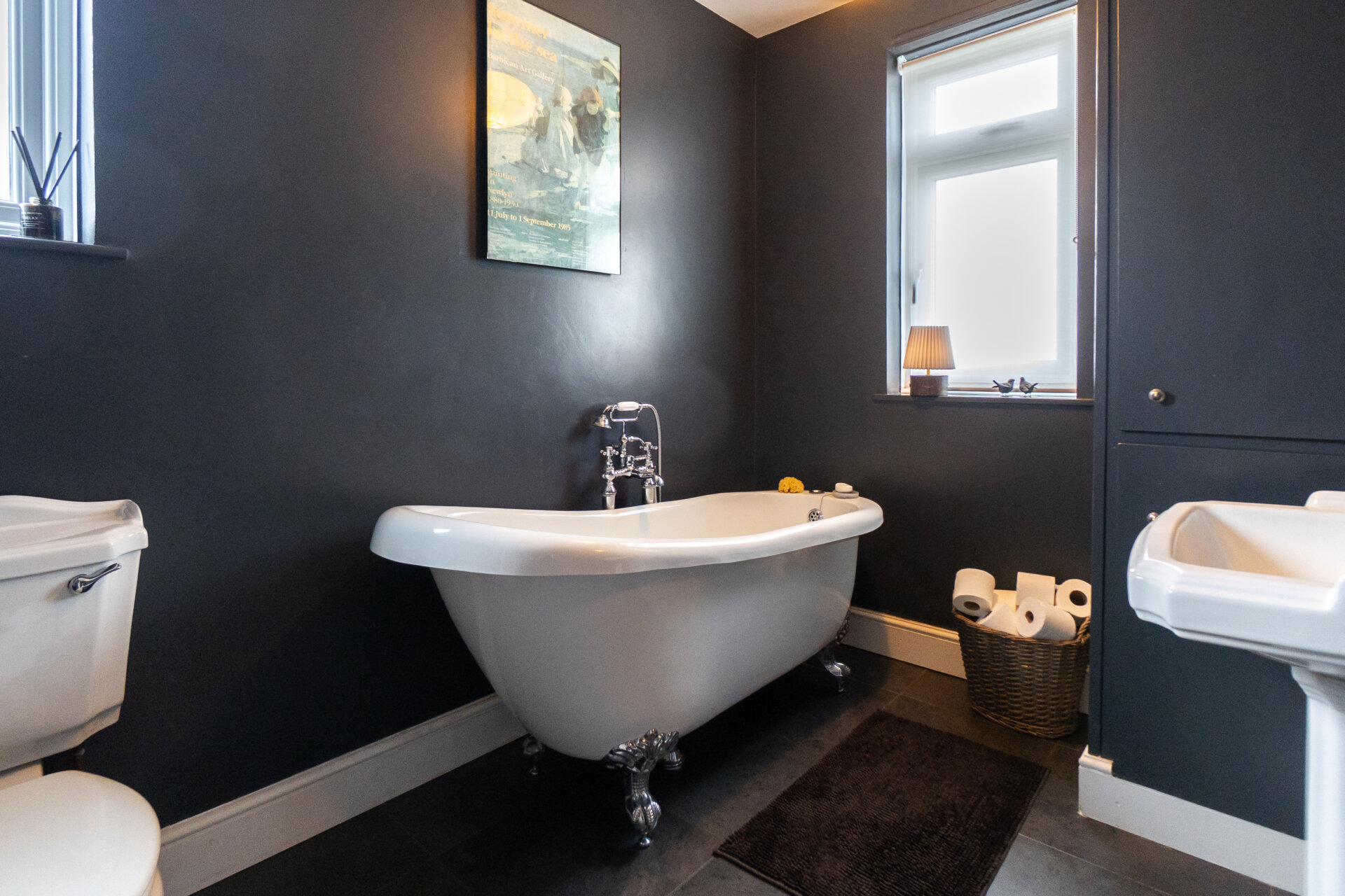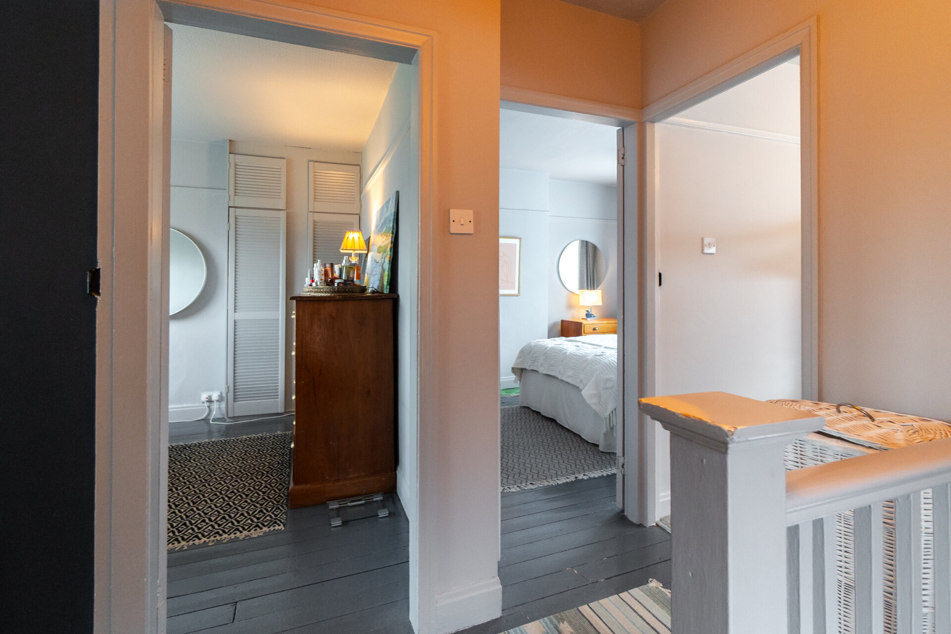 Upstairs, three bedrooms are arranged off a generous landing, two doubles and a single, each thoughtfully presented with built-in storage. A standout family bathroom introduces a more expressive design language, with a roll-top bath and a rich, moody palette that adds depth and contrast. Original timber flooring continues across this level, enhancing the home’s material continuity.