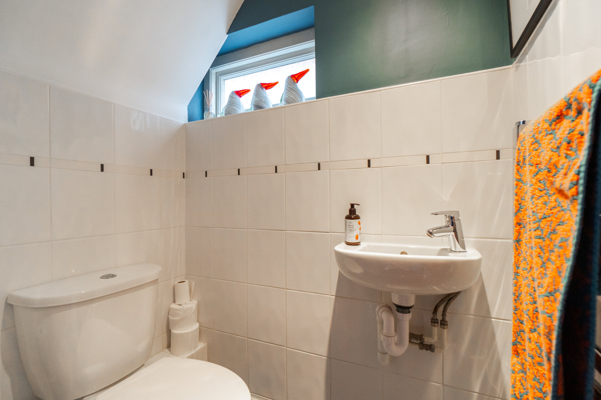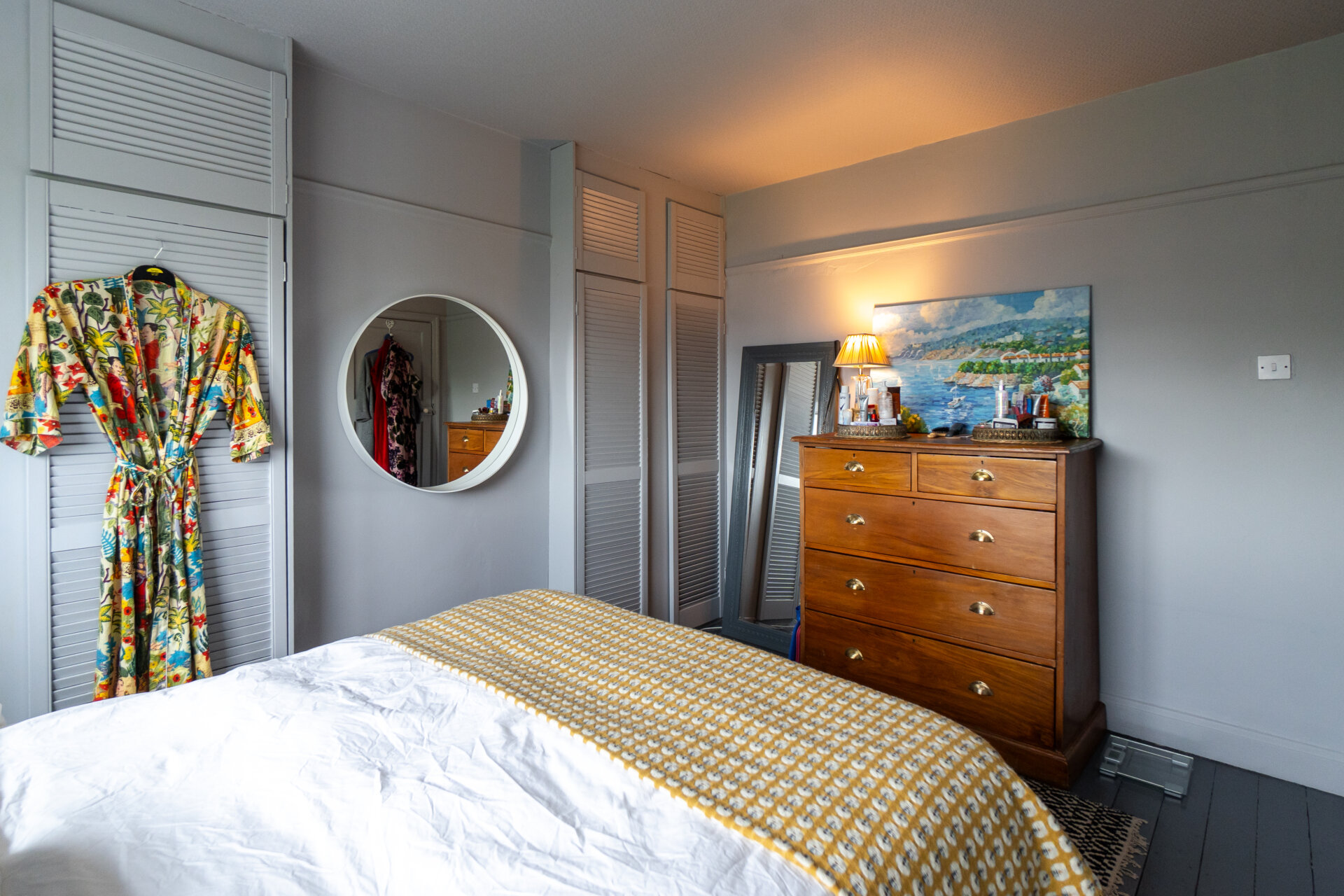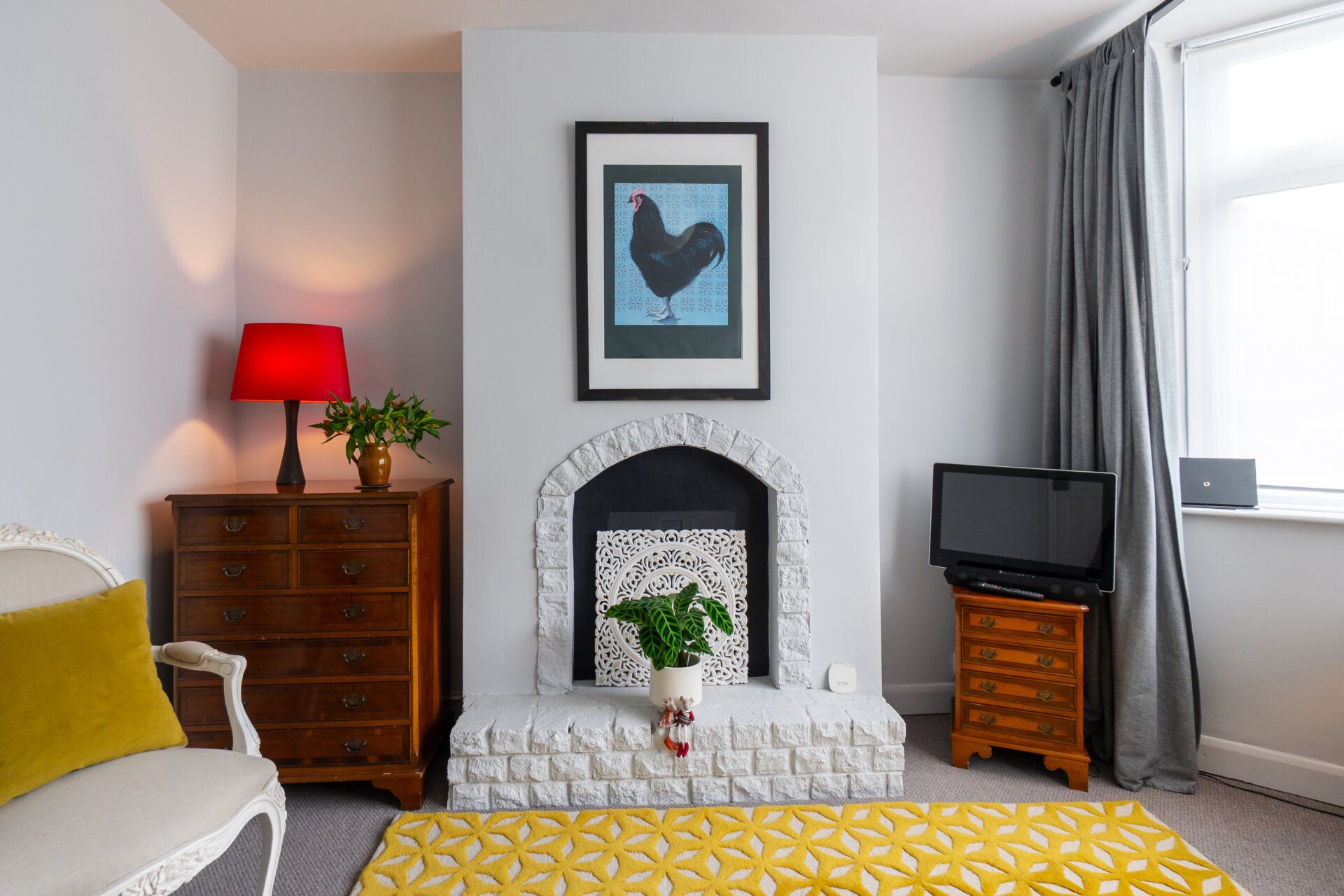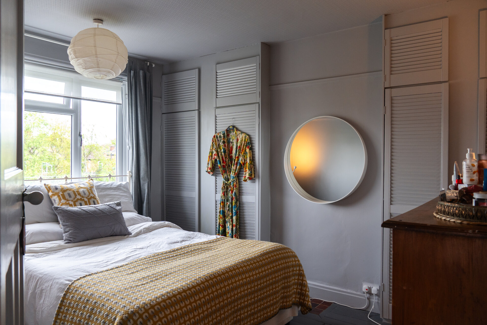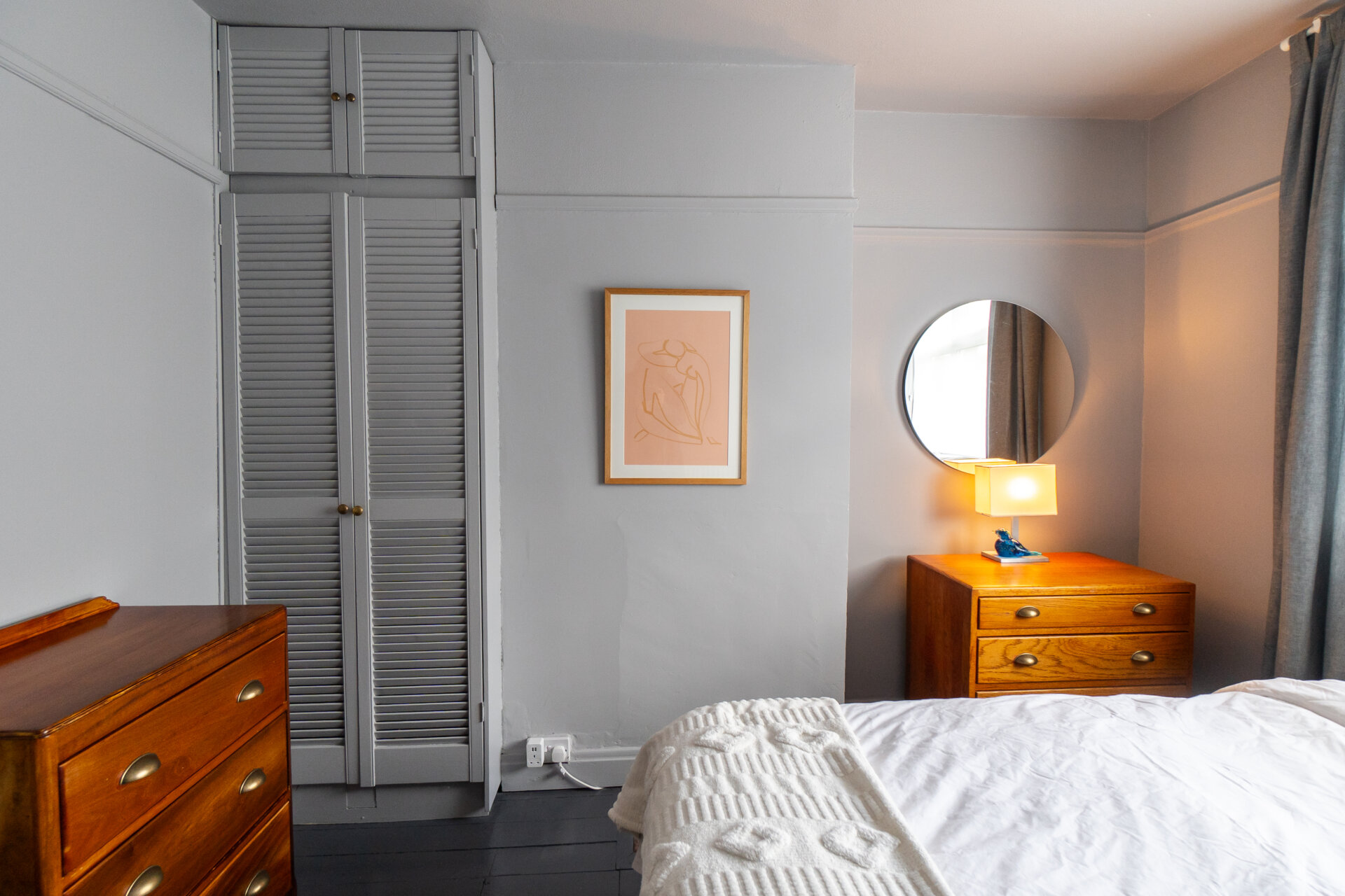 Upstairs, three bedrooms are arranged off a generous landing, two doubles and a single, each thoughtfully presented with built-in storage. A standout family bathroom introduces a more expressive design language, with a roll-top bath and a rich, moody palette that adds depth and contrast. Original timber flooring continues across this level, enhancing the home’s material continuity.