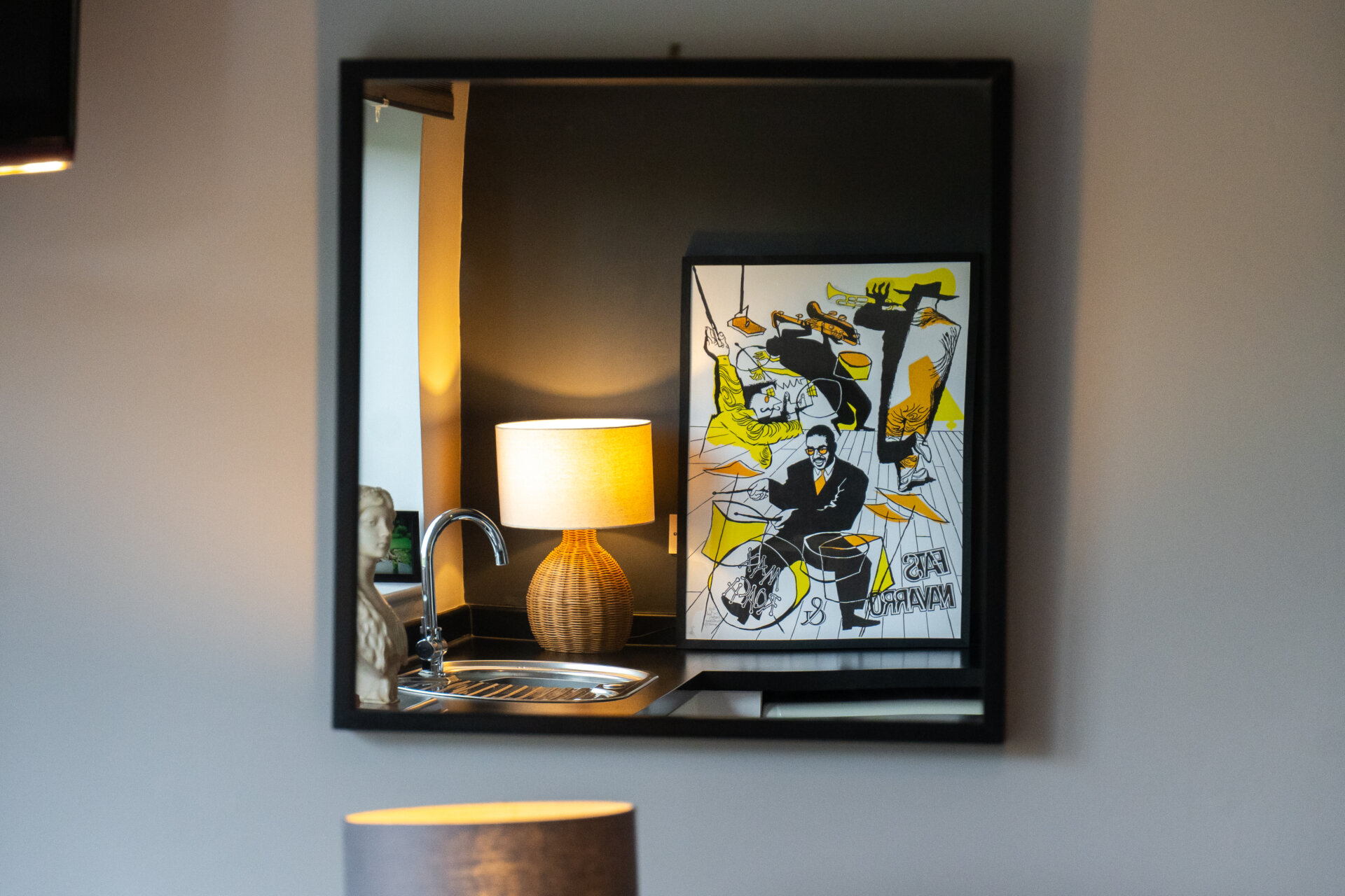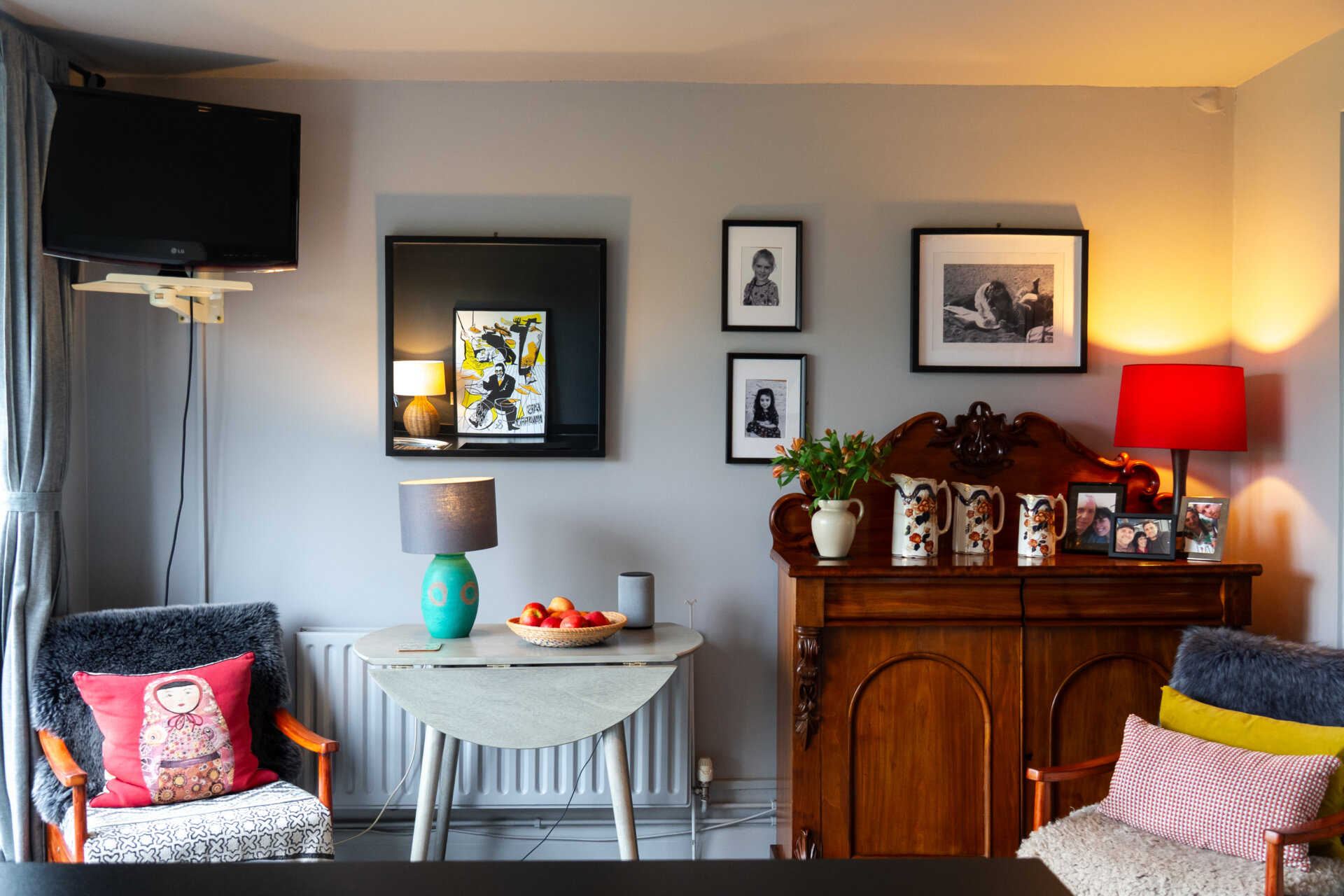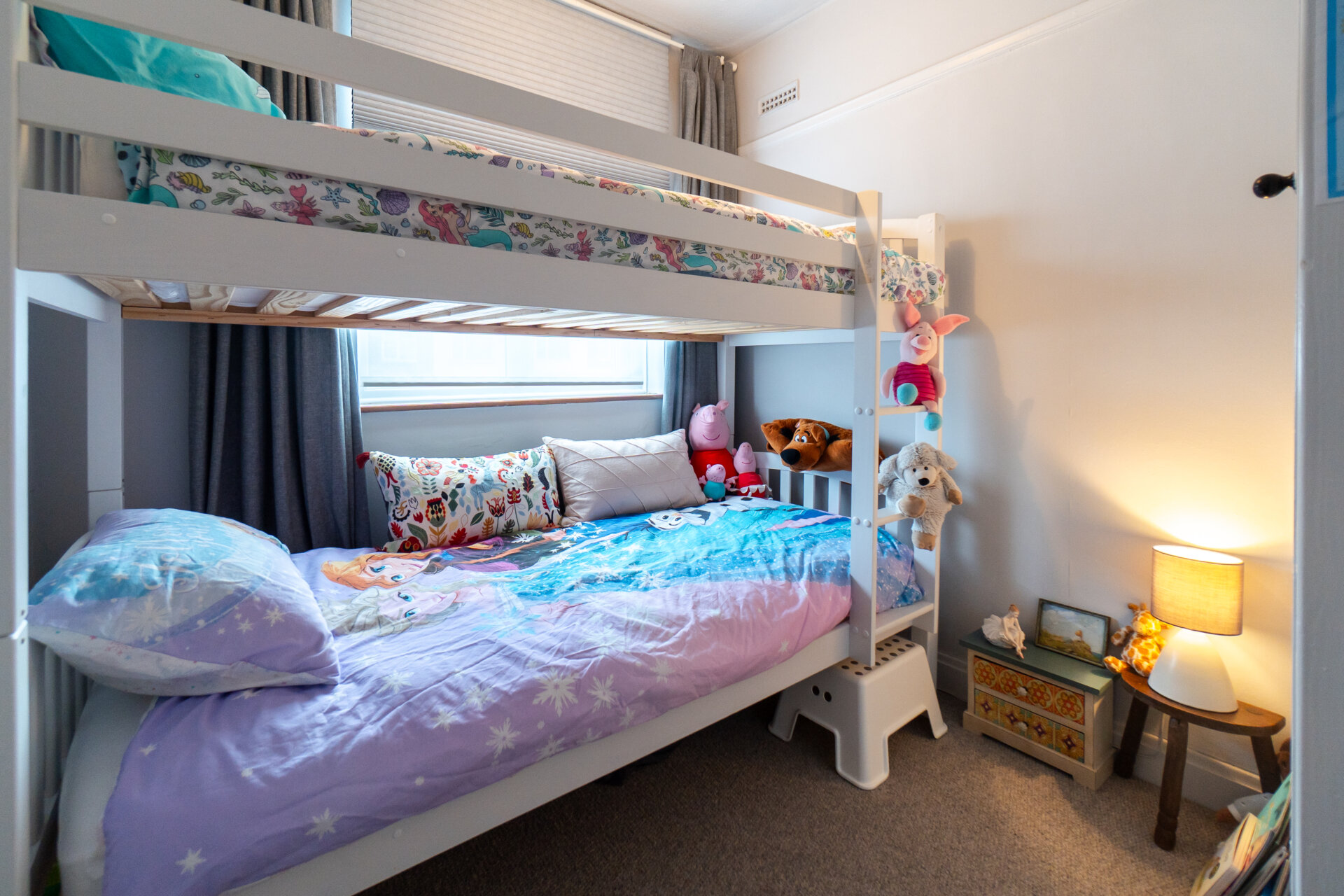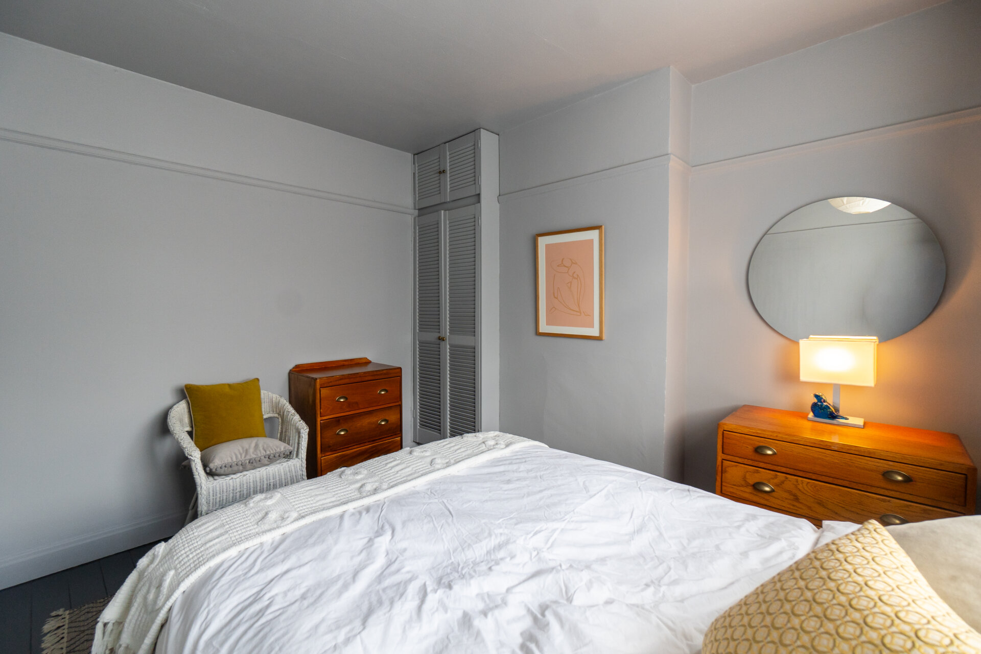 Upstairs, three bedrooms are arranged off a generous landing, two doubles and a single, each thoughtfully presented with built-in storage. A standout family bathroom introduces a more expressive design language, with a roll-top bath and a rich, moody palette that adds depth and contrast. Original timber flooring continues across this level, enhancing the home’s material continuity.